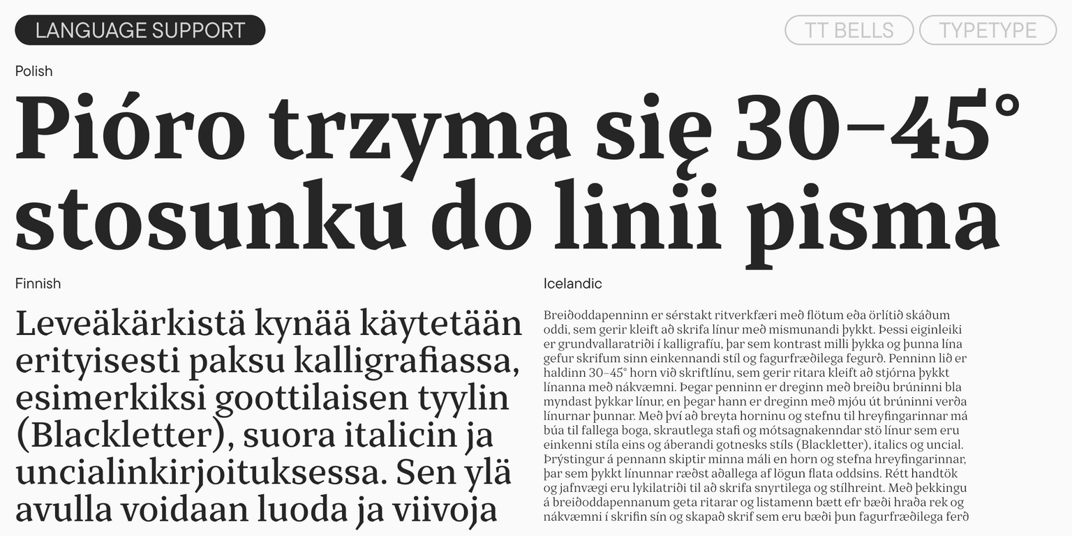 يناسب TT Bells العديد من الاستخدامات: يمكن اعتماده في العناوين البارزة كما يمكن استخدامه في النصوص الطويلة. وعند تصغير الحجم، تتراجع حدّته وجرأته تدريجيًا، ليكتسب مظهرًا أكثر كلاسيكية مع الحفاظ على وضوح ممتاز.