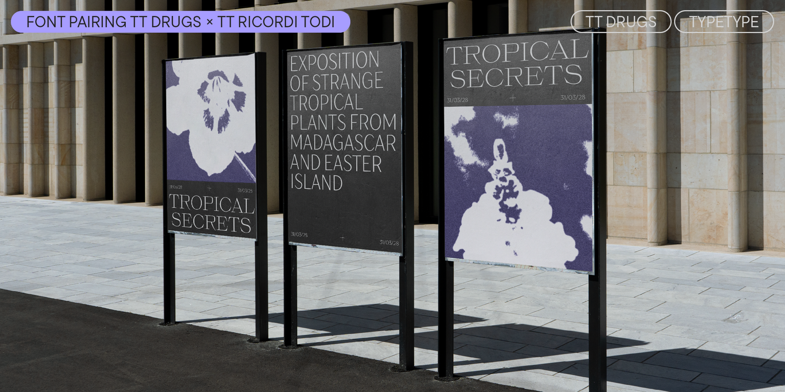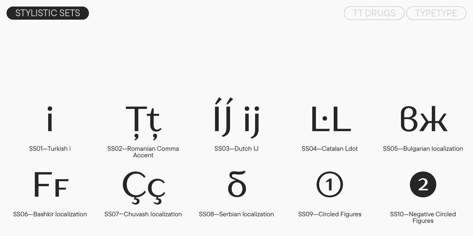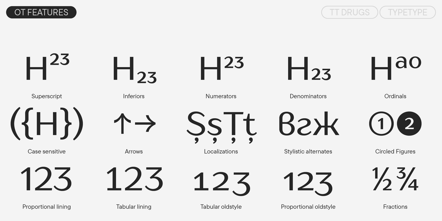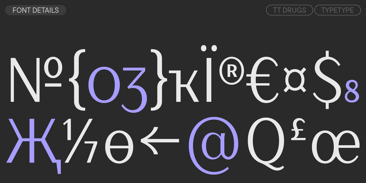 TT Drugs هو خط من نوع ” أنتيكوا الشريطية”: خط بدون الذنابات يتميز بتباين واضح. بفضل النهايات الضيقة، يبدو الخط أنيقًا ورقيقًا. من المثير للاهتمام أن الأجزاء العلوية من أعمدة الحروف مثل “n”، “m”، “p”، “q”، “r” والعناصر السفلية في الحروف “a” و”u” منحوتة قليلاً — هذه التفاصيل تمنح الخط طابعًا فريدًا وتضيف إليه لمسة من الرقي دون أن تفقده جديته.