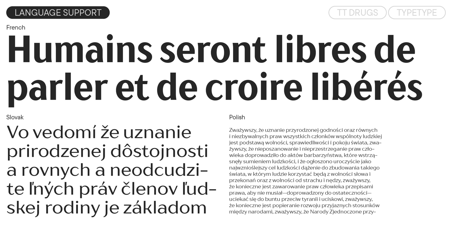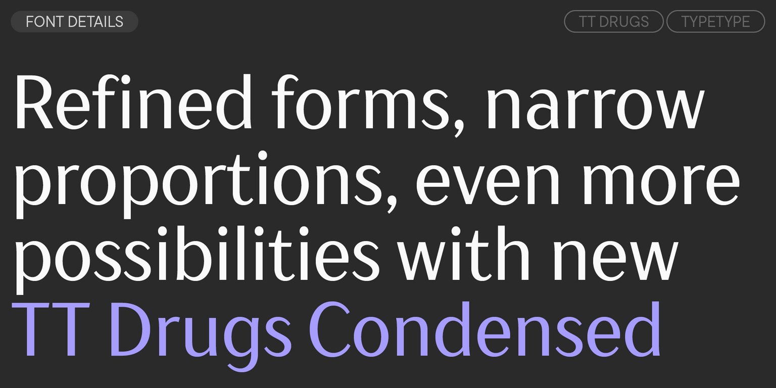 اسم الخط يشير إلى تاريخ إنشائه: فقد تم تصميم العائلة في البداية خصيصًا للاستخدام في صناعة الأدوية. ولكن في الواقع، أثبت الخط أنه أكثر تنوعًا بكثير ويمكن أن يندمج بسلاسة في مشاريع ذات موضوعات مختلفة تمامًا. وبعد التحديث، أصبح أكثر شمولية، حتى أن ماضيه الطبي لم يعد يذكّر به سوى اسمه الاستفزازي “TT Drugs”.