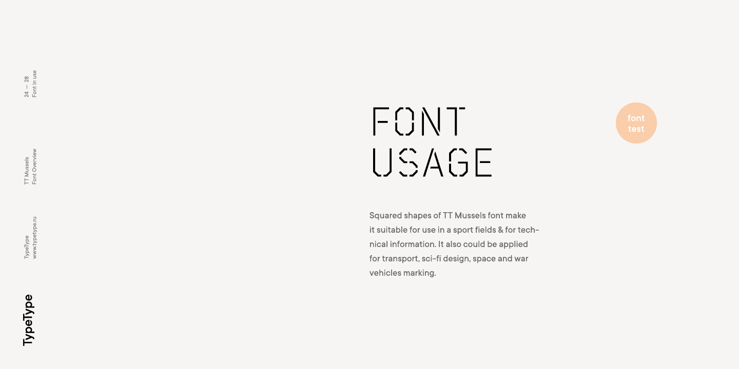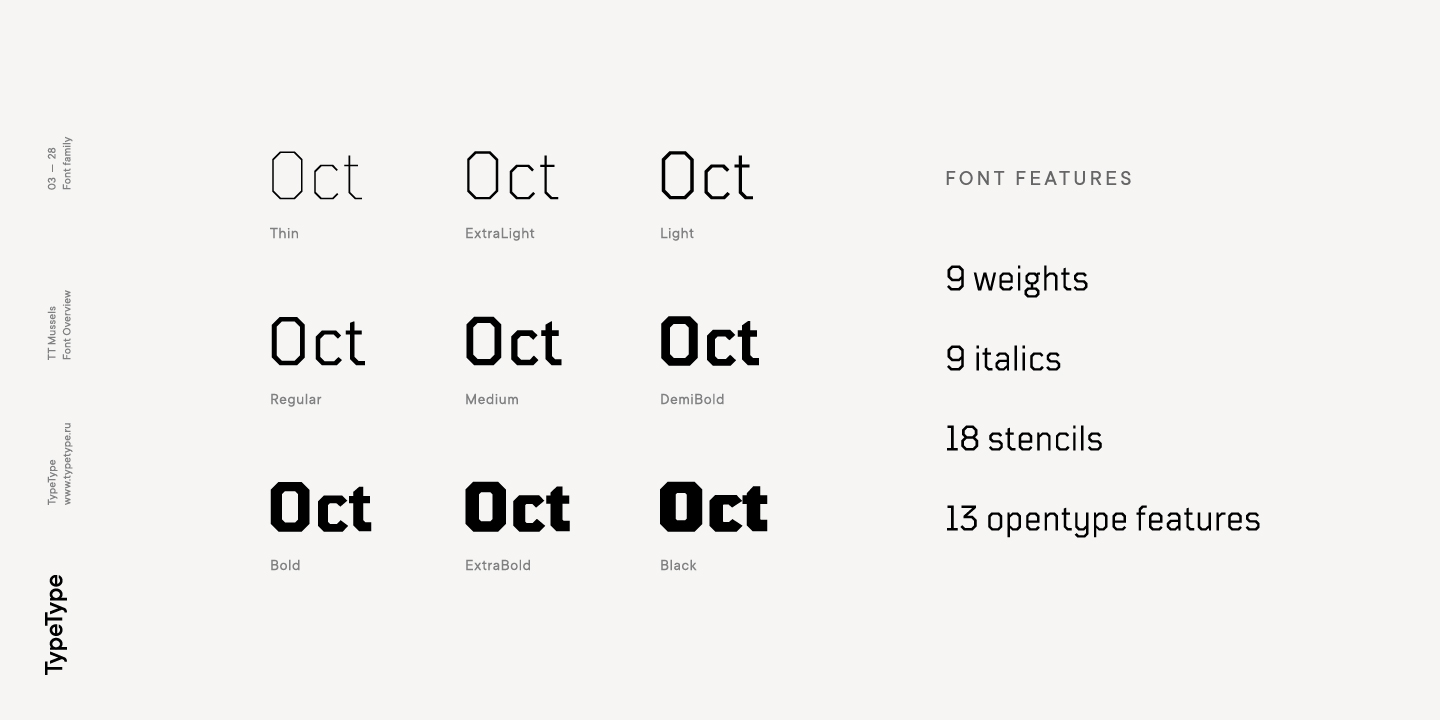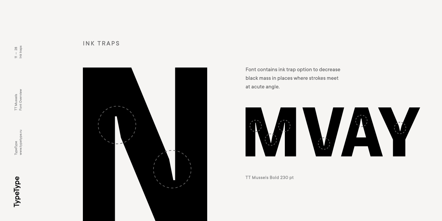 مجموعة من الخطوط TT Mussels هي الخلف الرسمي لخطوط شهيرة مثل Bender وTT Squares. ومع ذلك، تحتوي TT Mussels على عدد من الفروقات الجوهرية التي تجعلها عائلة فريدة تتميز بشكل كبير بين الخطوط المثمنة الزوايا. أثناء تصميم TT Mussels، تم التركيز بشكل كبير على إمكانية استخدامها لتنسيق كتل نصية كبيرة، ويمكننا بثقة القول إن TT Mussels هي من الخطوط النادرة التي تجمع بين التكنولوجيا والقدرة على العمل كنصوص طويلة.