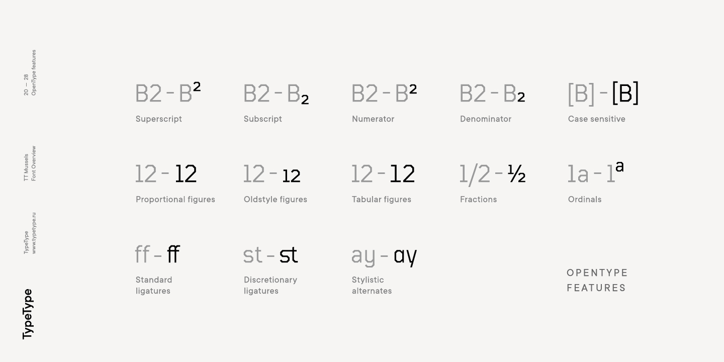 بالإضافة إلى ذلك، تم إنتاج نسخة مخصصة من الخط بأسلوب الستينسل (stencil)، حيث تتغير أماكن القطع بناءً على سمك النمط. في المجمل، تتكون مجموعة الخطوط TT Mussels من 36 نمطًا، تتضمن بدائل أسلوبية، روابط (ligatures)، ودعمًا واسعًا لميزات OpenType مثل: case، frac، ordn، sups، sinf، numr، dnom، onum، tnum، pnum، liga، dlig، salt، ss01.”
