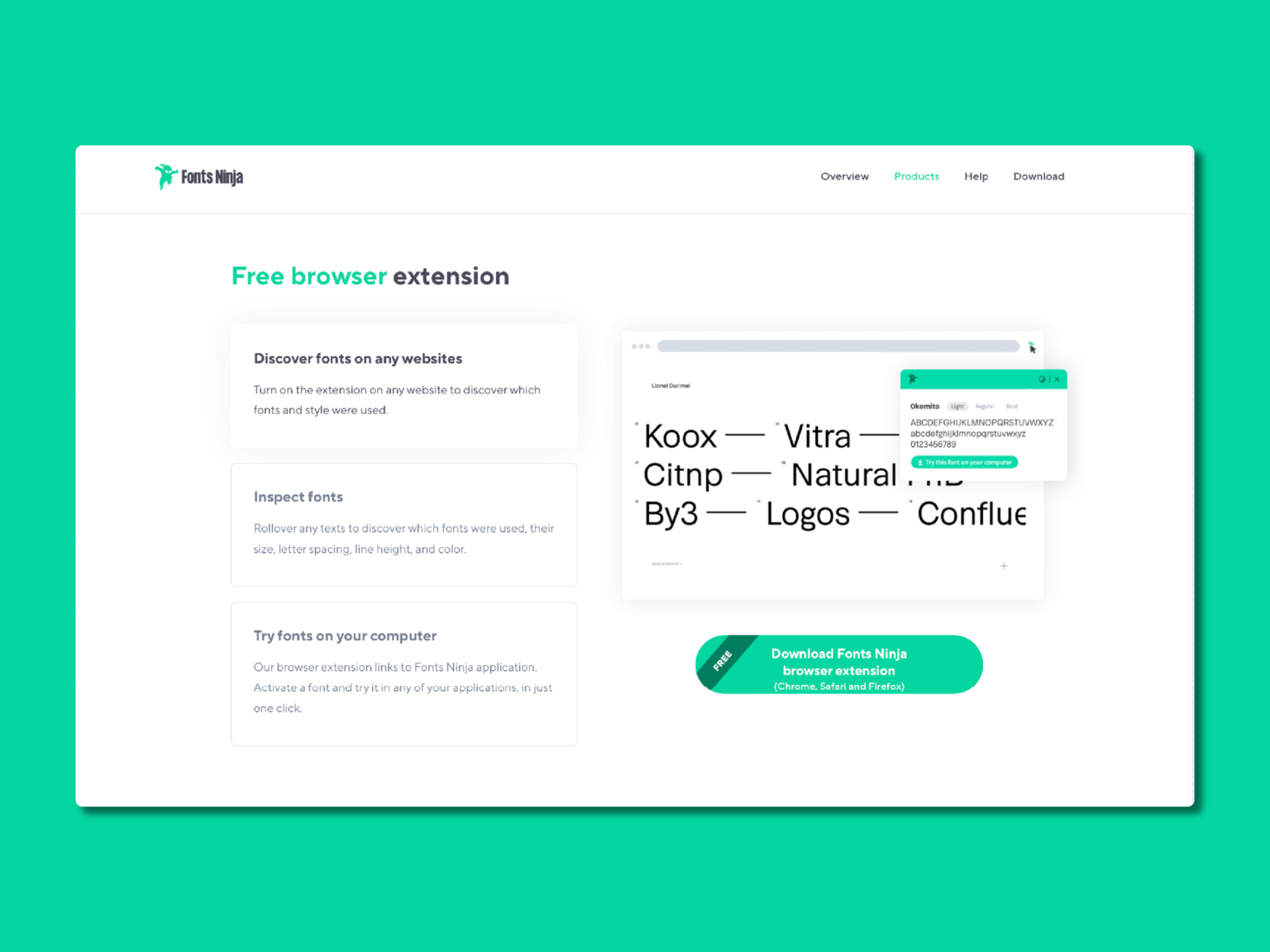 Fonts Ninja ist ein Entwickler einer Webbrowser-Erweiterung und einer Schriftanwendung zur Verbesserung von Arbeitsabläufen, bei denen Schriftarten eine Rolle spielen. Fonts Ninja entwickelt Lösungen für alle, die auf der Suche nach neuen Schriften sind, ihre Schriftenbibliothek verwalten wollen oder sich um die Lizenzierung von Schriften kümmern.