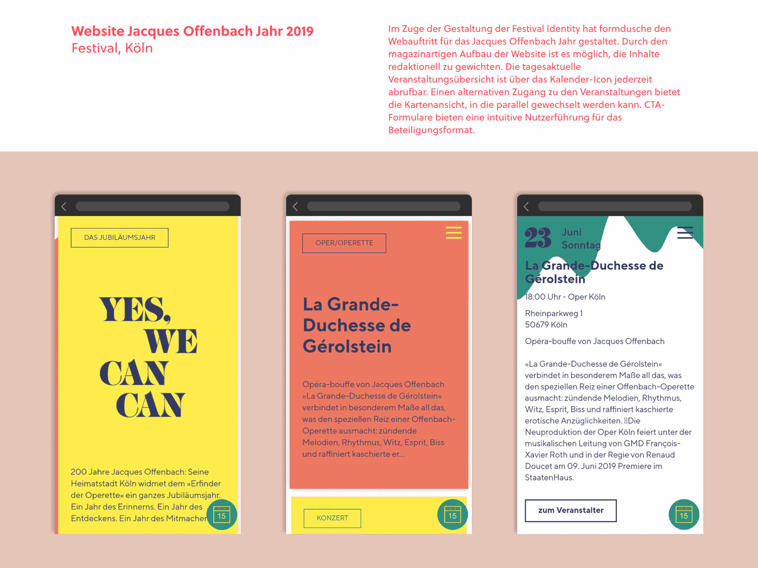 Im Rahmen der Corporate-Identity-Entwicklung des Formdusche-Festivals wurde auch eine Website für das Jacques-Offenbach-Jahr entwickelt. Die journalistische Struktur der Website ermöglicht es, die Inhalte redaktionell aufzubereiten und über ein Kalender-Icon jederzeit einen Überblick über die täglichen Veranstaltungen zu erhalten. Eine gleichzeitig aufrufbare Kartenansicht bietet einen alternativen Zugang zu den Veranstaltungen und eine intuitive Benutzerführung zum Beteiligungsformat.