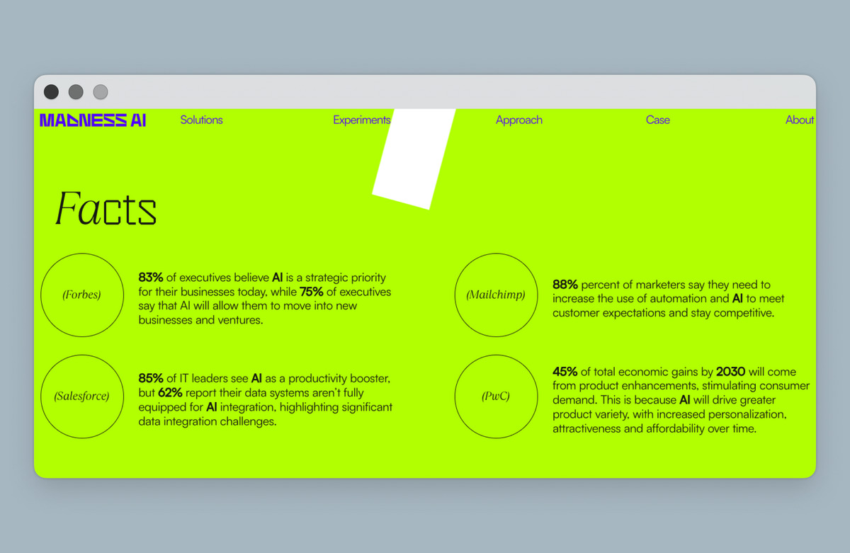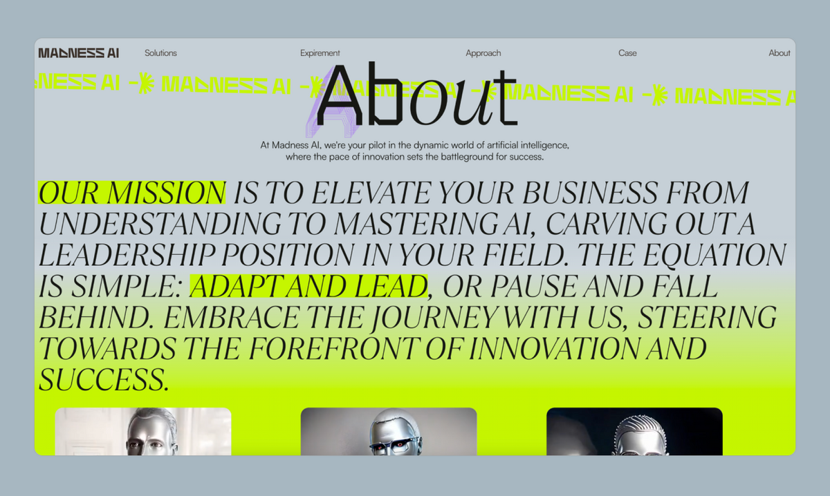 Folgen Sie dem Link: Madness AI Inc.Auf dieser Seite finden Sie eine ständig aktualisierte Sammlung von Beispielen für TypeType-Schriften im Einsatz. Hier können Sie sich von schönen Bildern inspirieren lassen oder eine Schrift, die Ihnen gefällt, mit den Augen eines anderen Designers betrachten. Senden Sie Ihre Projekte mit unseren Schriftarten an marketing@typetype.org. Die besten Fälle werden auf dieser Seite veröffentlicht!