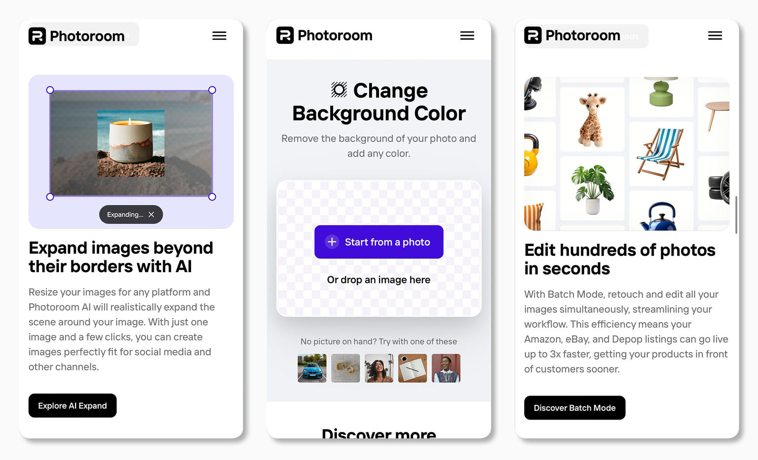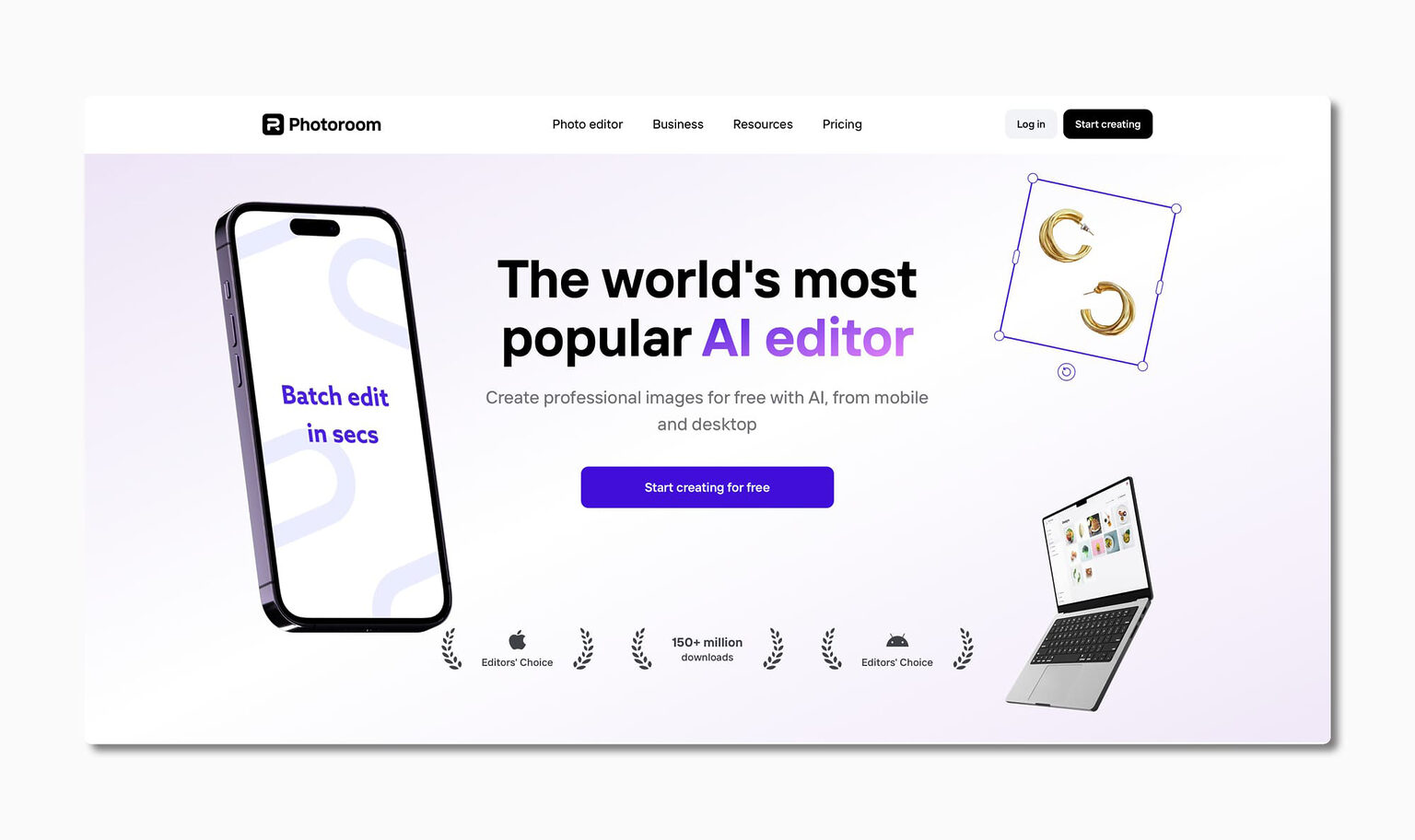Photoroom ist ein Fotobearbeitungsprogramm, mit dem Sie in Sekundenschnelle realistische Hintergründe in Studioqualität für Ihre Produktbilder erstellen, die Größe von Bildern für jede Plattform ändern, Unvollkommenheiten mit dem Retuschierwerkzeug sofort wegwischen und den Raum mit neuen Elementen mit Photoroom AI Fill füllen können.