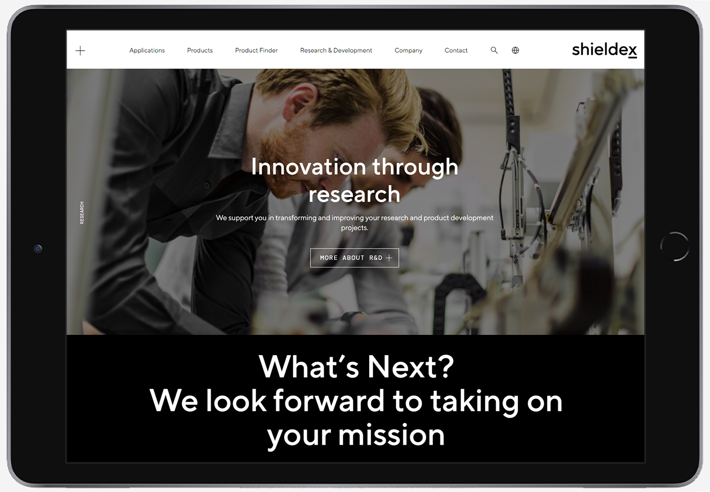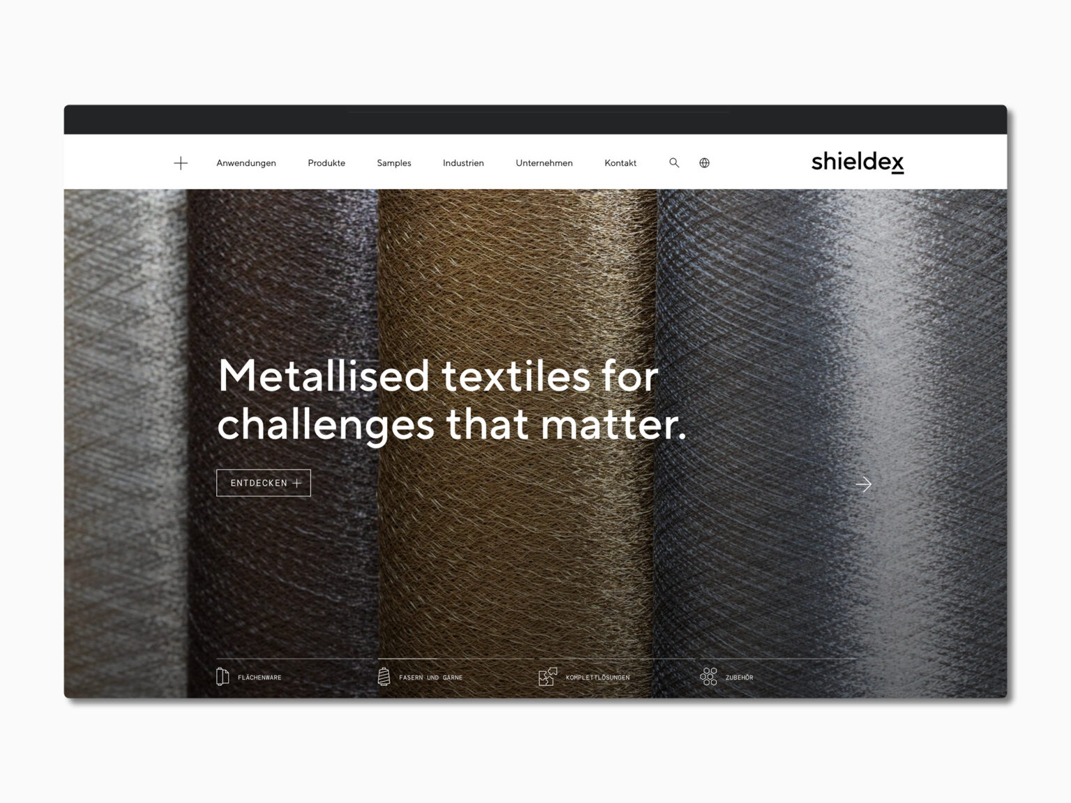 Schriftart für die Website. Shieldex ist der führende Hersteller von metallisierten Textilien mit Produktionsstandort in Bremen, Deutschland