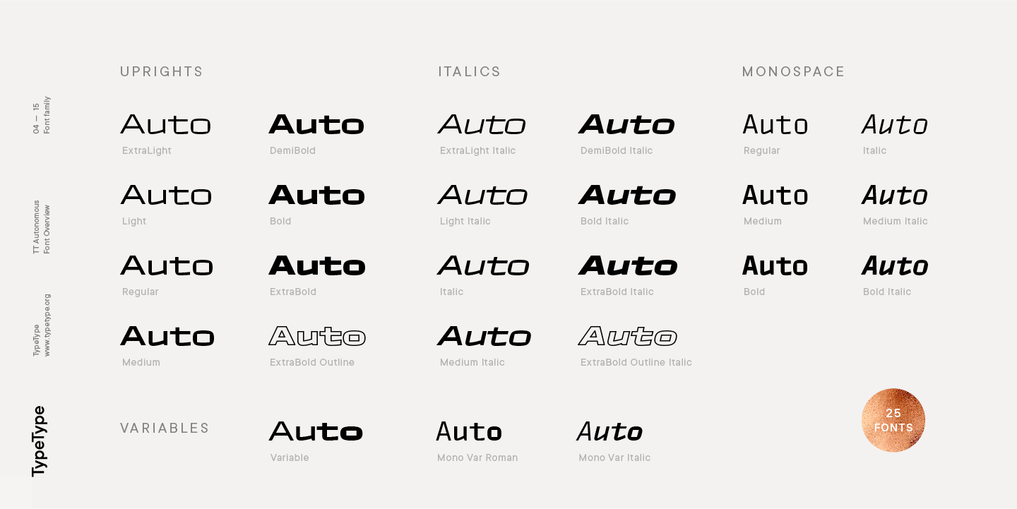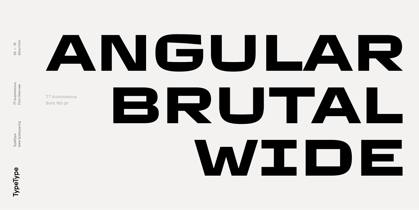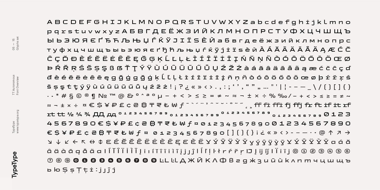 TT Autonomous ist eine komplexe Schriftfamilie, die aus 32 Schriften besteht, die ein breites Spektrum von Designaufgaben lösen sollen. Insgesamt umfasst die Schriftfamilie 14 reguläre Stile, 6 monospaced Stile, 7 reversed Stile, 2 Outline Stile und 3 variable Schriften. Die Anzahl der Glyphen variiert zwischen 630+ in der Monospaced-Schrift und 790+ in den Basisschriften. Die Unterfamilie Basic verfügt über Alternativzeichen, Ligaturen, Mediävalziffern, Nullen mit Schrägstrich und viele andere nützliche Funktionen.