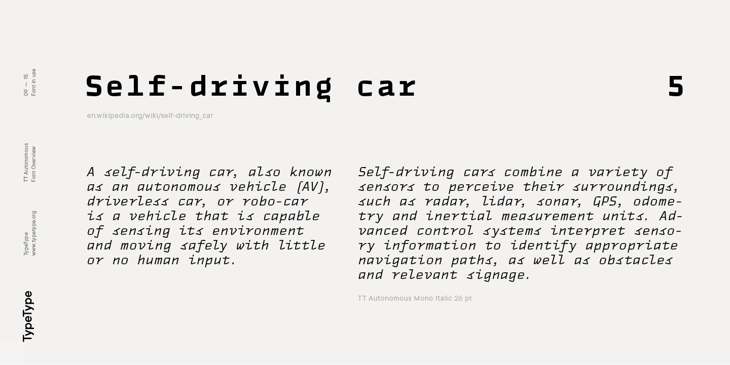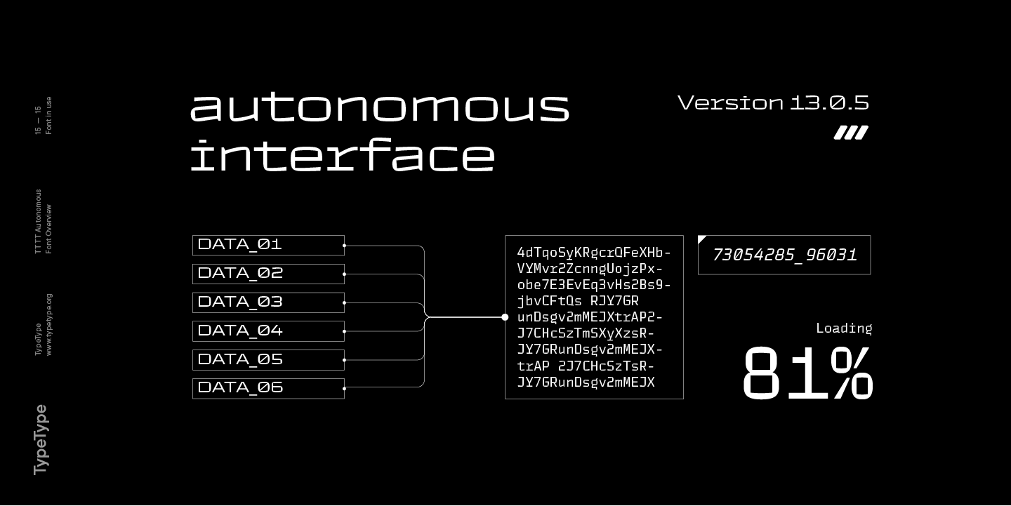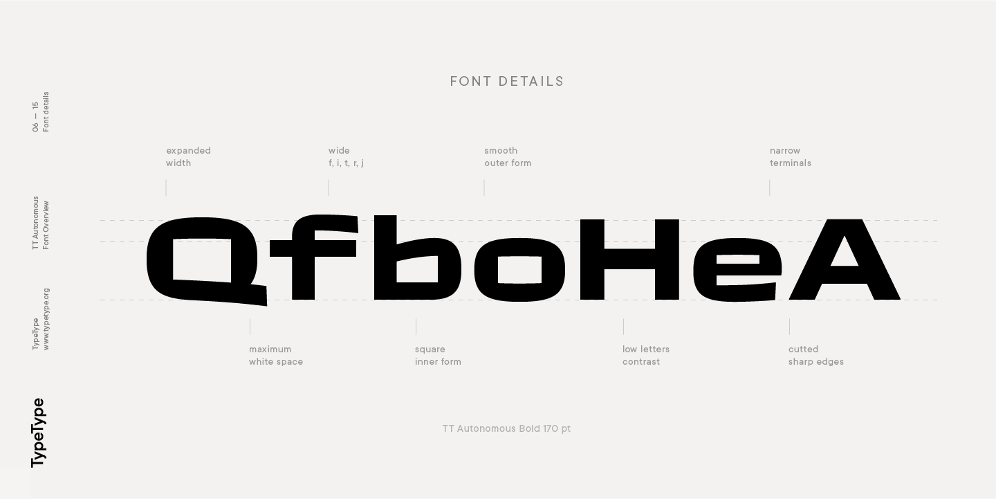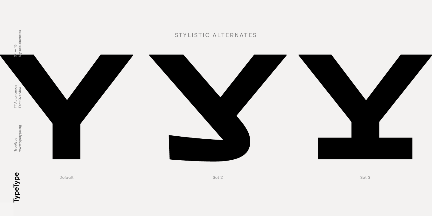 TT Autonomous ist eine komplexe Schriftfamilie, die aus 32 Schriften besteht, die ein breites Spektrum von Designaufgaben lösen sollen. Insgesamt umfasst die Schriftfamilie 14 reguläre Stile, 6 monospaced Stile, 7 reversed Stile, 2 Outline Stile und 3 variable Schriften. Die Anzahl der Glyphen variiert zwischen 630+ in der Monospaced-Schrift und 790+ in den Basisschriften. Die Unterfamilie Basic verfügt über Alternativzeichen, Ligaturen, Mediävalziffern, Nullen mit Schrägstrich und viele andere nützliche Funktionen.