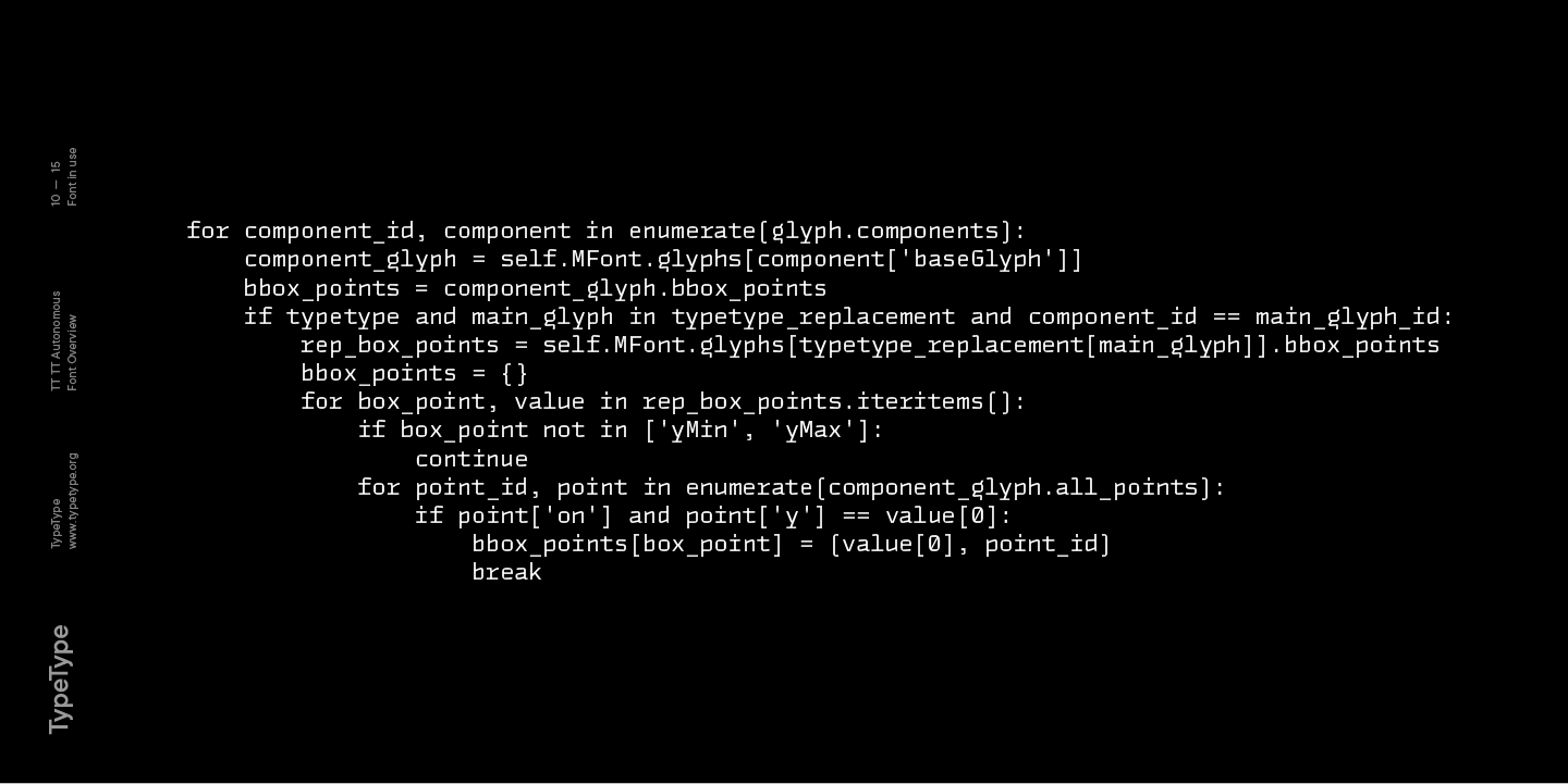 Wir konnten die Tatsache nicht außer Acht lassen, dass Codezeilen in Software für autonome Autos traditionell mit Monospaced-Schriften geschrieben werden, und fügten der Schrift TT Autonomous eine spezielle Monospaced-Unterfamilie hinzu. Dank der Rechteckigkeit der Zeichen, die von der Hauptfamilie übernommen wurde, und der echten Monospaced-Eigenschaften sind die Zeichenformen in der Unterfamilie sehr spezifisch und interessant geworden. Dies gilt insbesondere für die schrägen Monospaced-Schriften, die echte Kursivschriften sind.