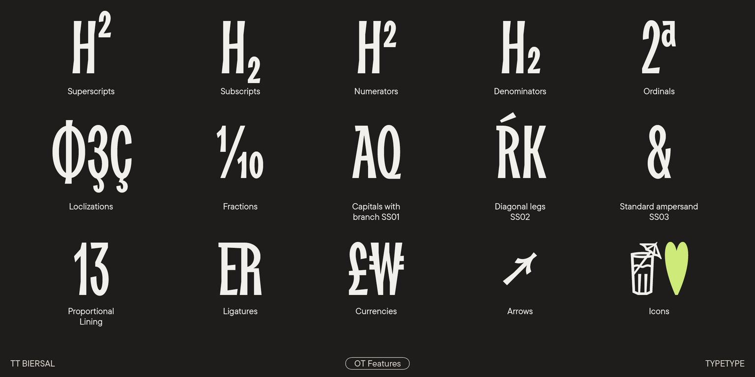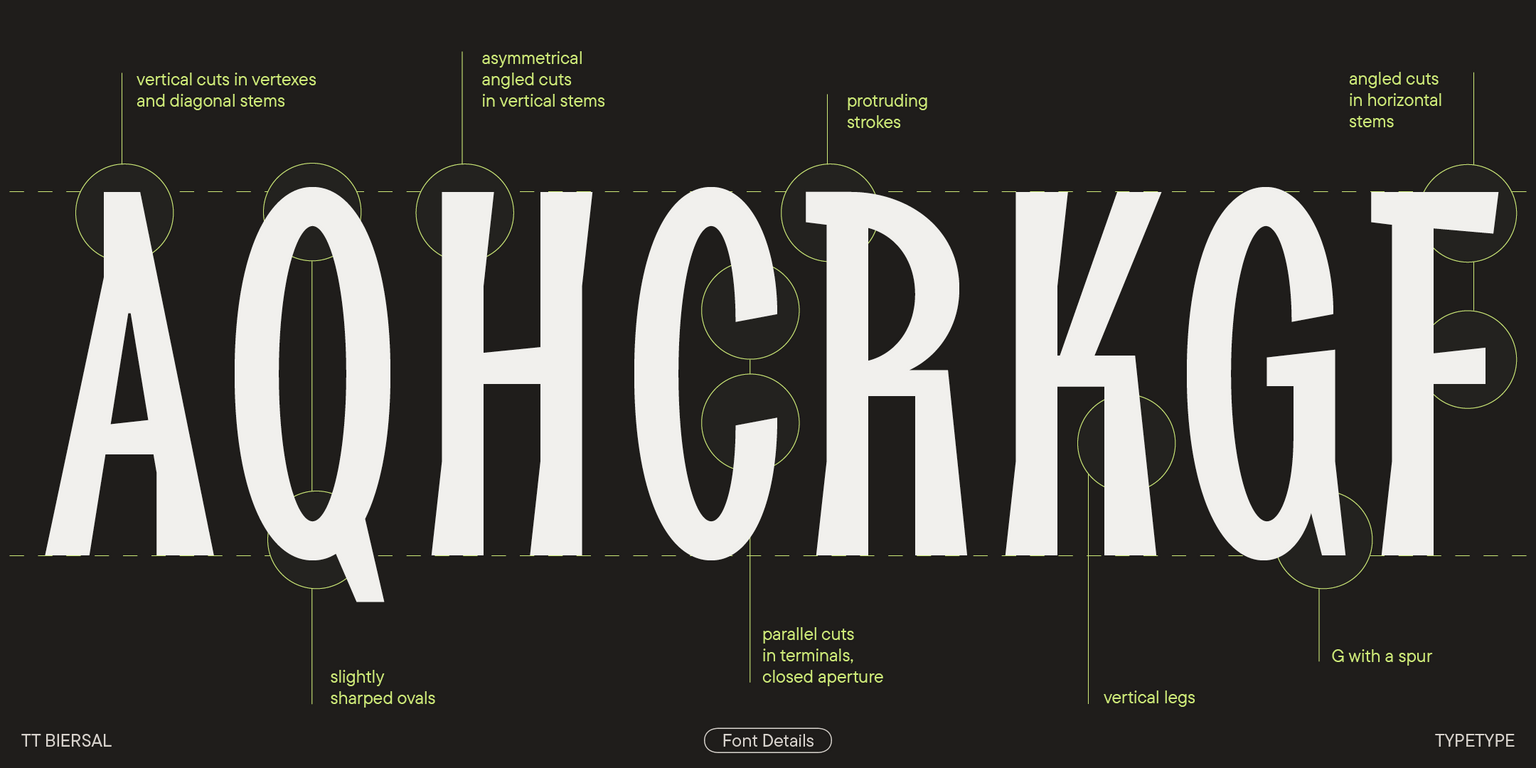 Die Hauptmerkmale von TT Biersal sind asymmetrische, schräge Schnitte in quadratischen und diagonalen Buchstaben. Sie verleihen der Schriftart eine handgemachte Anmutung, als hätte jemand kleine Stücke aus Papier, Glas oder Stein ausgeschnitten und zu einer modularen Collage zusammengefügt. Unkonventionelle parallele Schnitte in den Enden runder Buchstaben lassen die Anordnung dynamisch wirken. Einige Buchstaben, wie «E», «P» und «B», weisen leichte Verlängerungen auf, als ob die Striche bei schnellem Schreiben über die vertikalen Stämme hinausgingen. Außerdem sind die Ovale spitz zulaufend, um den scharfen Winkeln der quadratischen Zeichen zu entsprechen.