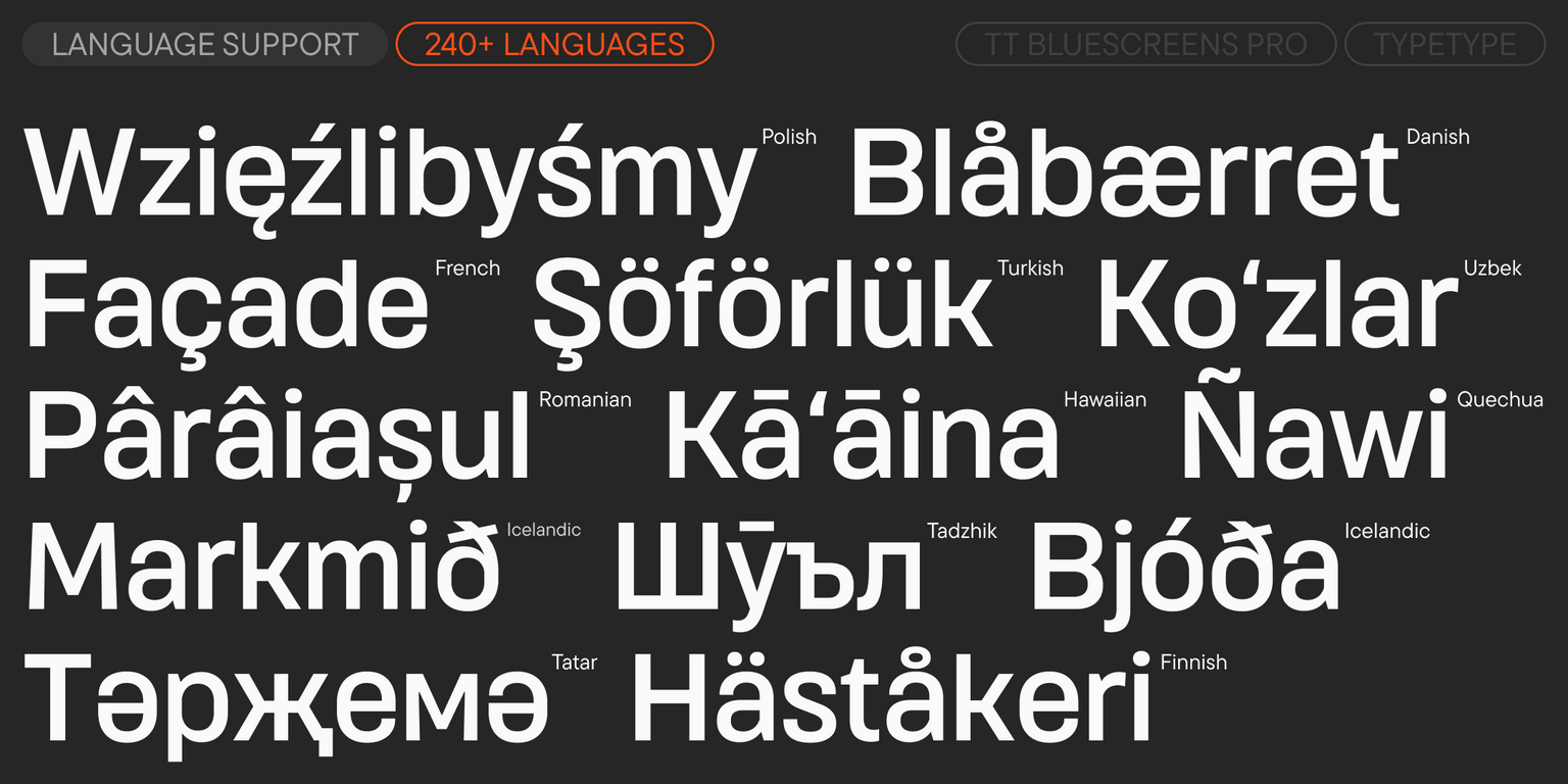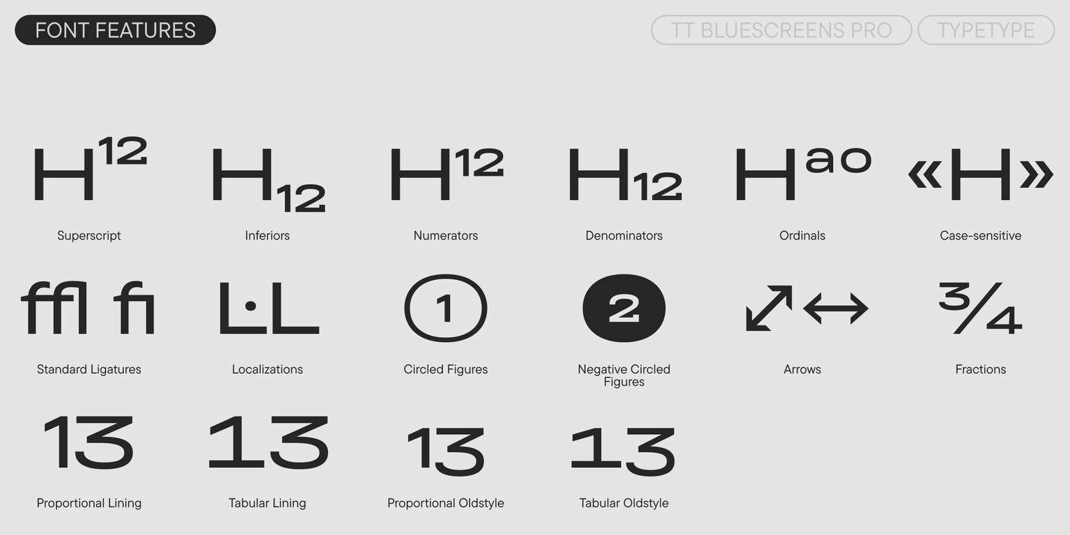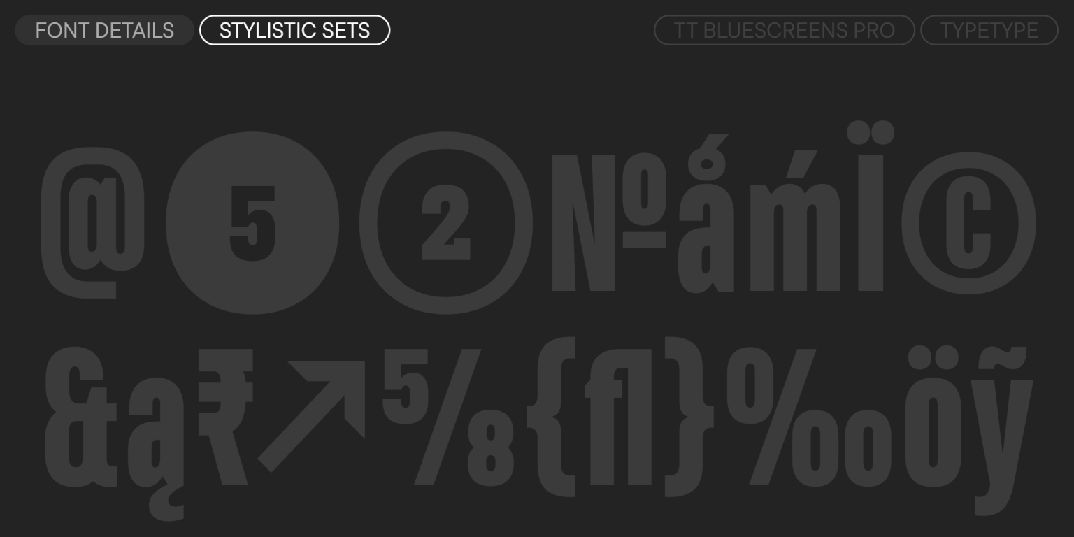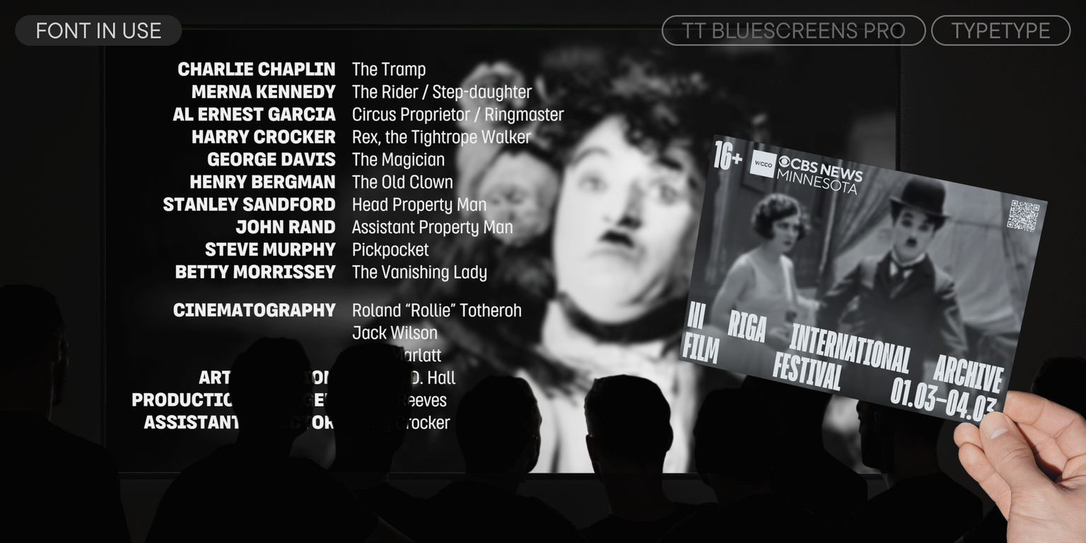 TT Bluescreens Pro ist eine modulare Sans Serif mit einem markanten Charakter. Im Jahr 2015 haben wir diese Schriftart speziell für Filmplakate und Abspänne entwickelt, und ihre schmalen Proportionen waren ihr charakteristisches Merkmal. Im Laufe der Zeit hat sich TT Bluescreens jedoch weiterentwickelt und ist vielseitiger und funktionaler geworden. Im Jahr 2023 haben wir die dritte Version der Schriftart veröffentlicht, die wir um eine noch schmalere Unterfamilie und erweiterte kyrillische Unterstützung ergänzt haben. Dennoch haben wir dort nicht aufgehört.