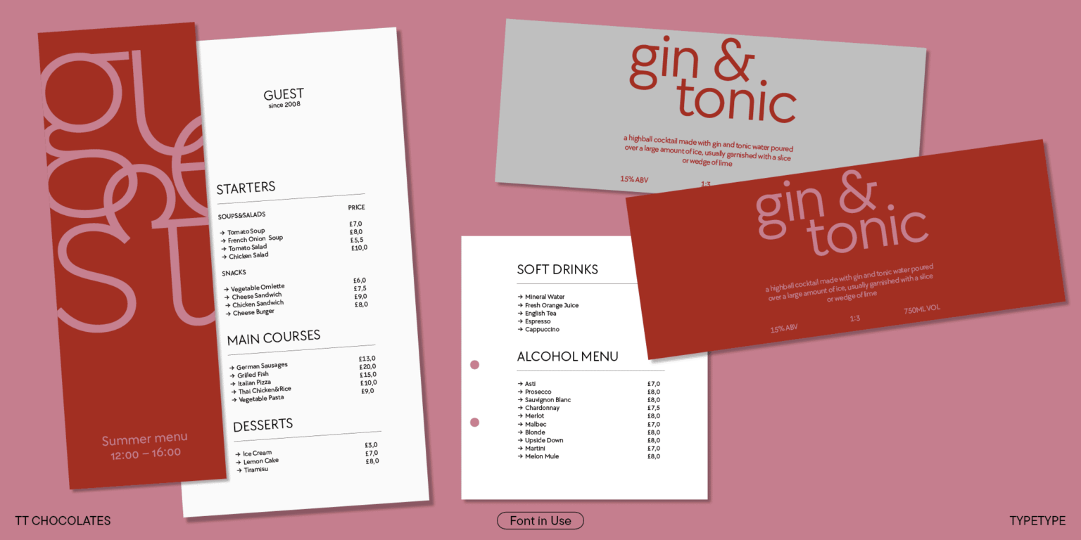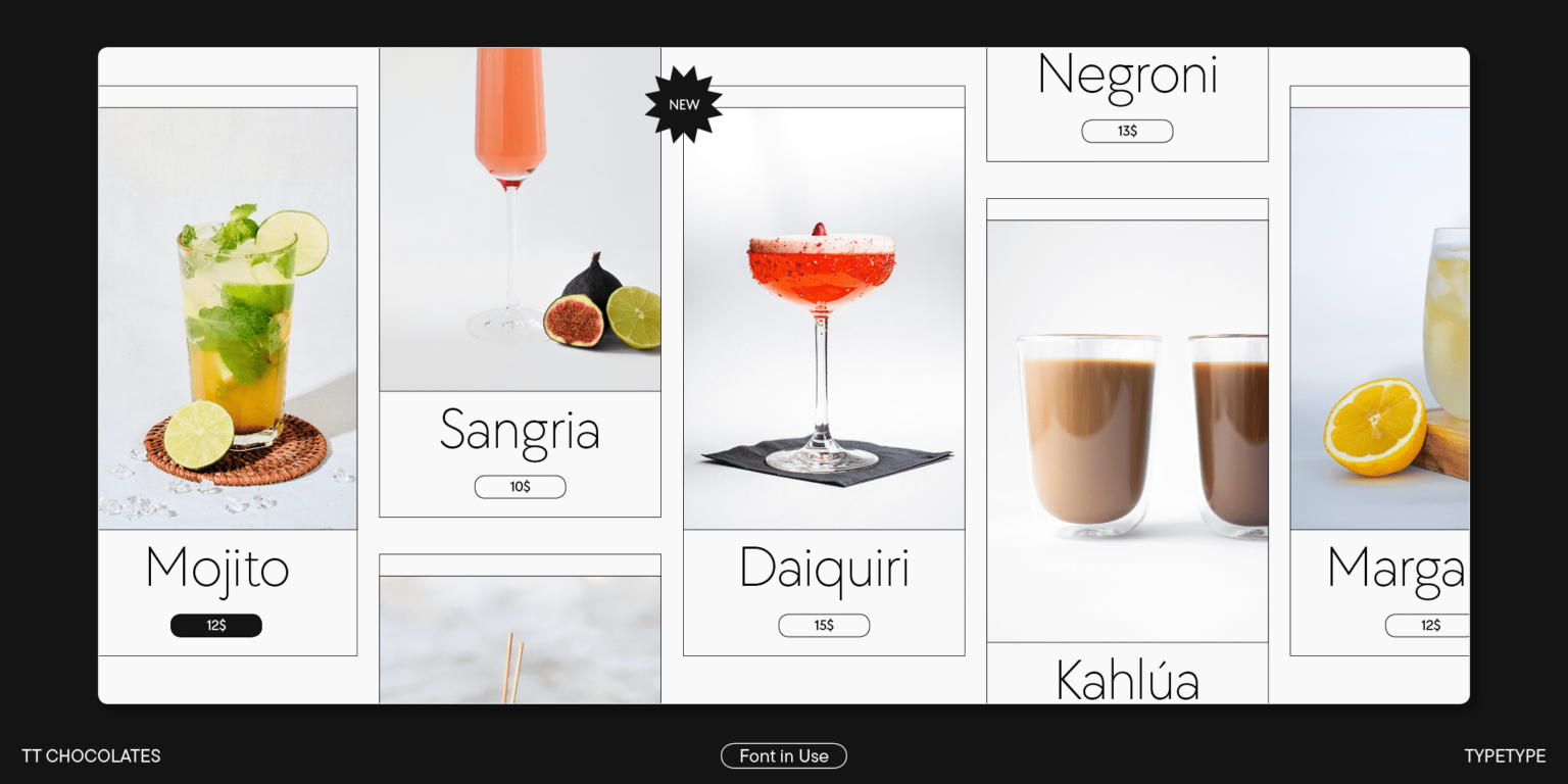 TT Chocolates ist eine elegante humanistische Serifenlose mit einem dichten Schriftsatz und ausgewogenen Proportionen, die an die klassische Tradition erinnern. Ihr freundlicher Charakter lässt sie wie etwas Nahes und Vertrautes erscheinen. Sie hat sich unter Designern den Ruf erworben, die perfekte Schrift für Süßwaren zu sein, aber der Anwendungsbereich der „süßesten“ Schrift von TypeType geht weit darüber hinaus!