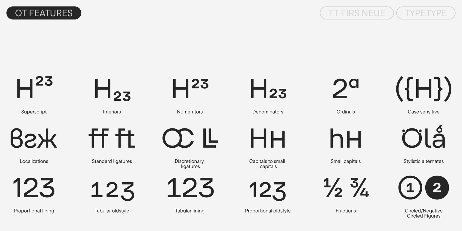 TT Firs Neue unterstützt eine Vielzahl nützlicher OpenType-Funktionen, einschließlich alternativer Glyphenformen. Die Schriftart umfasst auch eine variable Schrift, die entlang zweier Achsen variiert: Gewicht und Neigung. All dies ermöglicht es Designern, die Schrift an ihre spezifischen Bedürfnisse anzupassen und neue Facetten ihrer Vielseitigkeit zu entdecken.