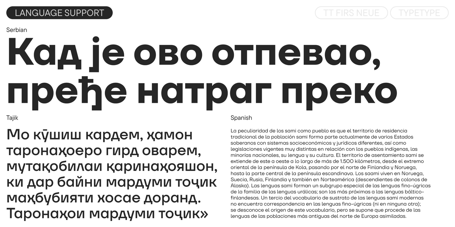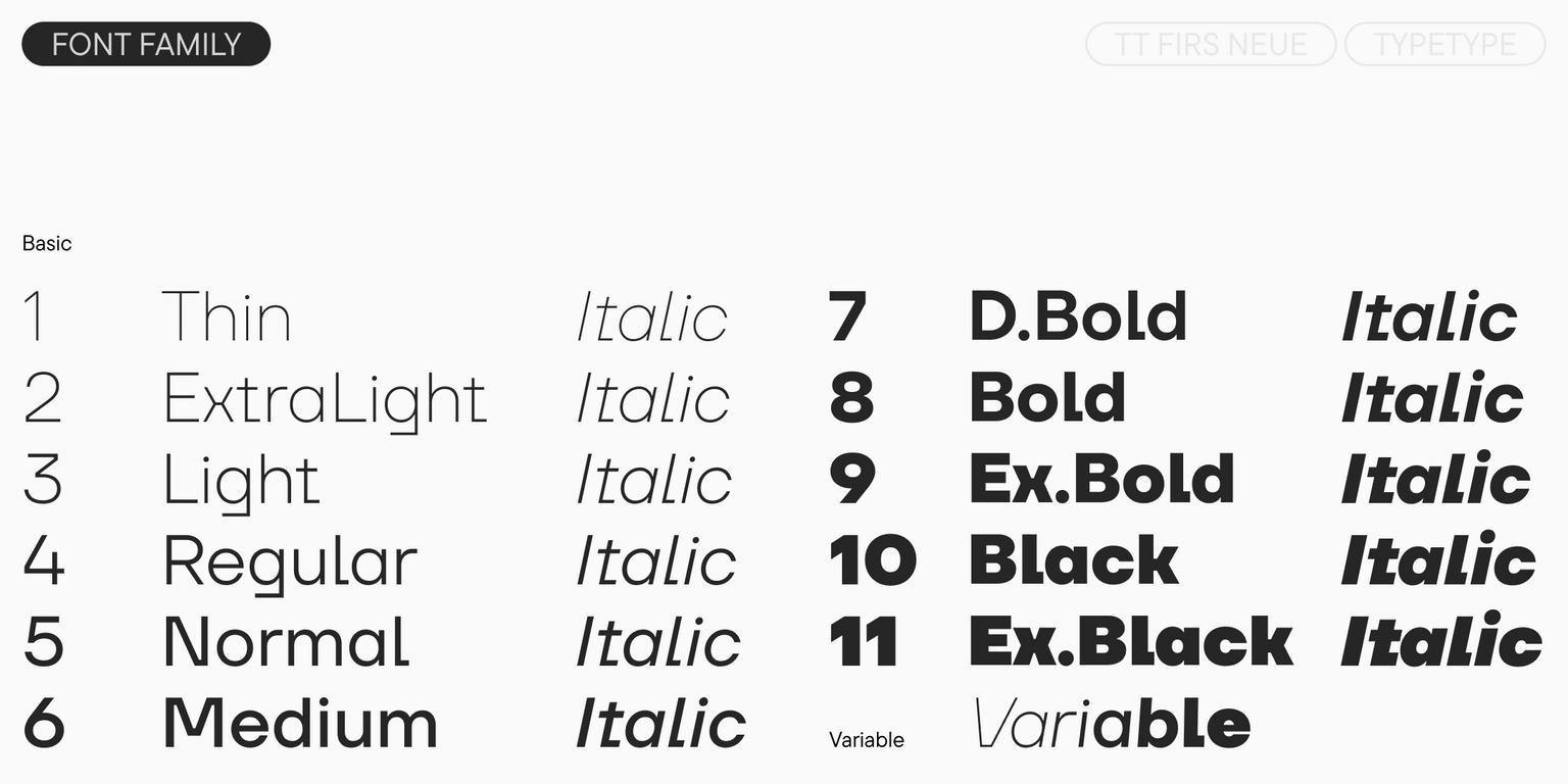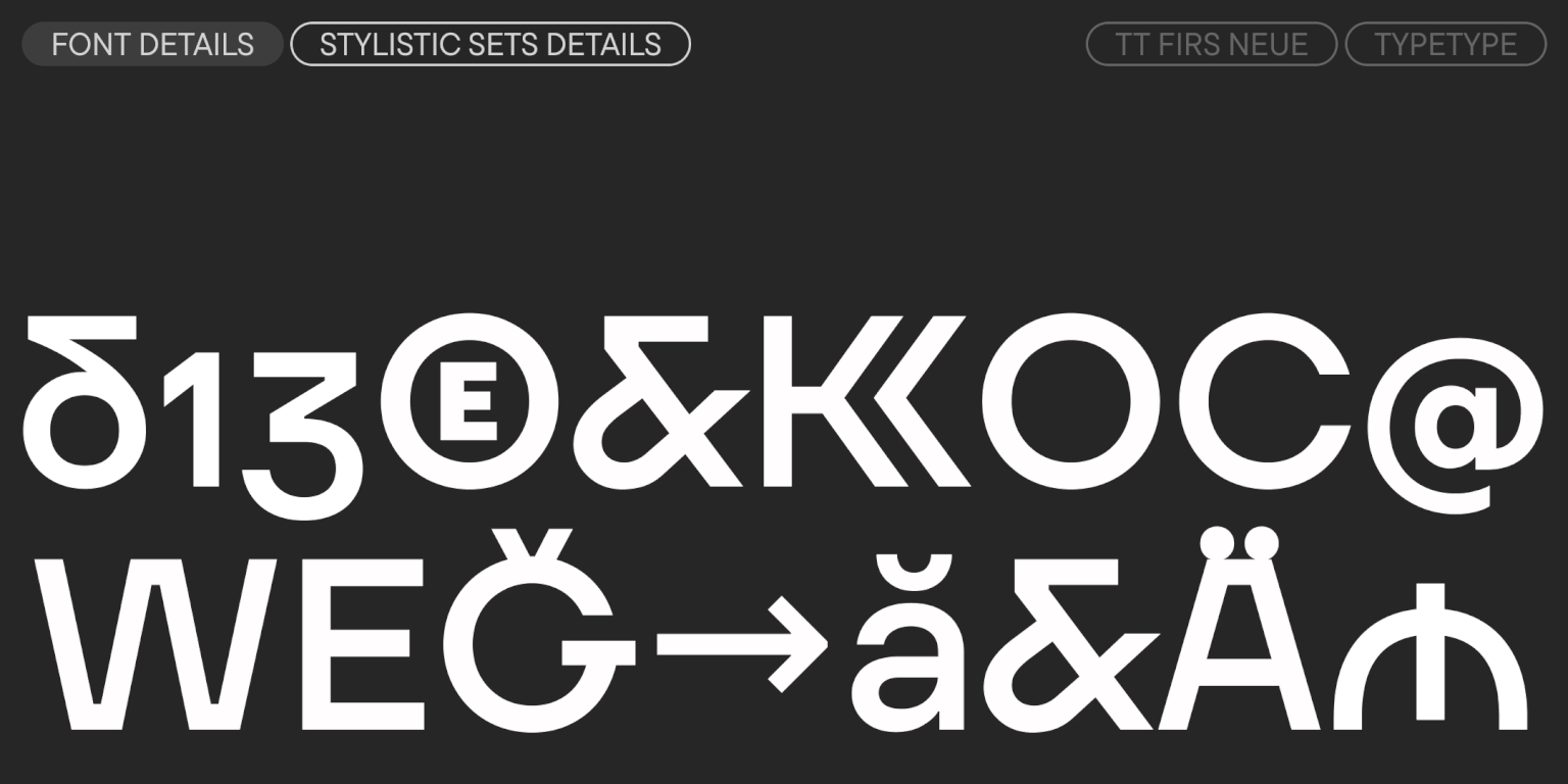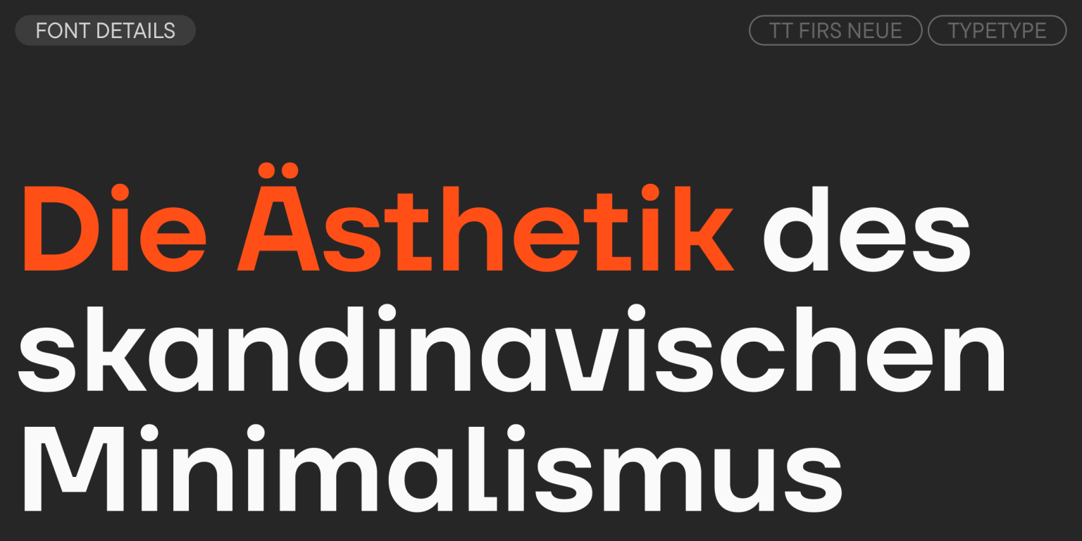 TT Firs Neue ist eine ausgewogene skandinavische Sans-Serif-Schrift mit einem markant robusten nordischen Charakter. Sie ist eine erkennbare und ansprechende Schriftart, die ausdrucksstarke grafische Elemente mit vielseitiger Anwendbarkeit verbindet. Seit ihrer Veröffentlichung hat die Schriftart große Beliebtheit bei Designern erlangt, was uns dazu veranlasste, sie zweimal neu aufzulegen, um Perfektion zu erreichen. Die detaillierte Geschichte der Entstehung und Entwicklung von TT Firs Neue haben wir in unserem Artikel beschrieben.