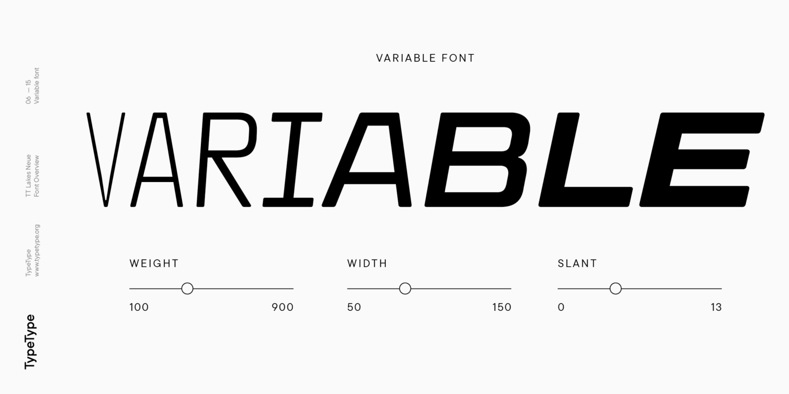 Die Schrift TT Lakes Neue hat 5 Unterfamilien: Compressed, Condensed, Regular, Extended und Expanded. Insgesamt gibt es 91 Stile in der Schriftart: 9 aufrechte und 9 schräge in jeder Unterfamilie und 1 variable Schrift. Jeder Stil hat 921 Zeichen und 36 OpenType-Merkmale.