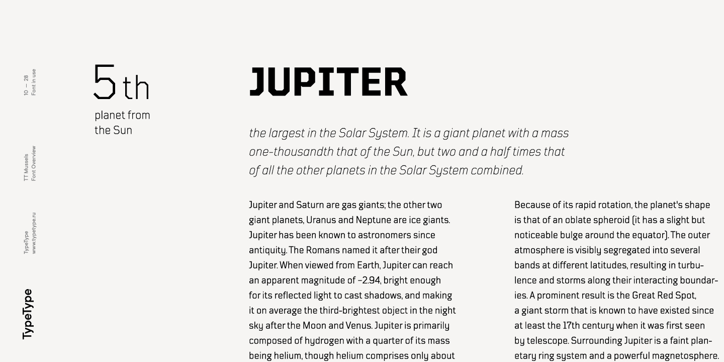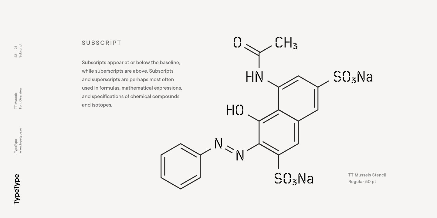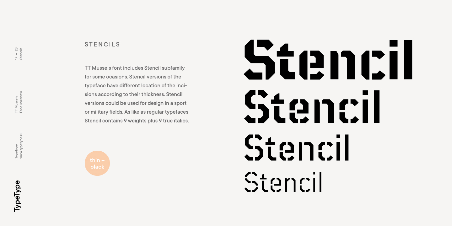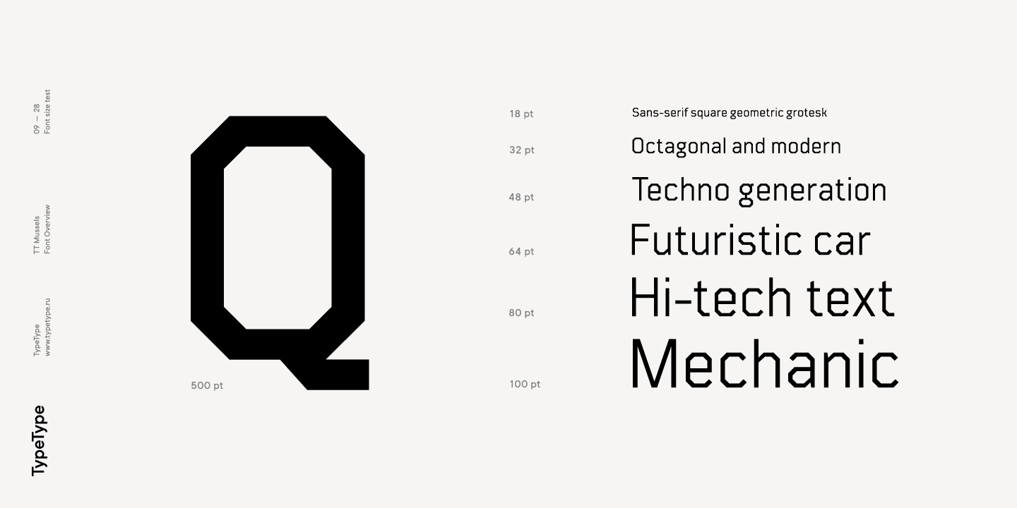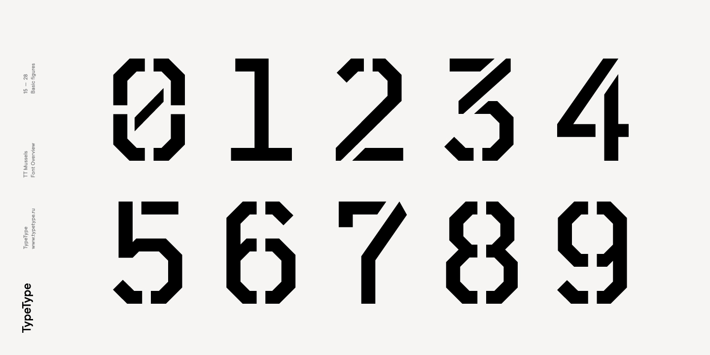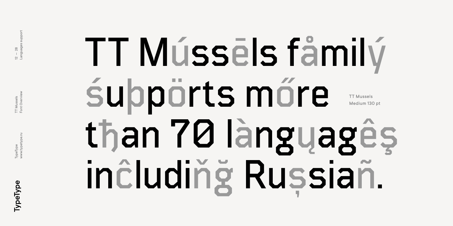 Die Schriftfamilie TT Mussels ist die Nachfolgerin von so beliebten Schriften wie Bender und TT Squares. Gleichzeitig weist TT Mussels eine Reihe grundlegender Unterschiede auf, die sie zu einer einzigartigen Schriftfamilie machen, die sich von anderen achteckigen Schriften abhebt. Bei der Gestaltung der TT Mussels haben wir großen Wert auf die Möglichkeit gelegt, große Textfelder zu setzen, und wir können mit Fug und Recht behaupten, dass die TT Mussels eine seltene Art von technologischen Textschriften ist. Passend dazu haben wir eine Schablonenversion der Schrift entworfen, bei der sich die Lage der Einschnitte je nach ihrer Dicke ändert. Insgesamt besteht die TT Mussels-Schriftfamilie aus 36 Schriftschnitten, die unter anderem stilistische Alternativen und Ligaturen enthalten und auch eine breite Unterstützung für OpenType-Features implementieren: case, frac, ordn, sups, sinf, numr, dnom, onum, tnum, pnum, liga, dlig, salt (auch bekannt als ss01).