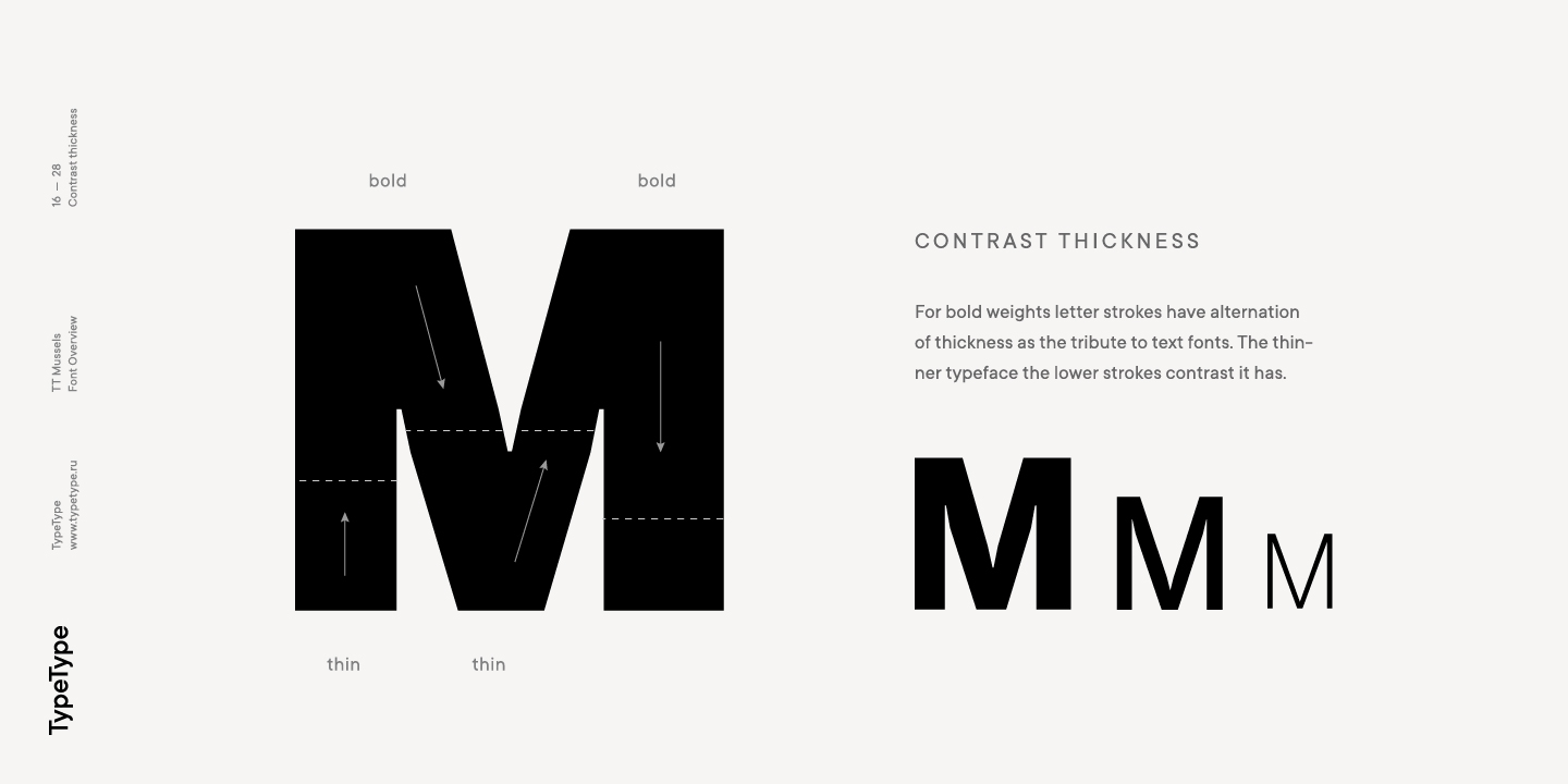 Der dynamische Kontrast ist in TT Mussels weit verbreitet. Am auffälligsten ist er bei der Schriftart Black, bei der das Verhältnis zwischen der Dicke der vertikalen Striche und der horizontalen Striche etwa zwei zu eins beträgt. Bei der Schriftart Thin ist die Dicke der vertikalen Striche bereits mit der Dicke der horizontalen Striche konsistent. Im Design der TT Mussels finden sich auch andere Zeichen des Respekts für traditionelle Textschriften, wie die Spur der Federbewegung, die historisch typisch für Antiquas ist. Beim Buchstaben M der Schriftart Black beispielsweise ist zunächst ein dünner Strich zu sehen, dann ein dicker Diagonalstrich, gefolgt von einem dünnen Diagonalstrich und einem abschließenden fetten vertikalen Strich. Wie bei den dynamischen Kontrasten verschwindet dieser Effekt allmählich, wenn man sich dünnen Flächen nähert. Bei dicken Schriften gibt es an Stellen wie den „Achselhöhlen“ der Buchstaben MNИ oder den Kreuzungspunkten der Diagonalen von WVvw visuelle Kompensatoren, die die fetten Schriftzeichen aufhellen. Mit dem Übergang von dicken zu dünnen Schriften ändern sich die Dimensionen und die konzeptionellen Werte der Kompensatoren, und in dünnen Schriften verschwinden sie vollständig.