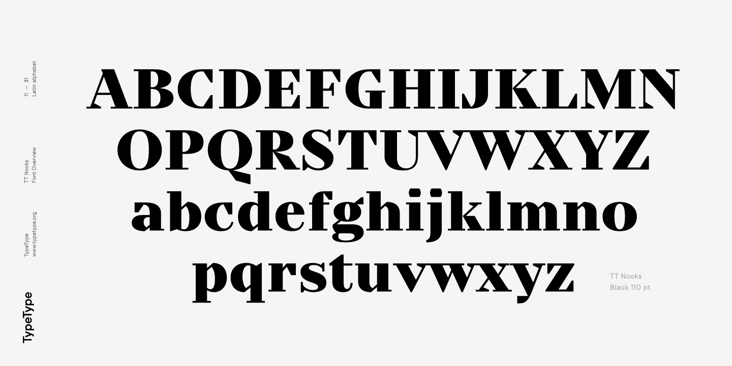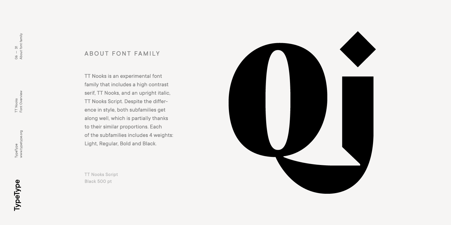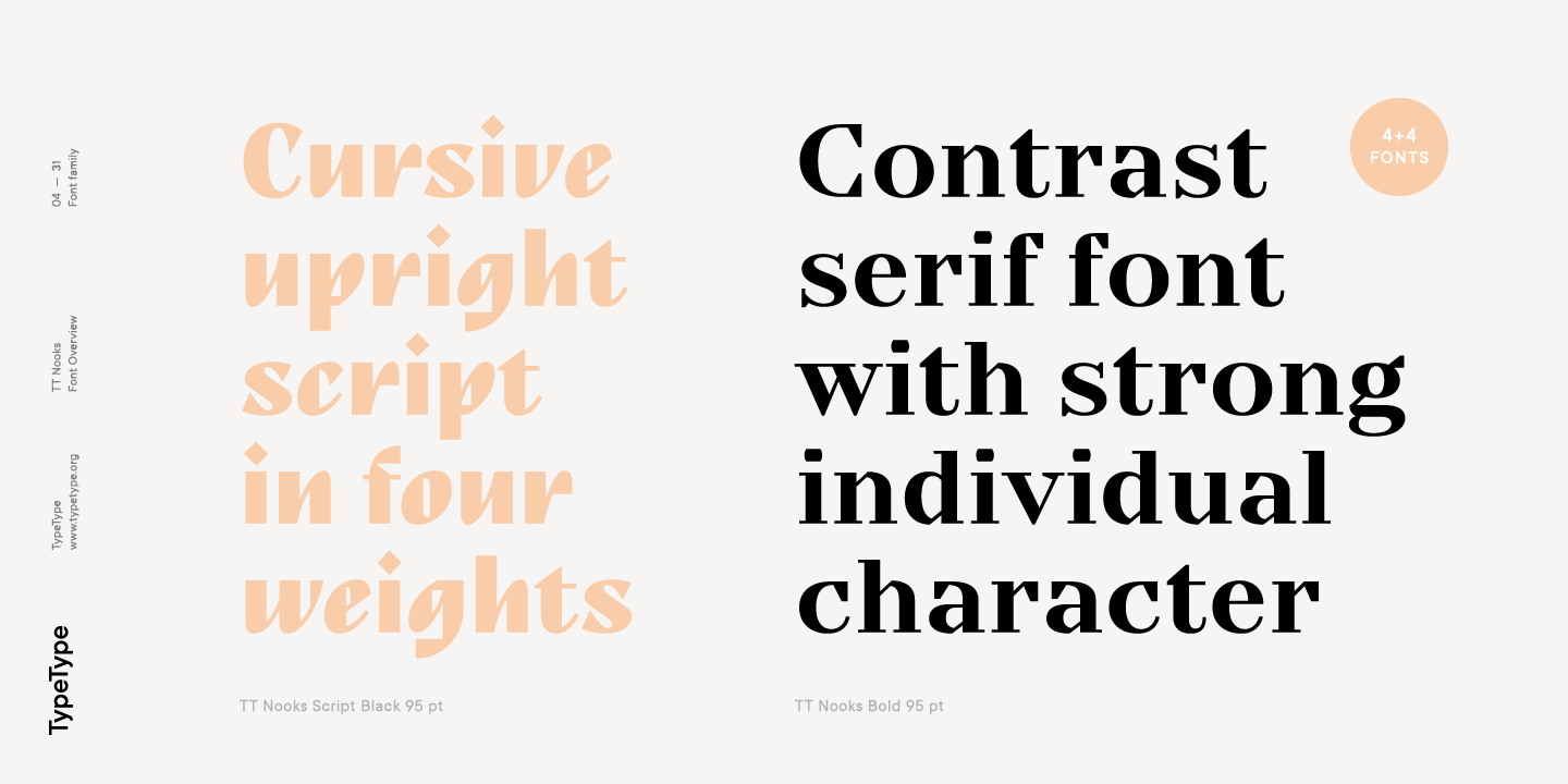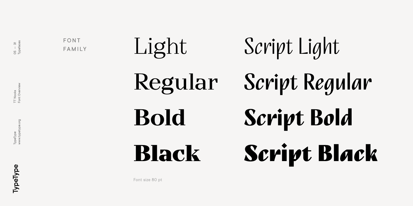 TT Nooks ist eine experimentelle Schriftfamilie, die eine kontrastreiche Serifenschrift, TT Nooks, und eine aufrechte Kursivschrift, TT Nooks Script, umfasst. Trotz des unterschiedlichen Stils kommen beide Unterfamilien gut miteinander aus, was zum Teil auf ihre ähnlichen Proportionen zurückzuführen ist. Jede der Unterfamilien umfasst 4 Schnitte: Light, Regular, Bold und Black.