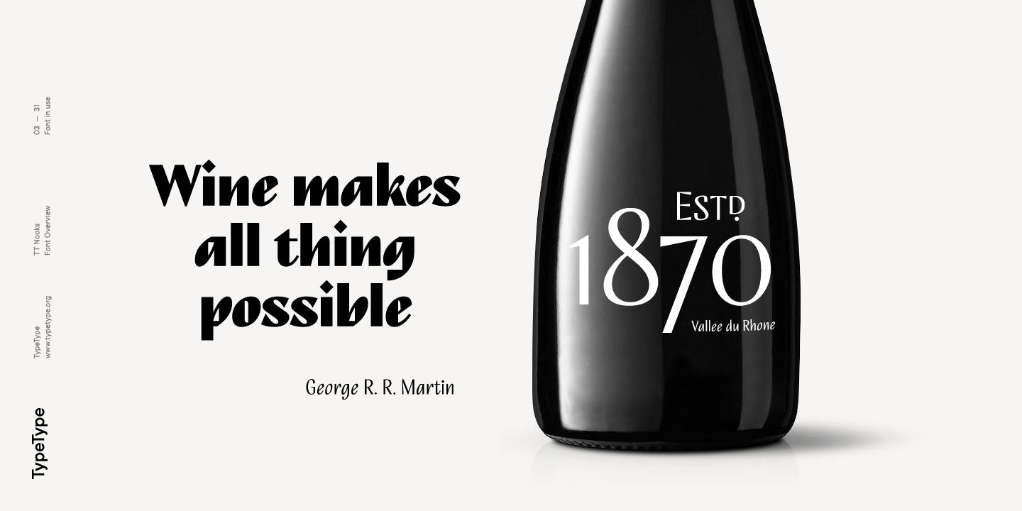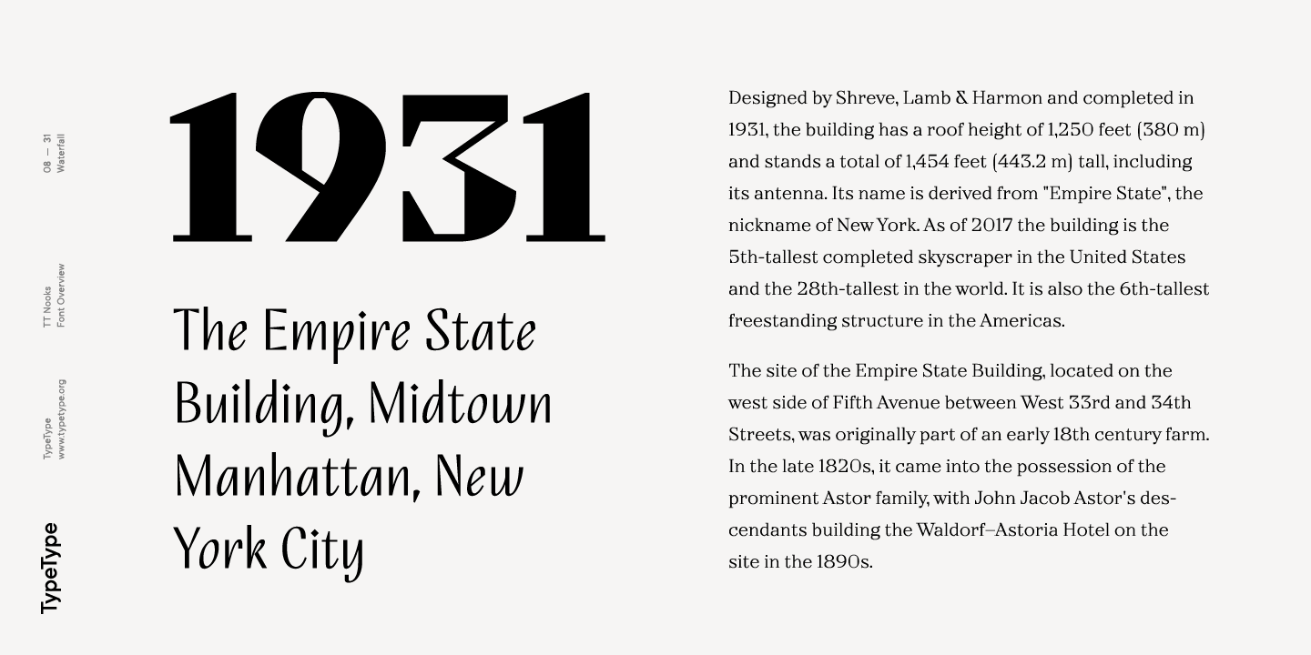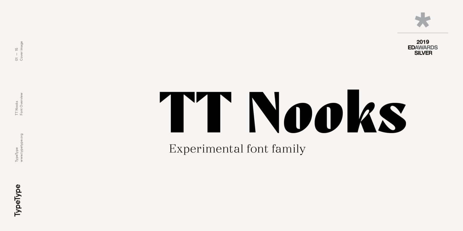 TT Nooks ist eine experimentelle Schriftfamilie, die eine kontrastreiche Serifenschrift, TT Nooks, und eine aufrechte Kursivschrift, TT Nooks Script, umfasst. Trotz des unterschiedlichen Stils kommen beide Unterfamilien gut miteinander aus, was zum Teil auf ihre ähnlichen Proportionen zurückzuführen ist. Jede der Unterfamilien umfasst 4 Schnitte: Light, Regular, Bold und Black.