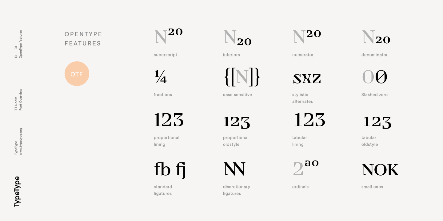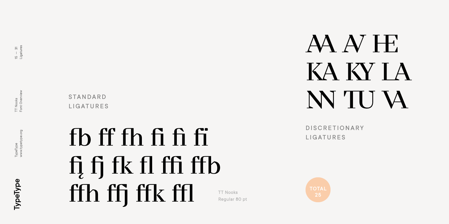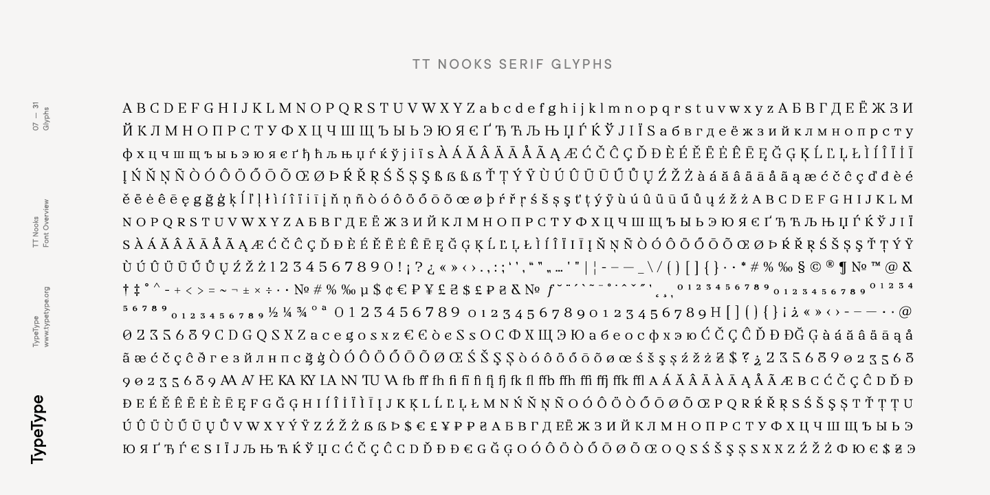 Die Serifen in TT Nooks heben sich durch ihre geometrische Form, die an Hausschuhe erinnert, besonders deutlich ab. Zusätzlich zu ihrer Besonderheit verleihen diese Serifen der Schrift Stabilität und ermöglichen einen besseren Ausgleich des Schwarz-Weiß-Verhältnisses innerhalb der Buchstaben. TT Nooks verfügt über Kapitälchen für das lateinische und kyrillische Alphabet sowie über eine Reihe von stilistischen Alternativen (einschließlich einiger Ziffern), die die Schrift etwas geometrischer machen. Darüber hinaus haben wir mehr als 25 Ligaturen gezeichnet, darunter Ligaturen für Großbuchstaben, geschlitzte Nullen und viele andere nützliche OpenType-Funktionen.
