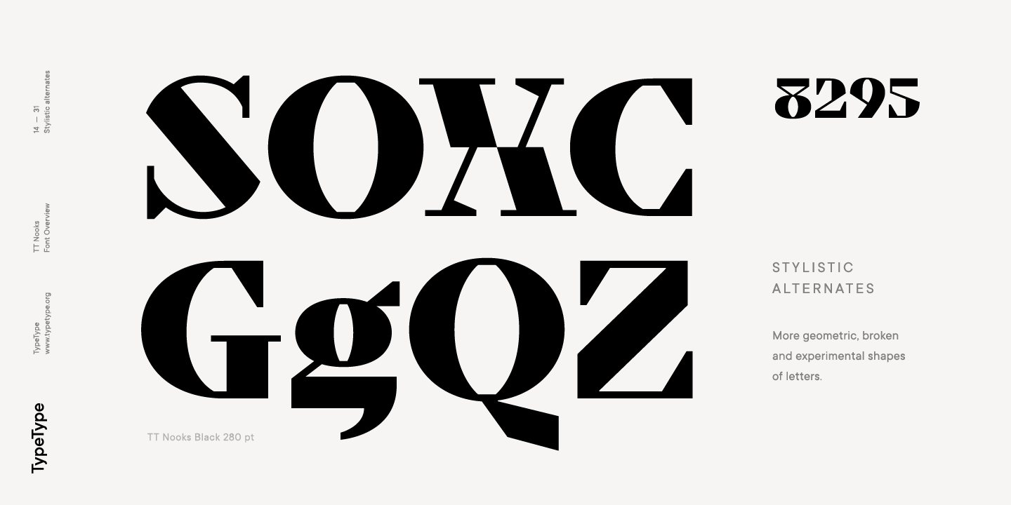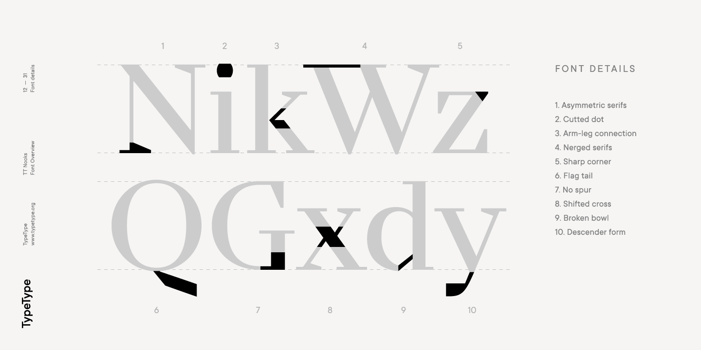 Die wichtigste Unterfamilie ist TT Nooks – eine stilvolle, kontrastreiche Serifenschrift mit einem leichten Hauch von Selbstbezogenheit. Wäre TT Nooks eine Person, so wäre sie eine elegante Dame mit einer unabhängigen und festen Persönlichkeit. In den ursprünglichen Entwürfen der TT Nooks waren Spuren einer breiten Feder zu sehen, aber im Laufe der weiteren Entwicklung entfernte sich die Schrift von diesem Stil und behielt nur den hohen Kontrast der Striche bei. Darüber hinaus hat die TT Nooks im Laufe der Designrecherche einen Hauch von Geometrie erhalten.
