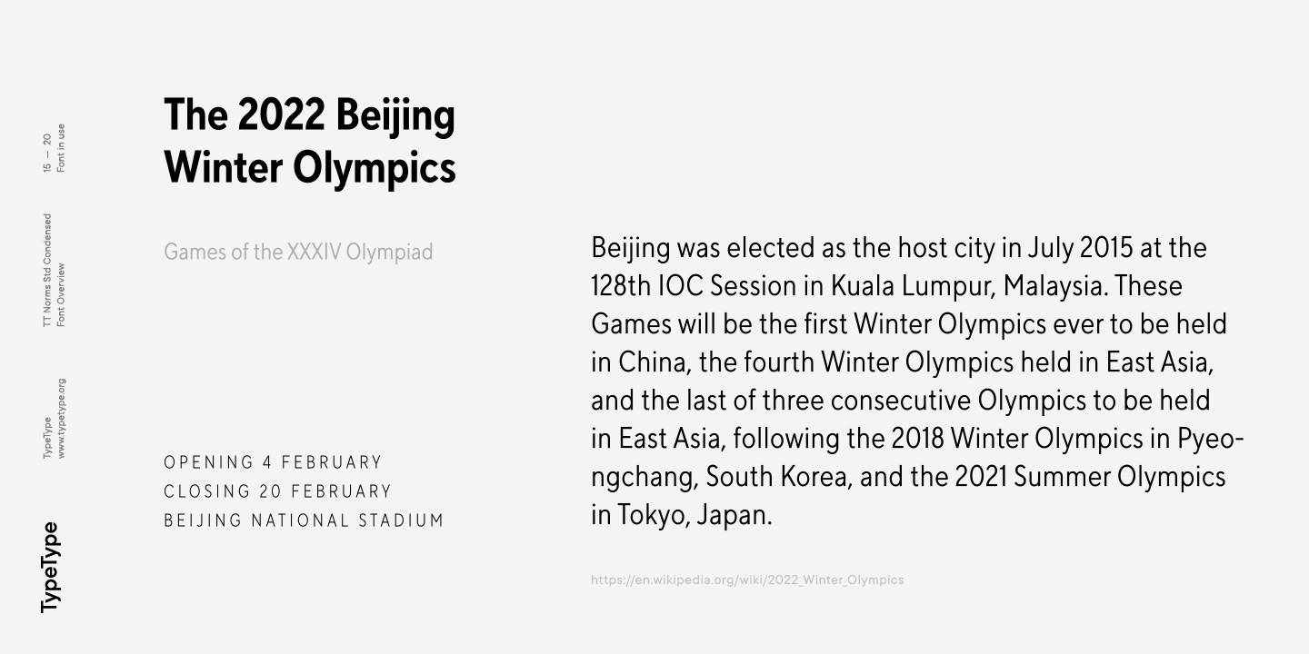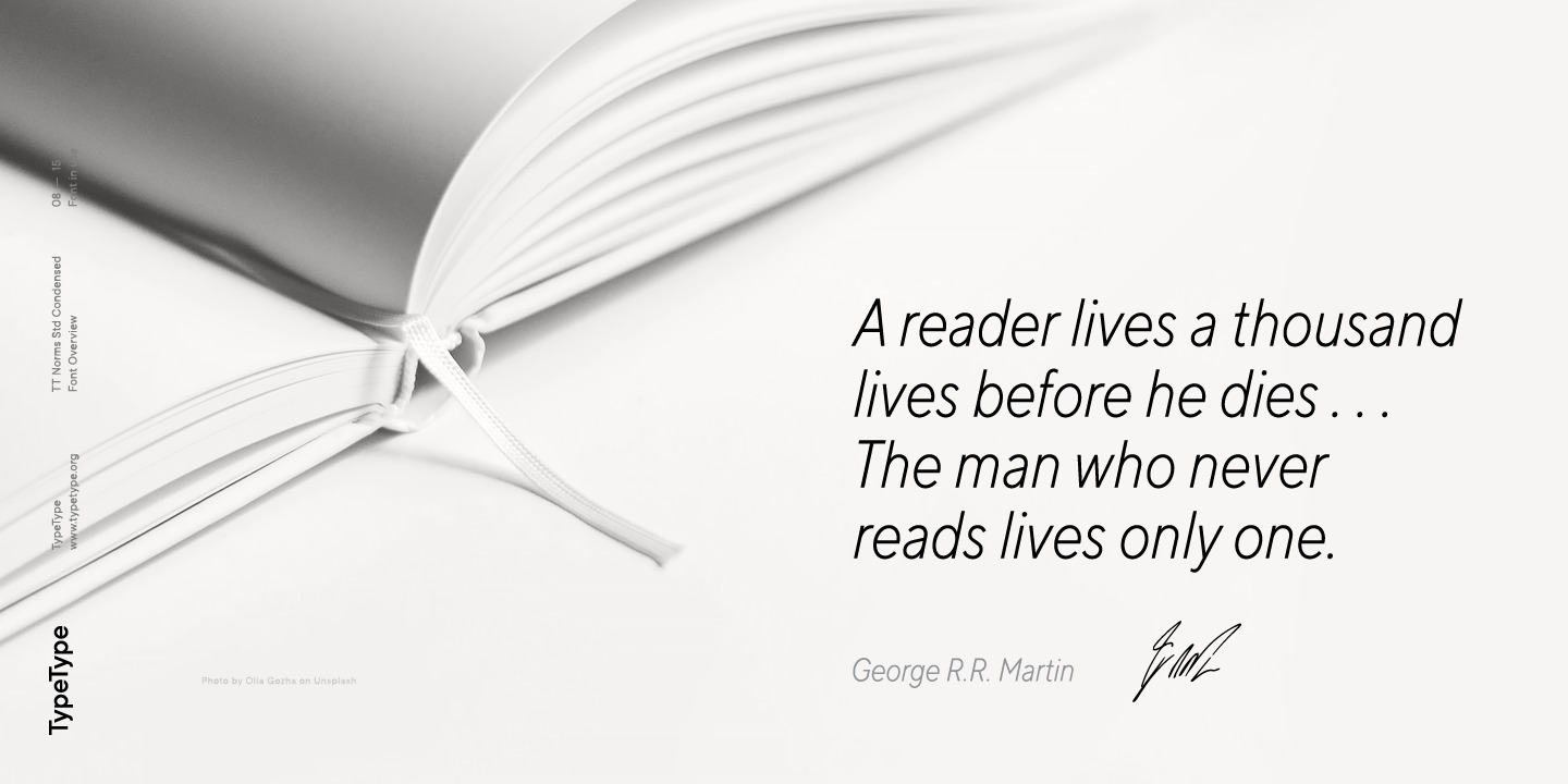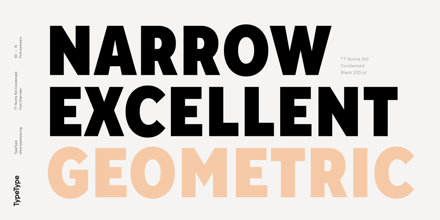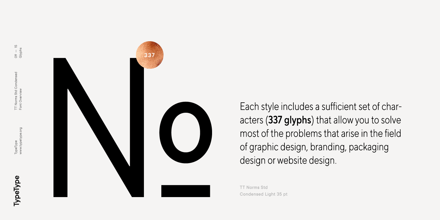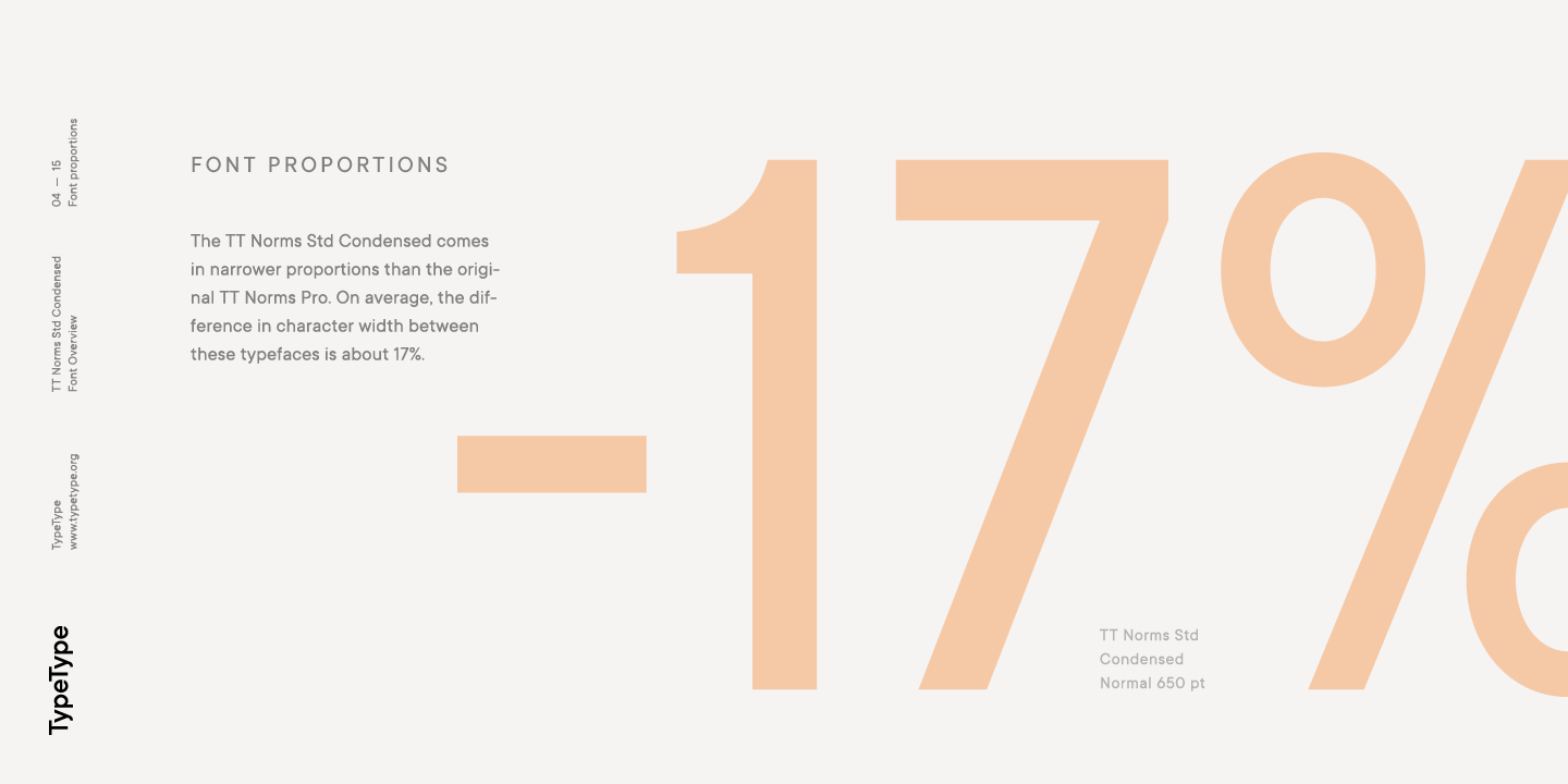TT Norms Std Condensed ist die logische Weiterentwicklung unseres Bestsellers TT Norms. Seit der Veröffentlichung der TT Norms erhielten wir eine Reihe von Anfragen zur Erstellung der schmalen Version und konnten sogar einige kundenspezifische Projekte mit der schmalen TT Norms realisieren, bevor wir uns entschlossen, eine vollwertige kommerzielle Version der Schrift zu erstellen.
