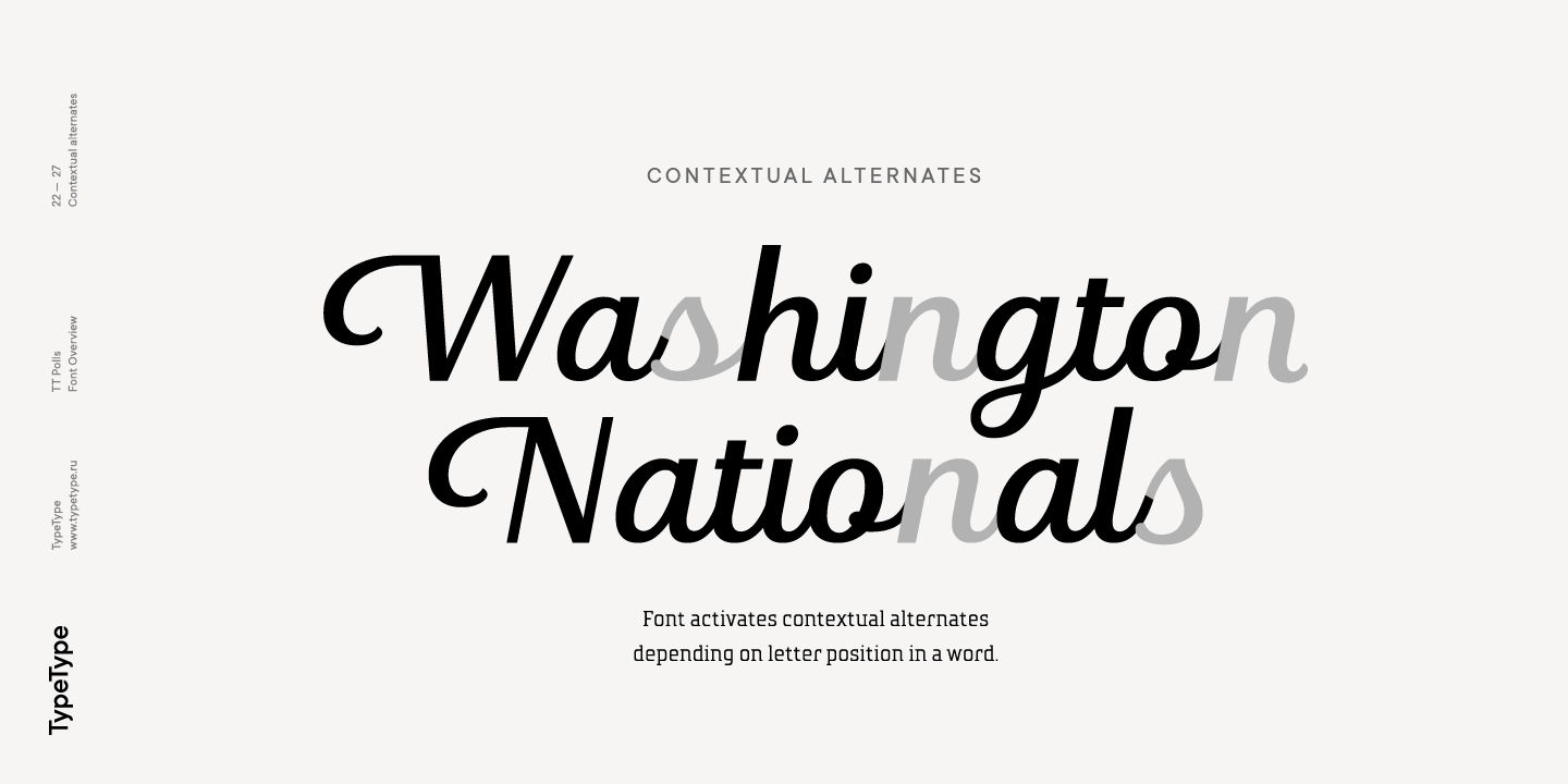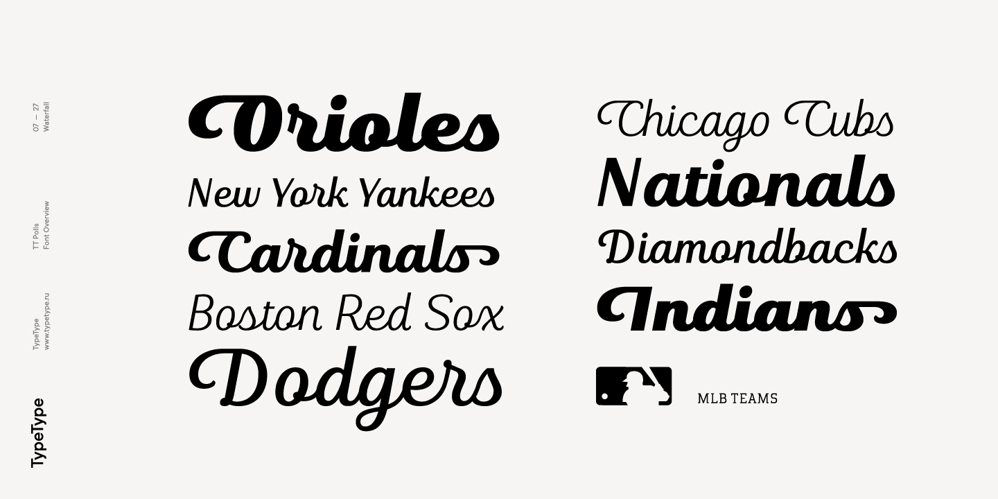Die Unterfamilie TT Polls besteht aus 5 Schnitten und 5 Kursiven. In ihr haben wir einen Satz Ligaturen und eine breite Unterstützung von OpenType-Features implementiert: calt, salt, liga, dlig, case, frac, sinf, sups, dnom, numr, tnum. Dank der stilistischen Alternativen ist es möglich, den Charakter der Schrift deutlich zu verändern und sie technologischer zu gestalten. Obwohl wir bei der Entwicklung der Schriftfamilie die Verwendung von TT Polls in sportbezogenen Designs in Betracht gezogen haben – sei es für Aufschriften auf den Trikots von Baseballspielern oder für die Nummern auf der Seite eines Rennwagens -, müssen wir zugeben, dass die endgültige Version von TT Polls auch hervorragend zu einem eher zwanglosen Design und zu Anwendungsbereichen passt.