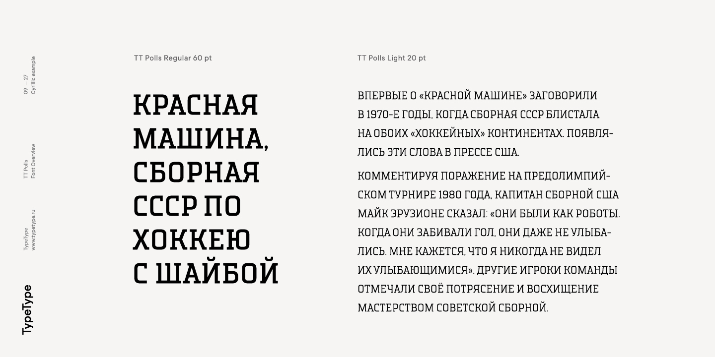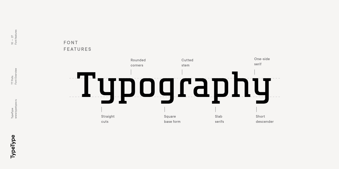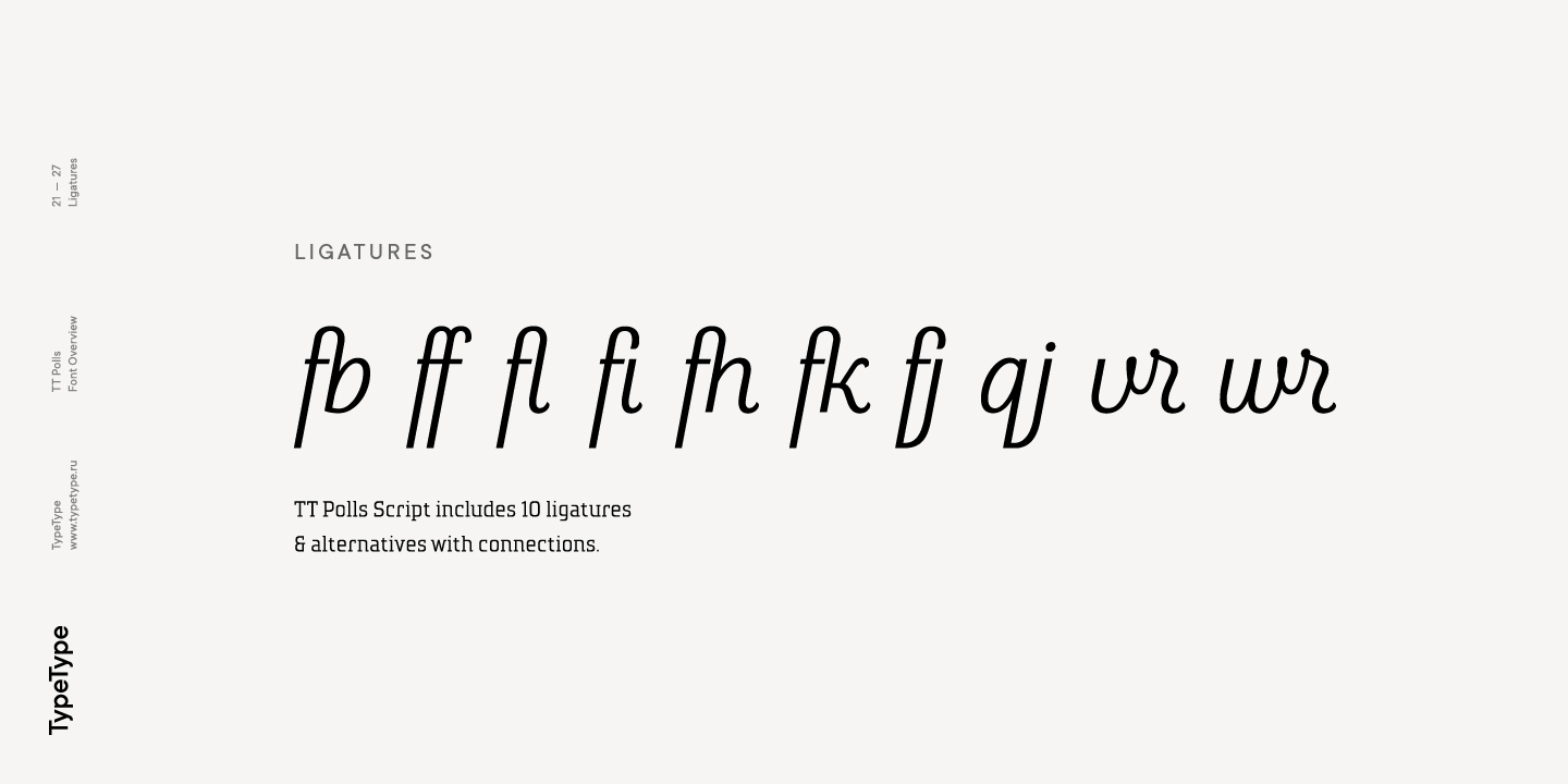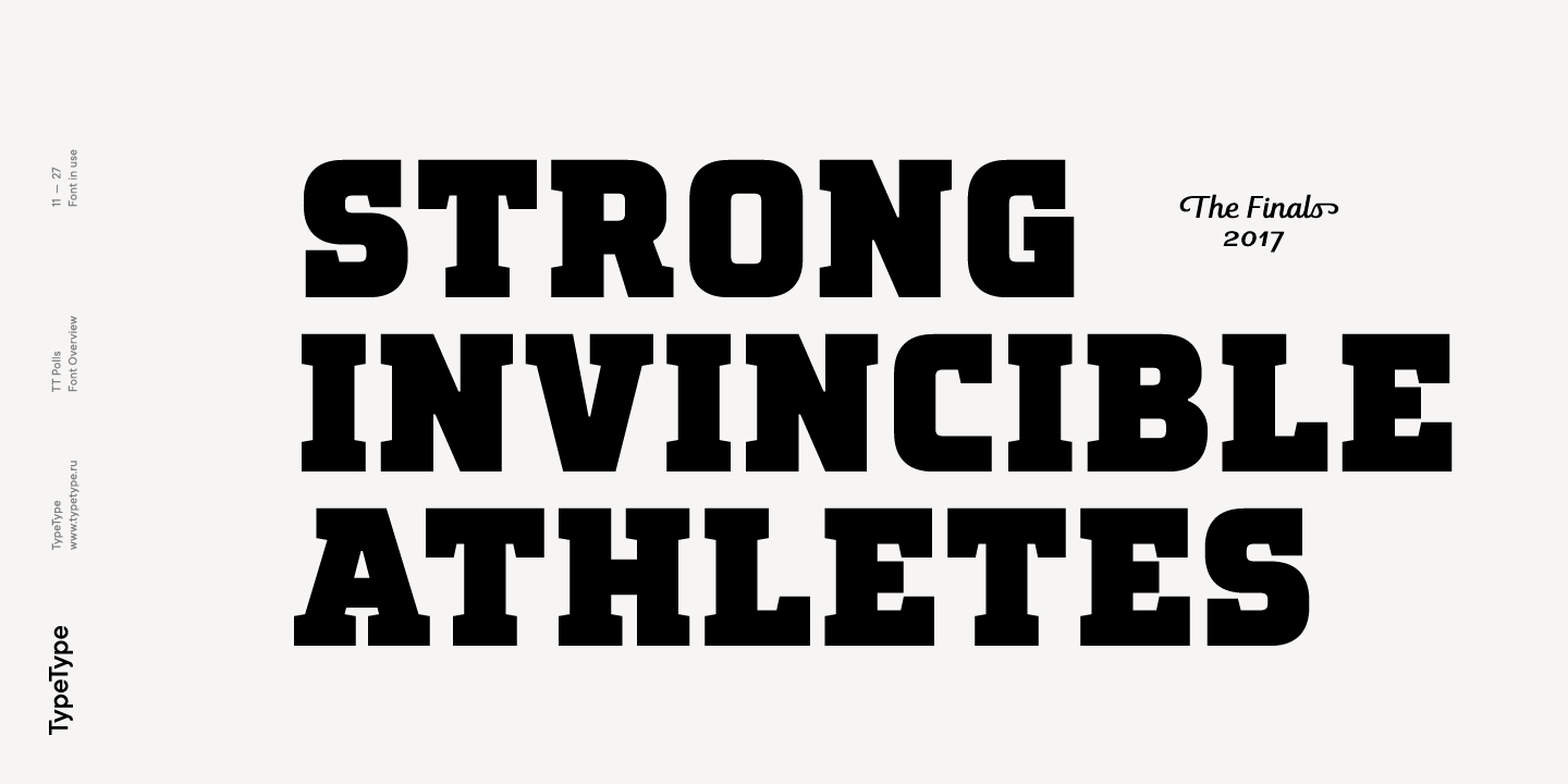 TT Polls ist eine moderne modulare Slab-Serif, die von amerikanischen Sportgrafiken inspiriert wurde. Da wir ein wirklich besonderes und bemerkenswertes Projekt schaffen wollten, haben wir beschlossen, die Zeichenpalette zu erweitern und die Unterstützung von OT-Features zu implementieren sowie eine traditionelle handgeschriebene Schrift in verschiedenen Strichstärken zur Slab-Serif hinzuzufügen. Obwohl sich die Unterfamilien TT Polls und TT Polls Script stilistisch voneinander unterscheiden, passen sie dank der richtigen Proportionen sowohl bei der Dicke der vertikalen Striche als auch bei der allgemeinen Breite der Zeichen perfekt zusammen.