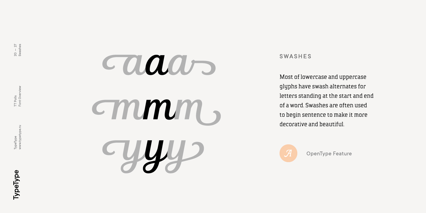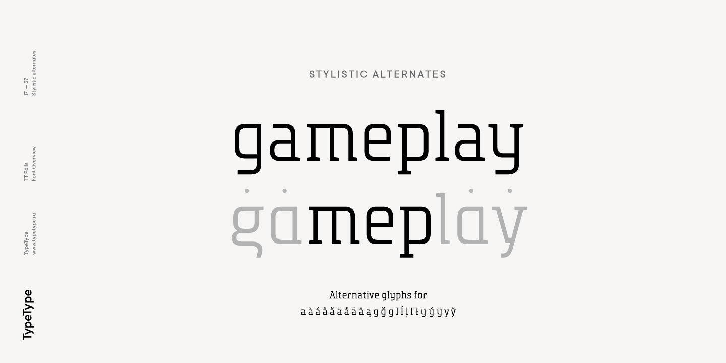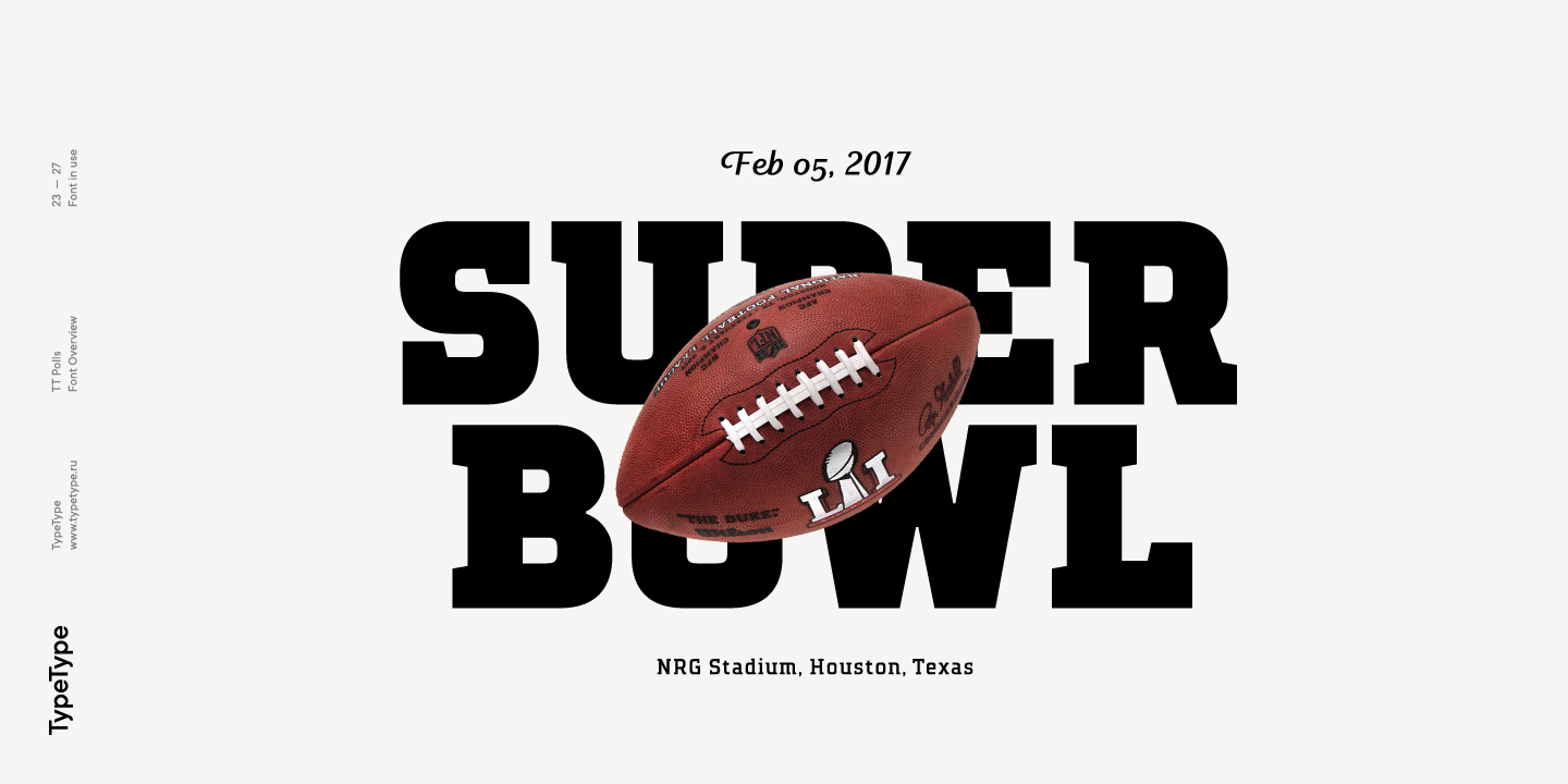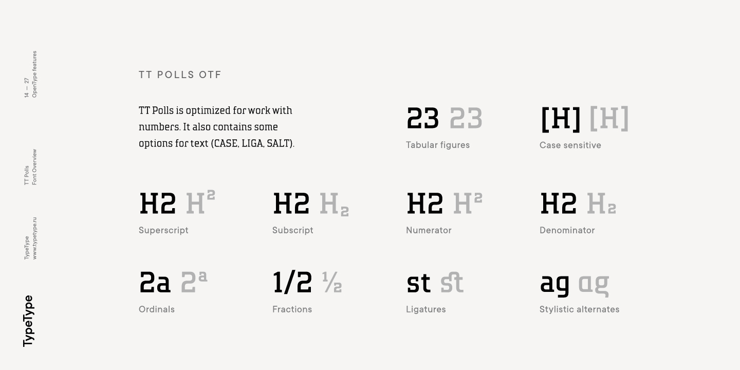 TT Polls ist eine moderne modulare Slab-Serif, die von amerikanischen Sportgrafiken inspiriert wurde. Da wir ein wirklich besonderes und bemerkenswertes Projekt schaffen wollten, haben wir beschlossen, die Zeichenpalette zu erweitern und die Unterstützung von OT-Features zu implementieren sowie eine traditionelle handgeschriebene Schrift in verschiedenen Strichstärken zur Slab-Serif hinzuzufügen. Obwohl sich die Unterfamilien TT Polls und TT Polls Script stilistisch voneinander unterscheiden, passen sie dank der richtigen Proportionen sowohl bei der Dicke der vertikalen Striche als auch bei der allgemeinen Breite der Zeichen perfekt zusammen.
