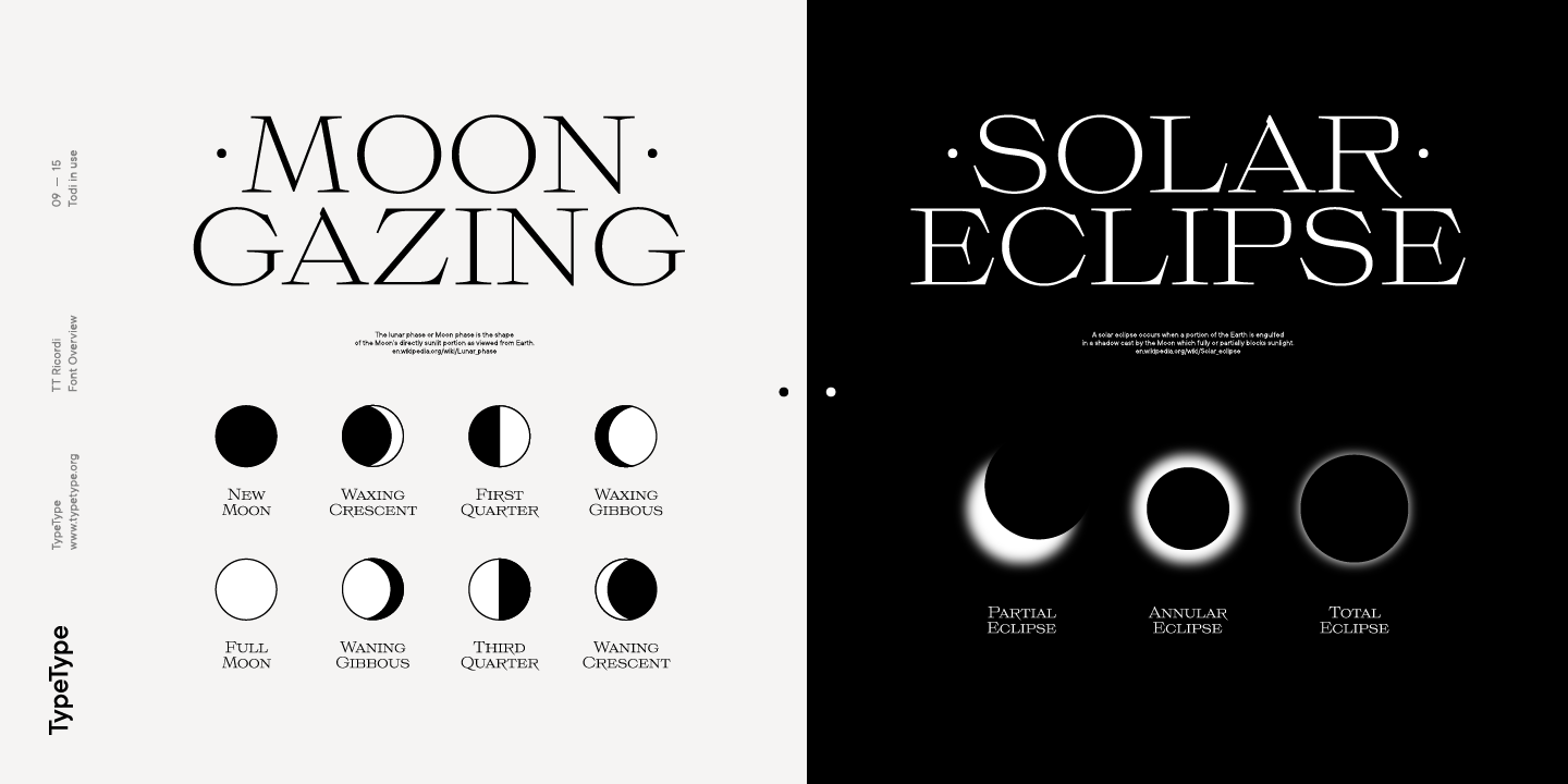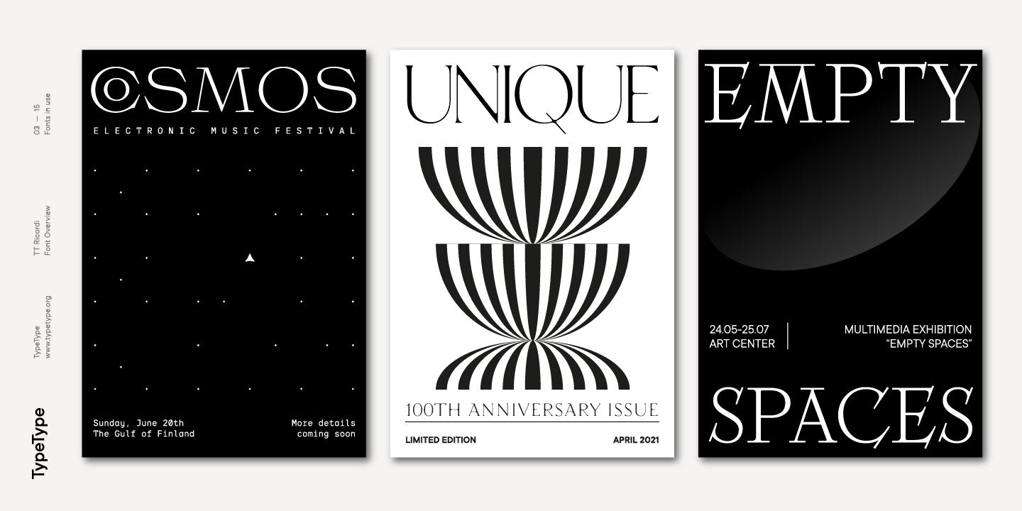 Die Schriften aus der TT Ricordi-Schrift sind sehr anschaulich und zeitgemäß, weisen aber gleichzeitig subtile Bezüge zu historischen Inschriften auf. Die Schriften passen sowohl auf die Umschläge von Buchklassikern als auch in Hochglanzmagazin-Layouts. Sie können auch für Plakate und Verpackungen oder als ausdrucksstarkes Hauptelement eines Firmenbrandings verwendet werden. Alle drei Serifen der Schriftfamilie TT Ricordi lassen sich zudem gut mit funktionalen serifenlosen Schriften wie TT Norms Pro oder TT Commons kombinieren.