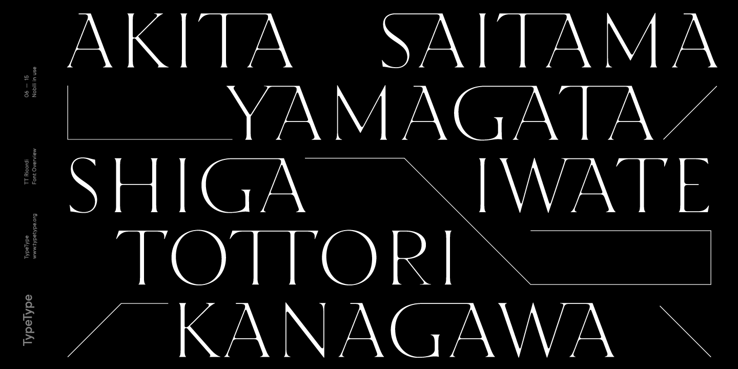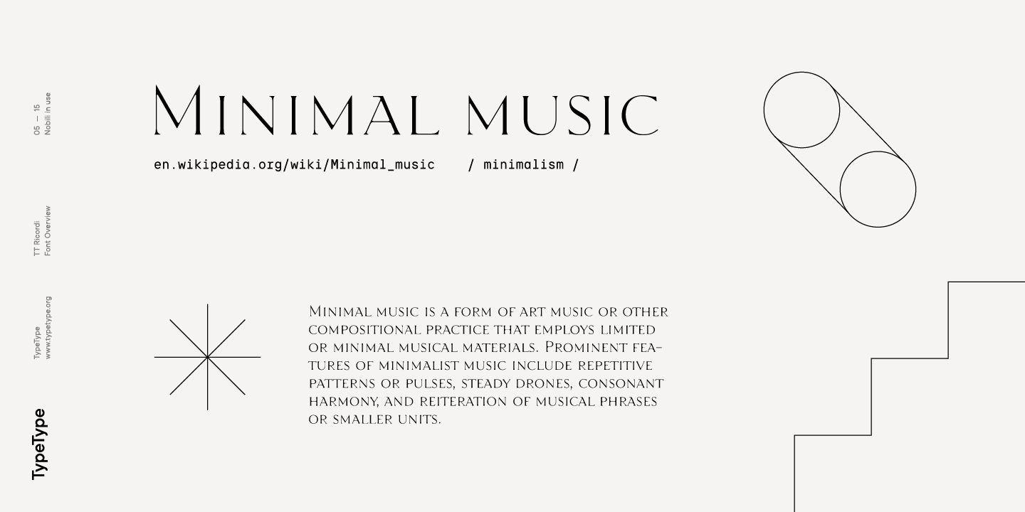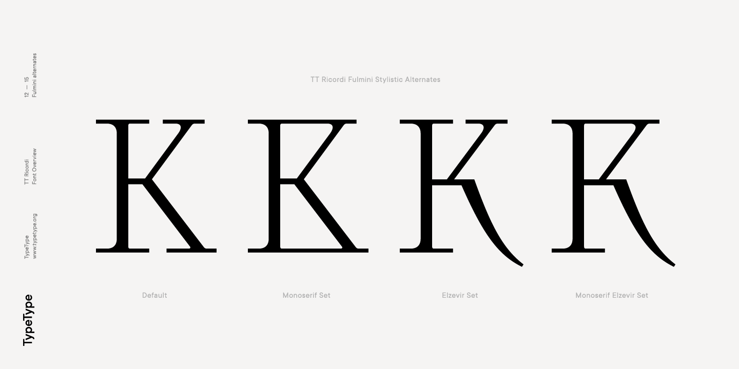 Die Schriftfamilie TT Ricordi ist eine Sammlung von drei Serifenschriften, die die traditionelle Schriftpalette erheblich erweitern. Jede Schrift der TT Ricordi-Familie wurde von einem anderen Designer entworfen und hat ihre eigene Geschichte. Alle drei Schriften haben eine ähnliche Dicke und eine ähnliche Zeichenkomposition und sind in Großbuchstaben und Kapitälchen unterteilt, die Kleinbuchstaben ersetzen. Die Schriften bieten eine breite Unterstützung der lateinischen Sprachen und unterstützen die kyrillischen Grundzeichen.