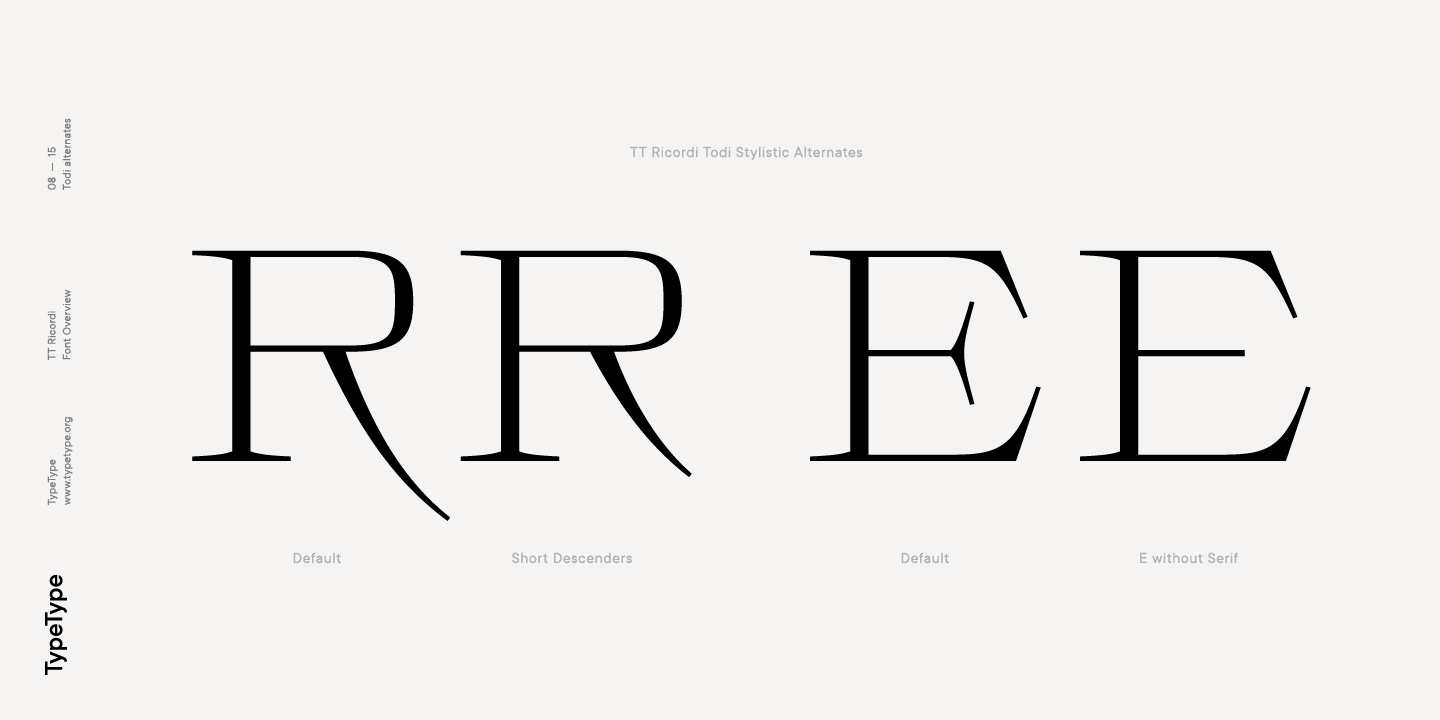 Die TT Ricordi Todi hat ziemlich breite Buchstabenproportionen, die praktisch keinen Kontrast aufweisen. Das Hauptmerkmal der Schrift ist die Kombination von glatten runden Formen mit bewusst eckigen Formen. Darüber hinaus zeichnet sich die Schrift durch klare und scharfe Zeichendetails, übertriebene Ober- und Unterlängen und gedämpfte Kontraste aus. Zu den interessanten Besonderheiten der Schrift gehören die charakteristischen langen Ober- und Unterlängen und ihre abgemilderten Versionen, ein stilistischer Satz mit dreieckigen Punkten, alternative Versionen der EF-Zeichen und zwei Ф-Formen, rund und quadratisch. Die Schrift TT Ricordi Todi enthält 876 Glyphen und eine ganze Reihe nützlicher Funktionen, wie z. B.: aalt, ccmp, locl, numr, ordn, tnum, pnum, case, dlig, salt, ss01, ss02, ss03, ss04, ss05, ss06, ss07, ss08, ss09, ss10, calt.