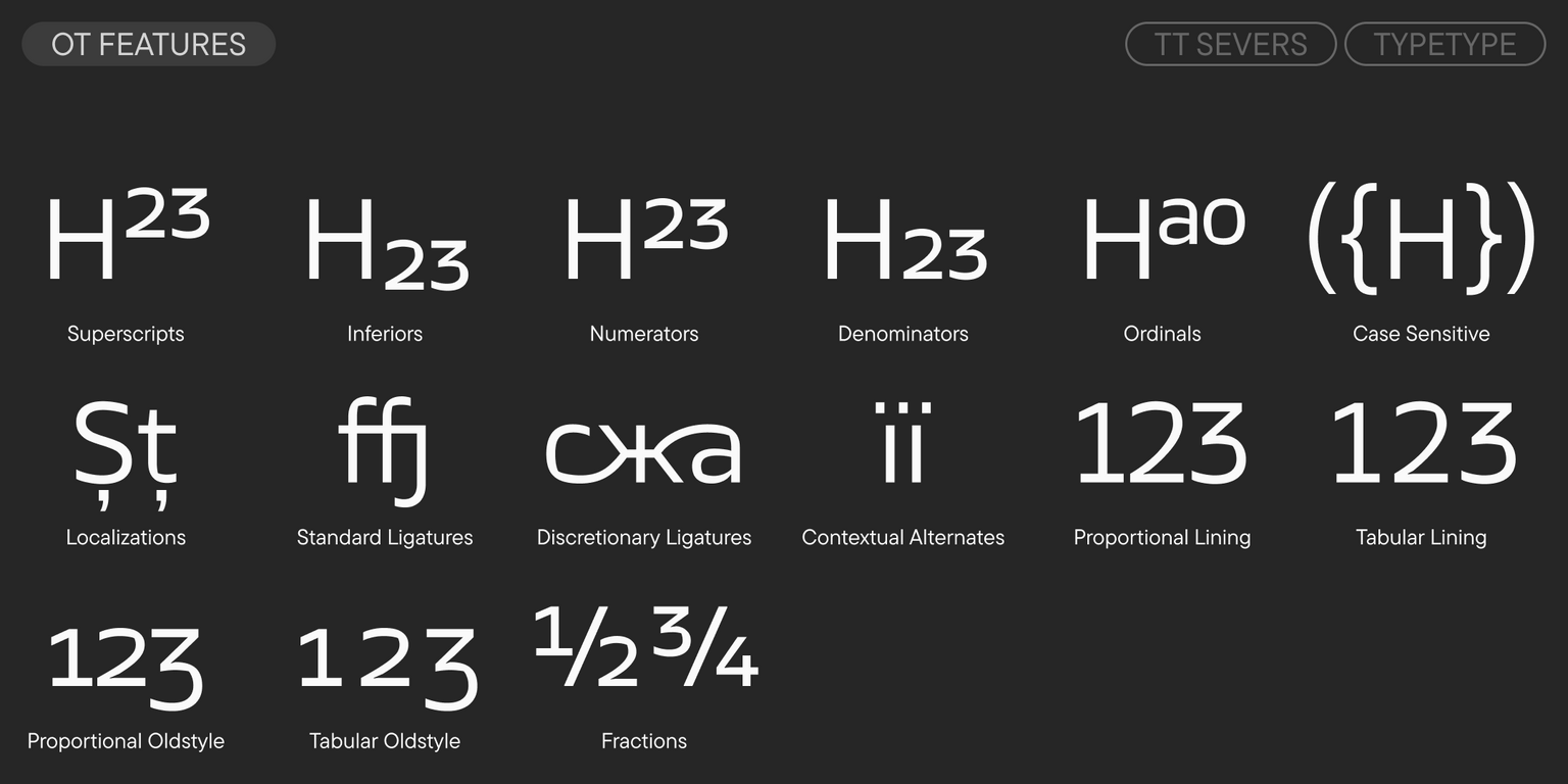 Die Schriftfamilie umfasst Standard- und diskrete Ligaturen, einschließlich experimenteller Ligaturen für Kyrillisch. Darüber hinaus kann TT Severs durch stilistische Alternativen weicher gestaltet werden. In der aktualisierten Version finden Sie noch mehr OpenType-Features und stilistische Sets sowie eine variable Schrift, die sich entlang der Achsen für Dickte und Neigung verändert. Zudem haben wir neue Sprachen und Dienstglyphen hinzugefügt. Insbesondere haben wir minuskel-mathematische Zeichen nachgezeichnet und die Lateinschrift ergänzt. Wir haben auch die technische Komponente der Schrift verbessert — den Kerning und Hinting vollständig aktualisiert.
