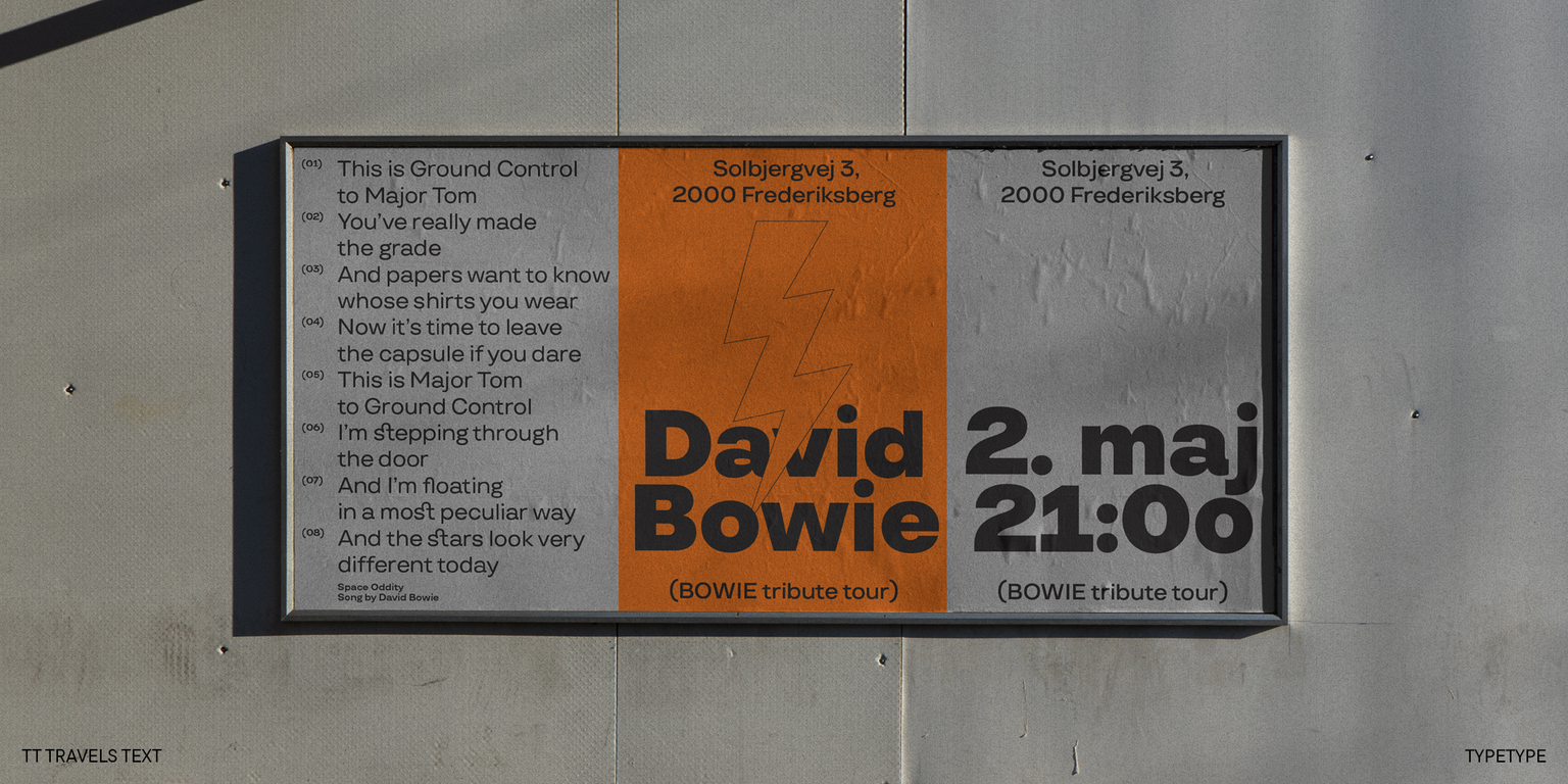 Dank der oben genannten visuellen Merkmale kann TT Travels Text sowohl im Fließtext als auch in der Markenidentität, im Web und im Druck eingesetzt werden — als eigenständiger grafischer Akzent. Die Schrift ist eine ideale, ausgewogene Ergänzung für Buch- und Zeitschriftenlayouts, Plakatgestaltung und Verpackungen. Aufgrund des neutralen Charakters der Schrift ist der Anwendungsbereich der TT Travels Text jedoch nahezu grenzenlos, und in Kombination mit der TT Travels Next entfaltet die Schrift ihr volles Potenzial.