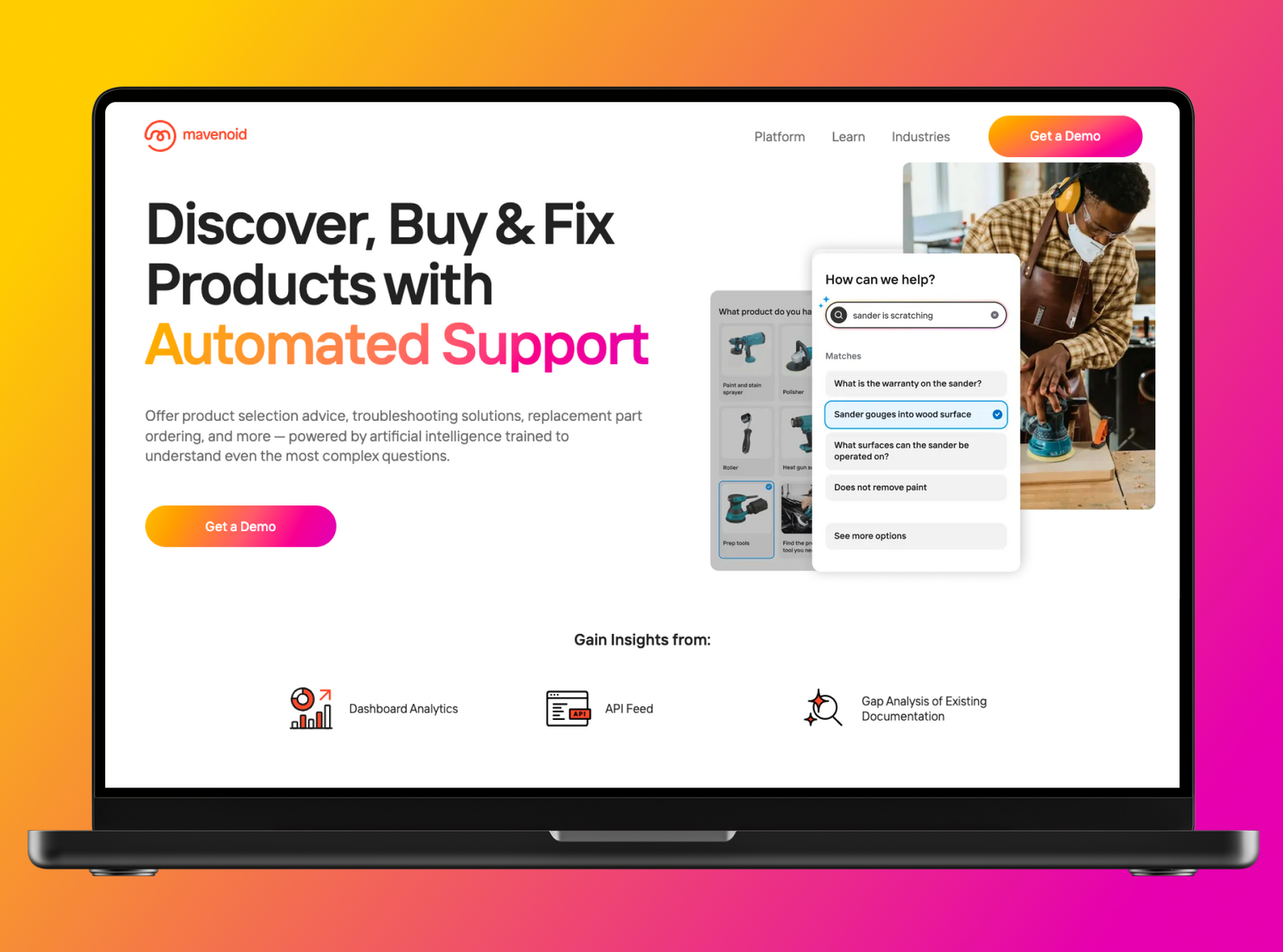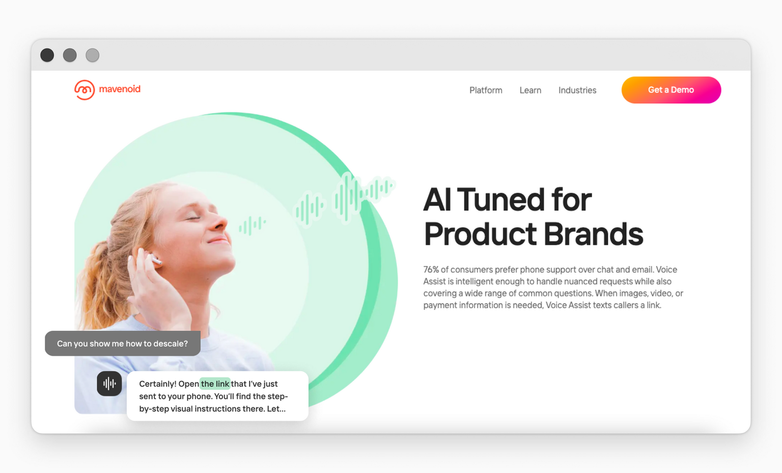 Mavenoid es una plataforma basada en inteligencia artificial que ayuda a los fabricantes a resolver problemas que ni los chatbots ni los centros de soporte tradicionales pueden abordar. Automatiza tareas que antes solo podían realizar personas, como la resolución de incidencias técnicas. Actualmente, Mavenoid es el servicio de soporte de productos número uno, colaborando con marcas de renombre mundial.