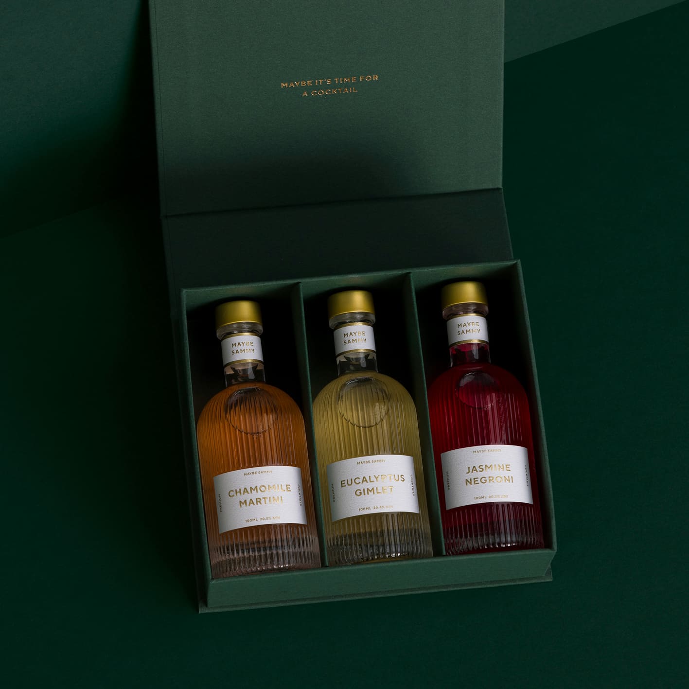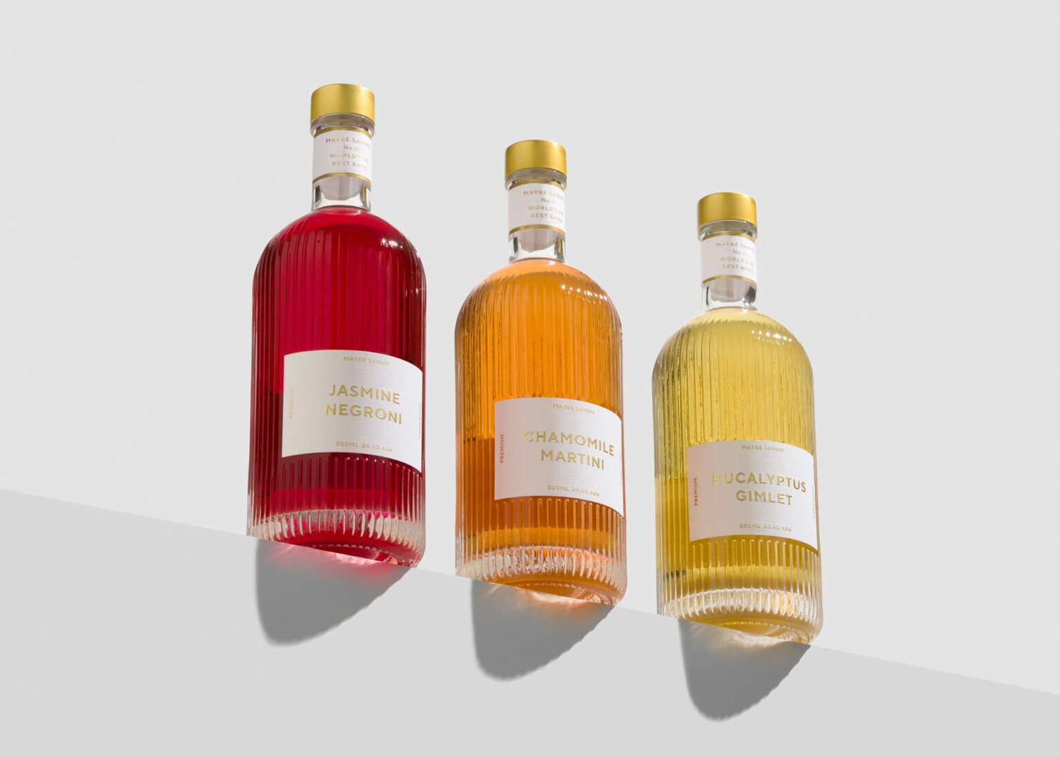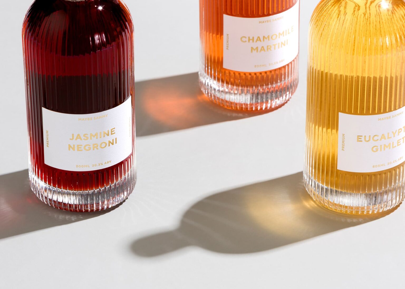 La Agencia The Bar Brand People se asoció con el galardonado bar de Sydney Maybe Sammy para diseñar el empaque de su gama de cócteles embotellados. Quizás los cocteleros de Sammy hayan perfeccionado el arte de preparar cócteles ya preparados y el diseño del empaque tenía que reflejar la naturaleza premium del producto. La serie presenta un trío de elegantes botellas de 500 ml con versiones en miniatura de cada cóctel.
