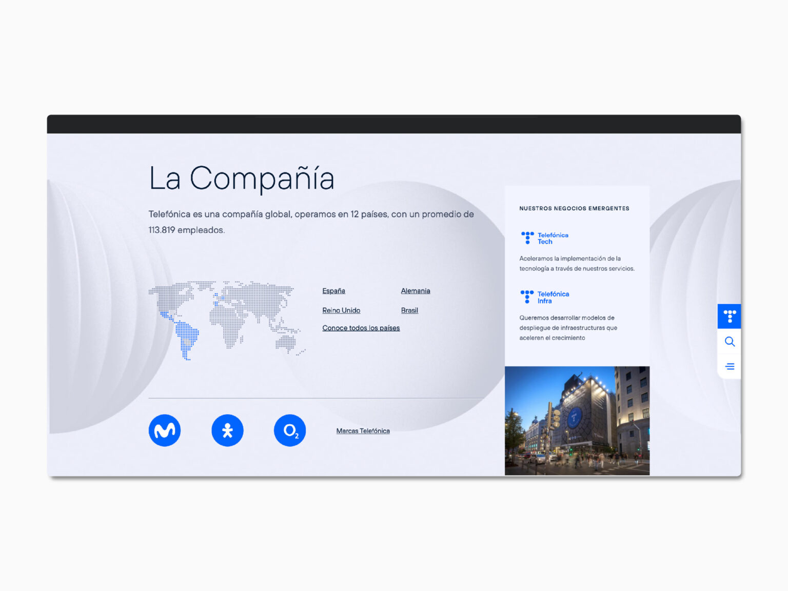 Uso de la tipografía TT Hoves en la web de Telefónica, empresa de telecomunicaciones española. Telefónica es una de las mayores empresas de comunicaciones del mundo, la cuarta del mundo por base de clientes y la sexta por capitalización bursátil.