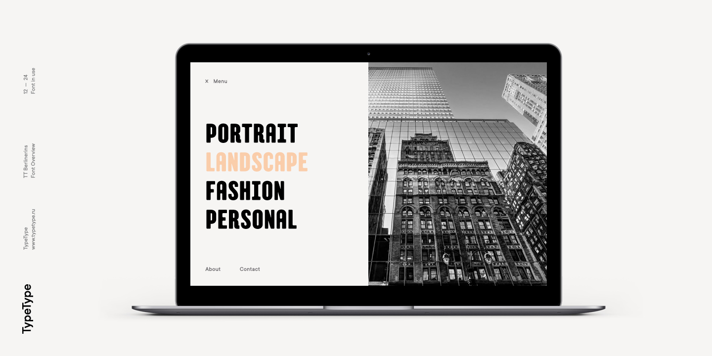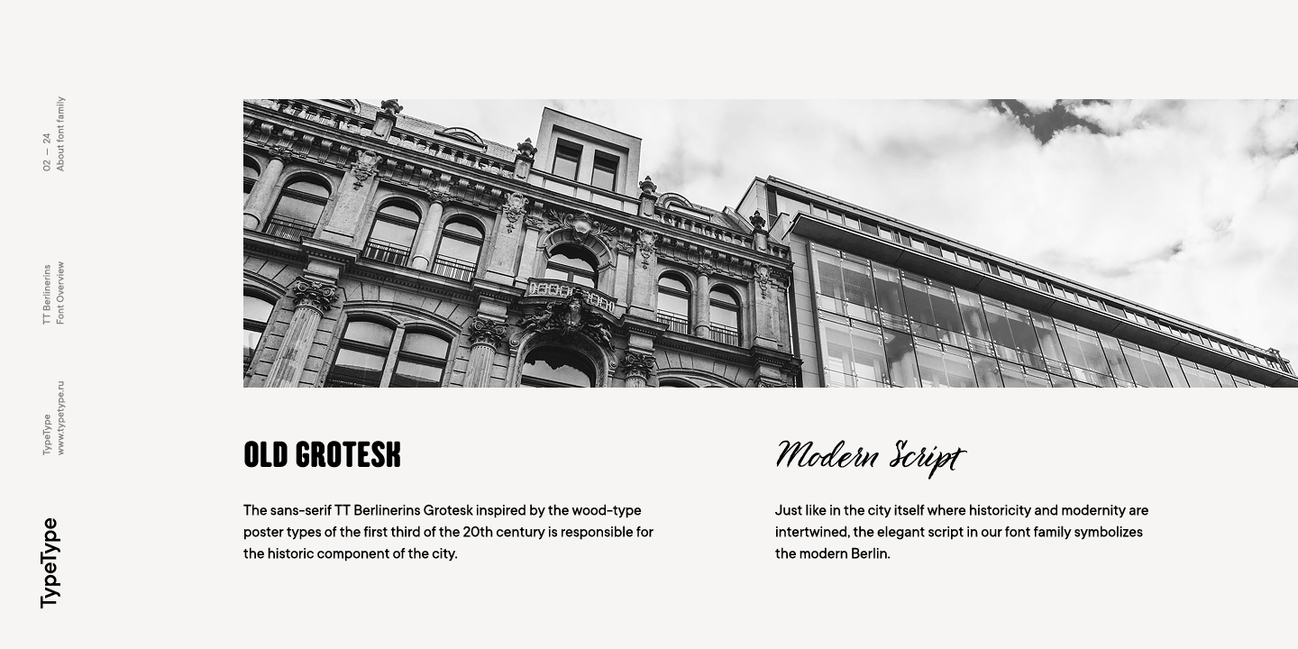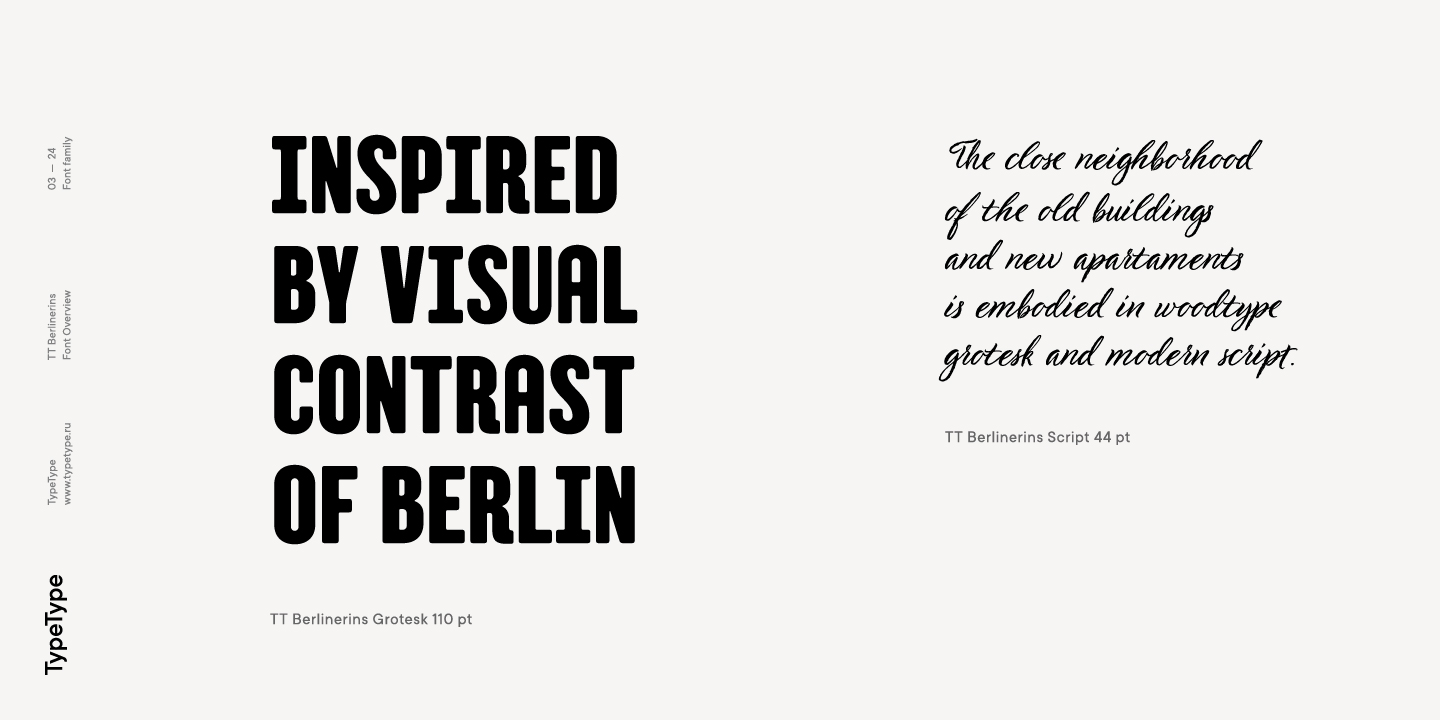 TT Berlinerins es un par de fuentes contrastantes que es esencialmente nuestro tributo a Berlín. Así como en la ciudad misma, la historicidad y la modernidad están entrelazadas, en nuestra familia tipográfica, la escritura elegante simboliza el Berlín moderno, y lo grotesco, hecho al estilo de las tipografías de madera tipo cartel del primer tercio del siglo XX, es responsable de el componente histórico de la ciudad.