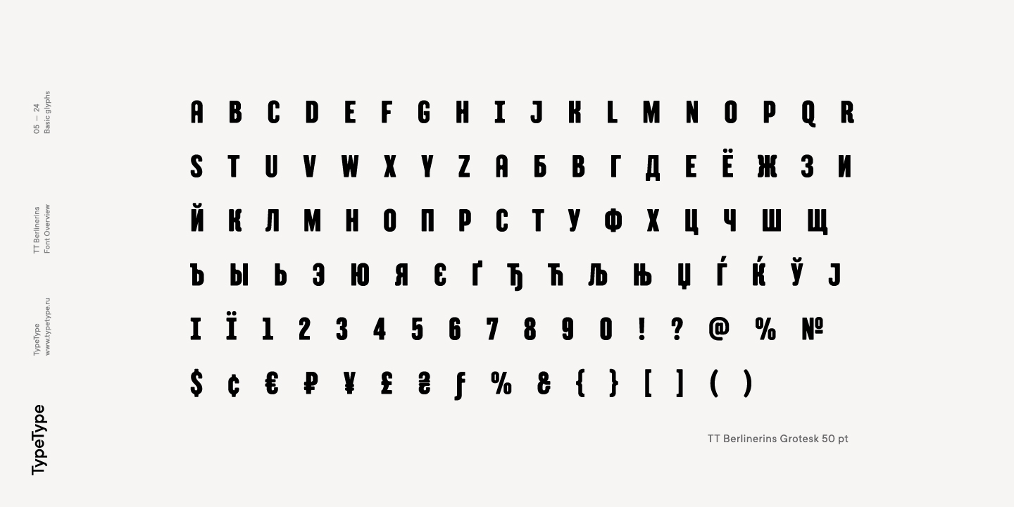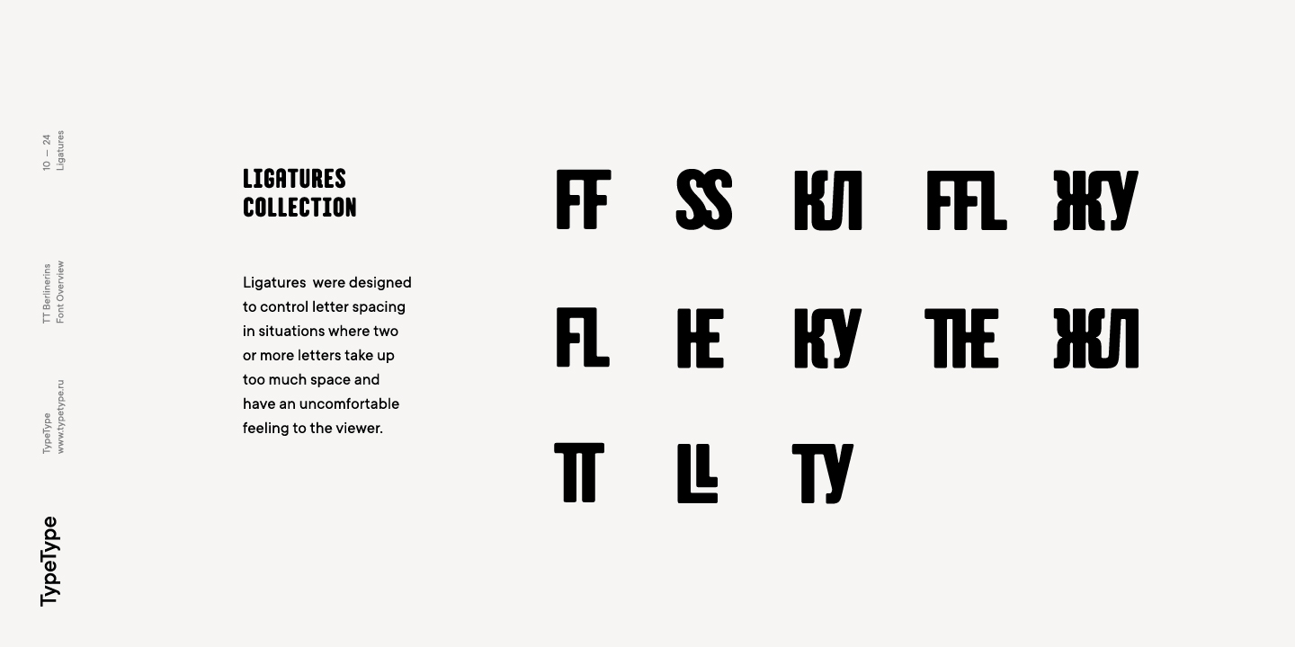 TT Berlinerins Grotesk contiene solo letras mayúsculas, incluye varias ligaduras decorativas, así como un amplio soporte para funciones OpenType: ordn, frac, sups, sinf, numr, dnom, tnum, pnum, liga, salt y dos conjuntos estilísticos ss01, ss02 para el signo comercial.