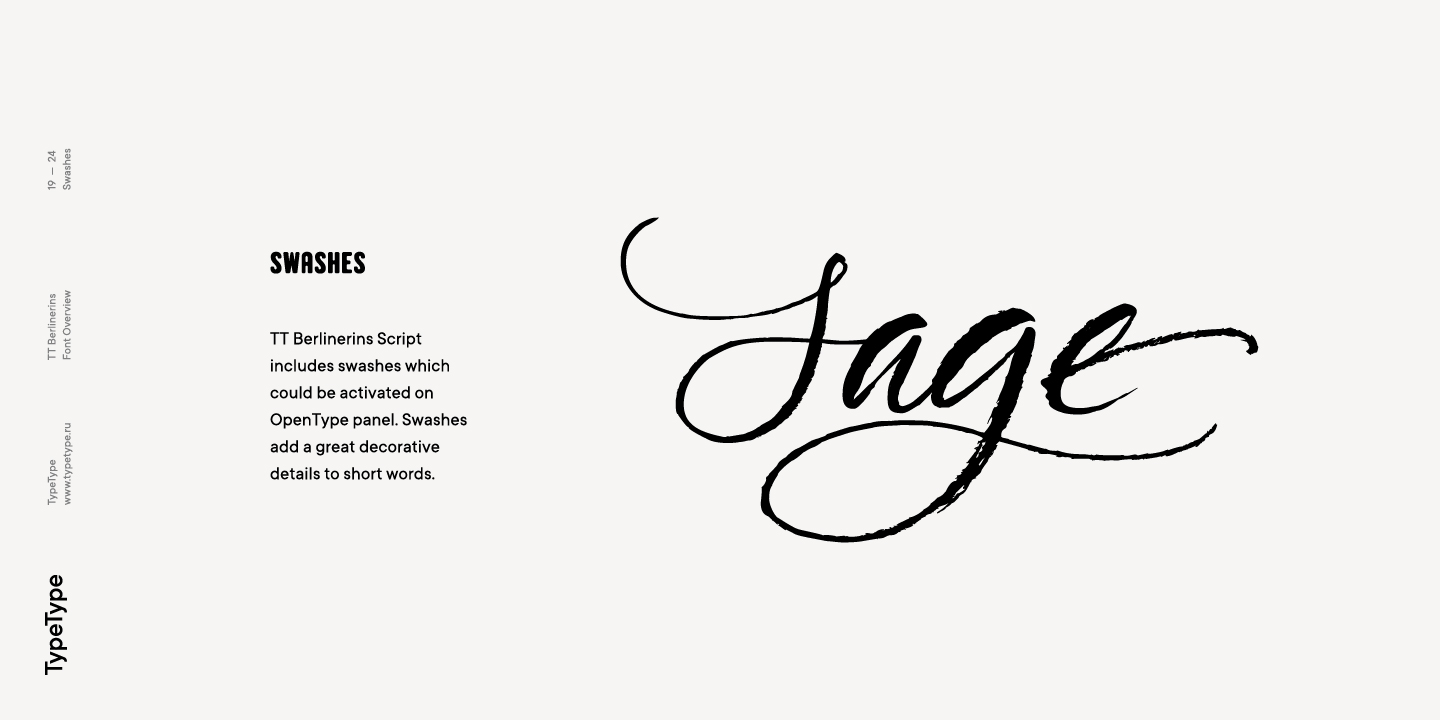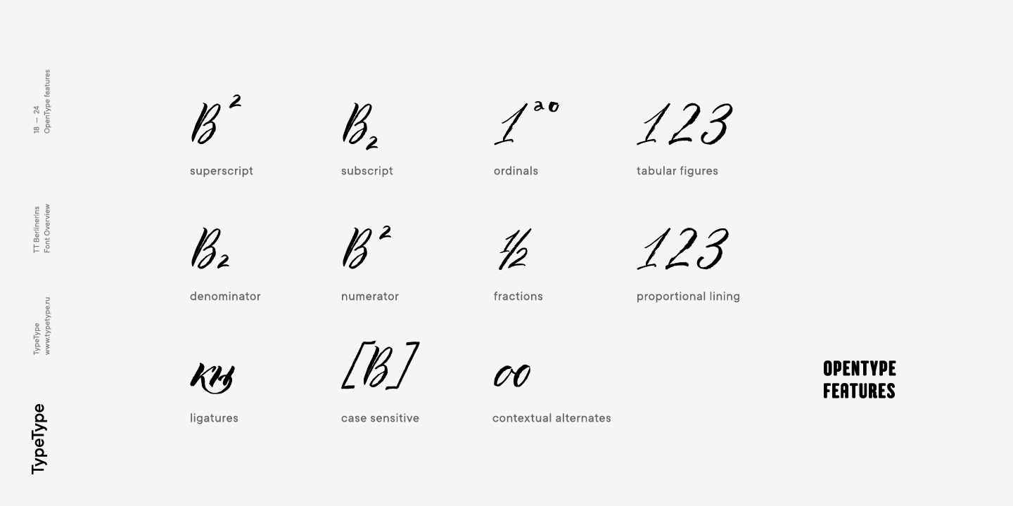 TT Berlinerins Script contiene 998 glifos, incluidos más de 240 trazos para los que hemos escrito una característica especial. En TT Berlinerins Script también dibujamos una gran cantidad de ligaduras e integramos un amplio soporte para funciones OpenType: ordn, frac, case, sups, sinf, numr, dnom, tnum, pnum, calt, liga.