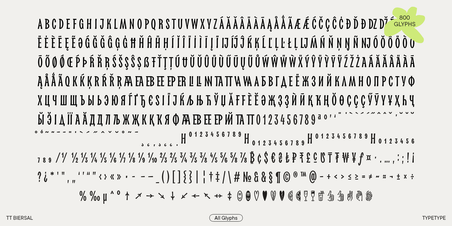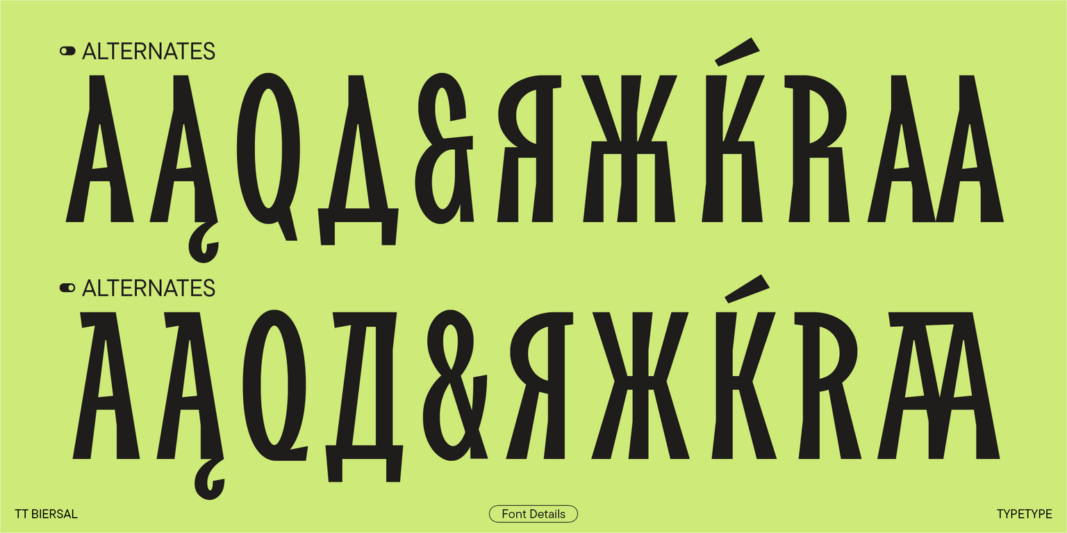 Los detalles característicos de TT Biersal son los cortes asimétricos en ángulo en carteles rectos y triangulares. Le dan a la fuente una sensación de estar hecho a mano: como si alguien recortara pedazos individuales de papel, vidrio o piedra y los ensamblara en un collage modular. Los cortes paralelos no estándar en los terminales de letras redondas dan dinamismo al diseño. En algunas letras, como «E», «P» y «B», se pueden ver pequeñas protuberancias, como si los trazos estuvieran ligeramente fuera de las raíces verticales al escribir con fluidez. Y los óvalos son ligeramente puntiagudos para estar en consonancia con los ángulos agudos de los signos verticales.