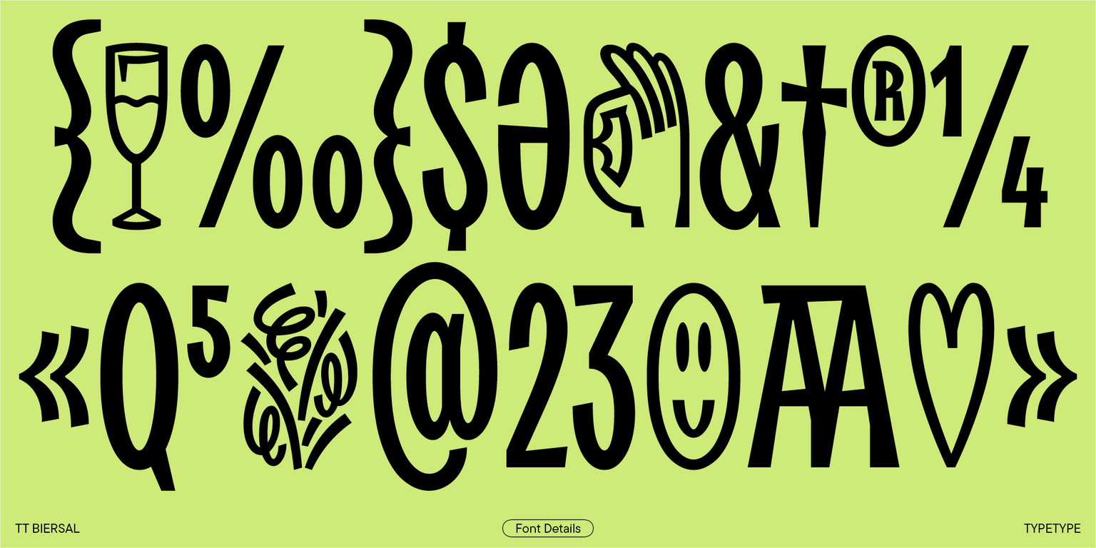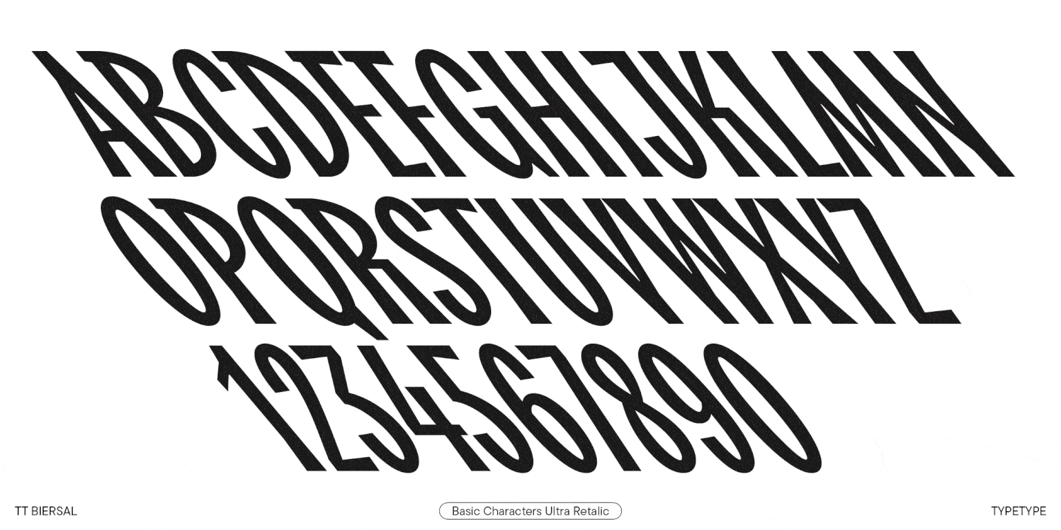 TT Biersal es un espectáculo grotesco con un carácter libre, travieso y aventurero. El punto de partida para su creación fue un cartel alemán de principios de los años 30. Queríamos preservar no sólo las proporciones, sino también la sensación de descuido y vivacidad de las letras de la referencia. El resultado es una fuente rica y densa con proporciones estrechas y formas asimétricas.