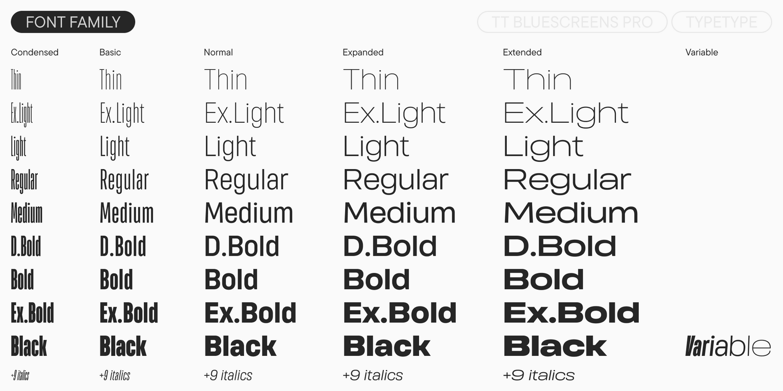 - 5 subfamilias: Condensed, Normal, Expanded, Extended y la base TT Bluescreens Pro