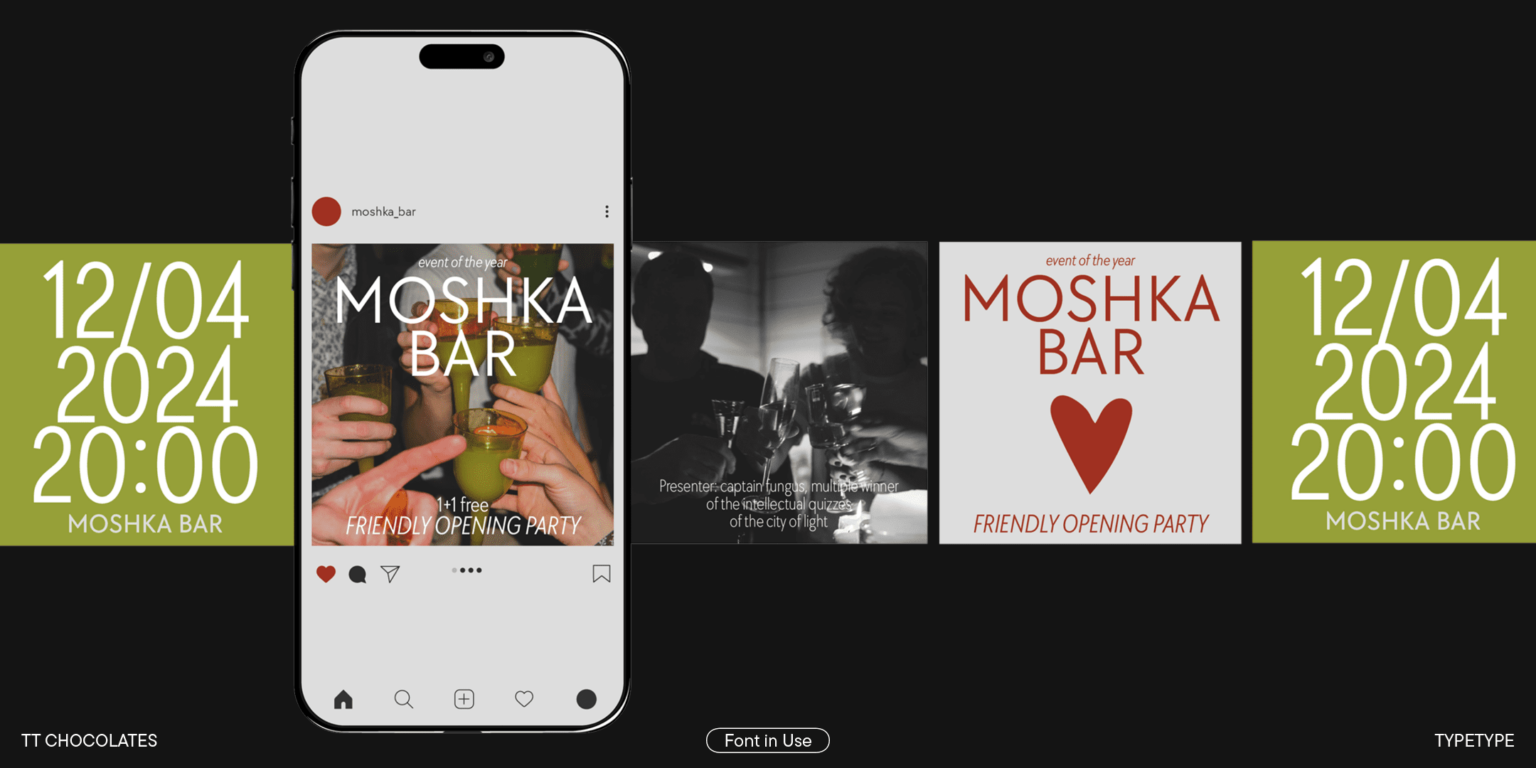 TT Chocolates es un elegante grotesco humanista con un conjunto denso y proporciones equilibradas cercanas a las clásicas. Se trata de una fuente con un carácter agradable y amigable que intuitivamente se percibe como algo familiar. Entre los diseñadores, se ha consolidado como una fuente ideal para productos de confitería, ¡pero el ámbito de aplicación de la tipografía más dulce de TypeType no se limita a esto!