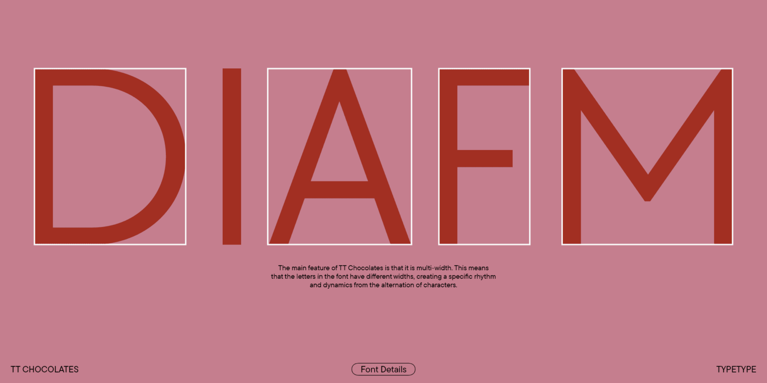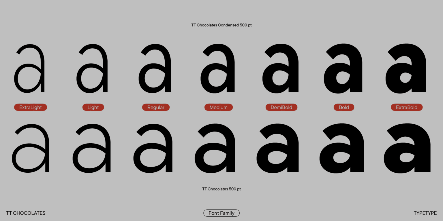 En particular, agregamos la versión condensada, un tipo de letra estrecho que conserva las proporciones auténticas de la versión estándar. Al mismo tiempo, TT Chocolates Condensed tiene un carácter más visual que la subfamilia principal, lo que le permite resolver aún más problemas de diseño utilizando un tipo de letra.