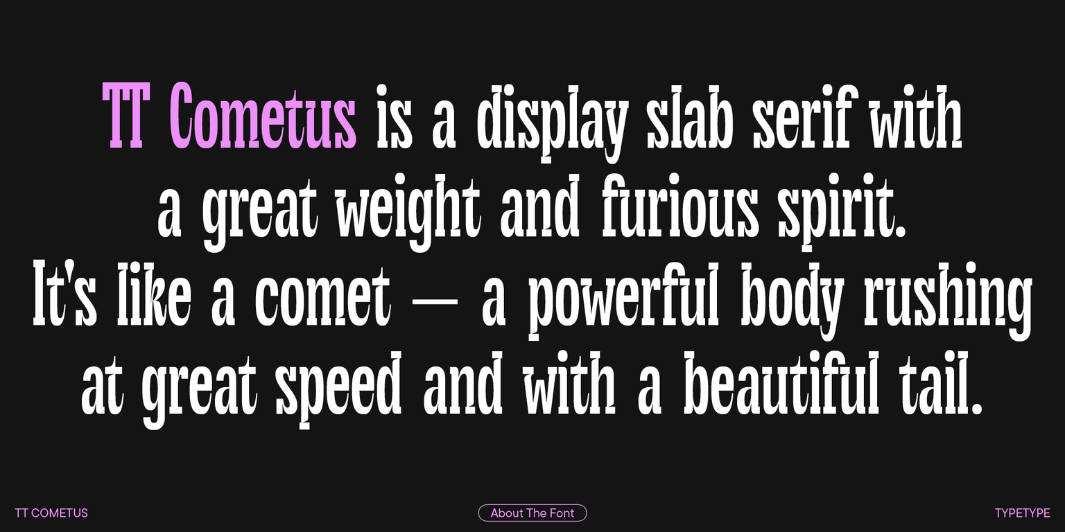 TT Cometus is a modern slab serif. The typeface’s name evokes the image of a comet—a powerful and weighty celestial body with a beautiful tail slicing through space at an incredible speed. This is the key to understanding this font.