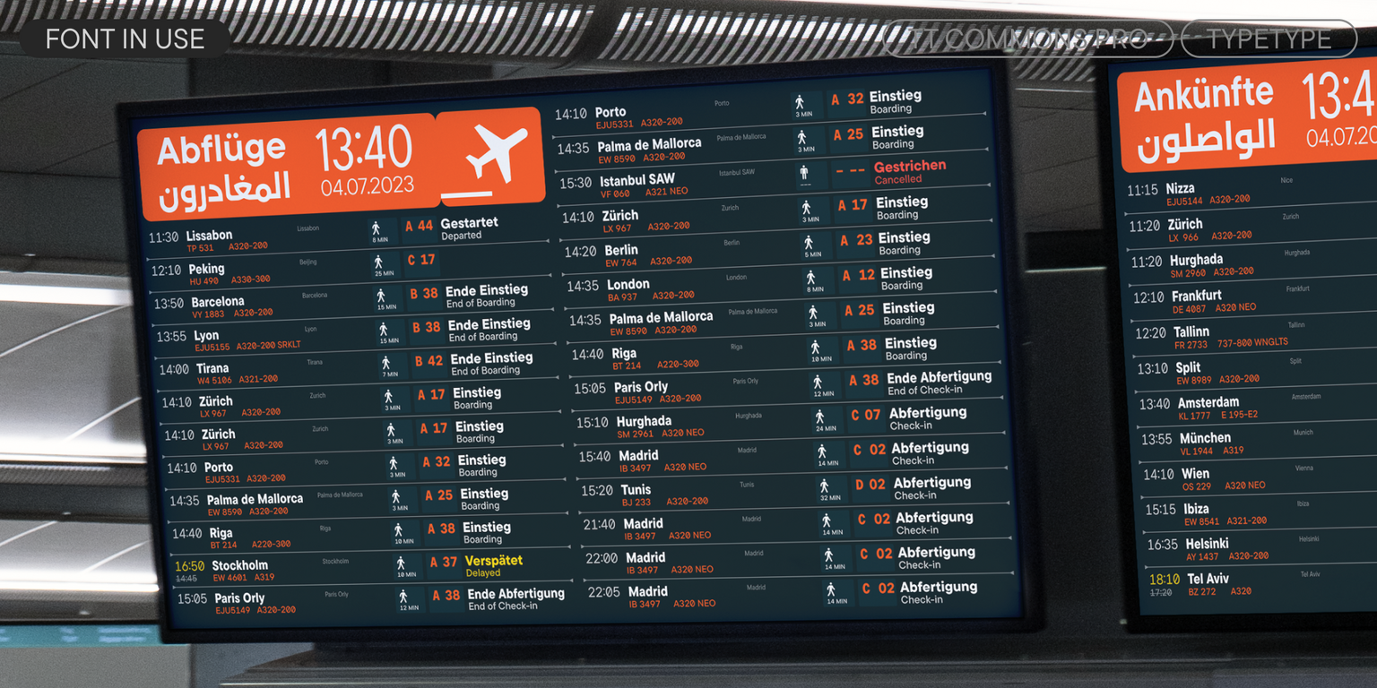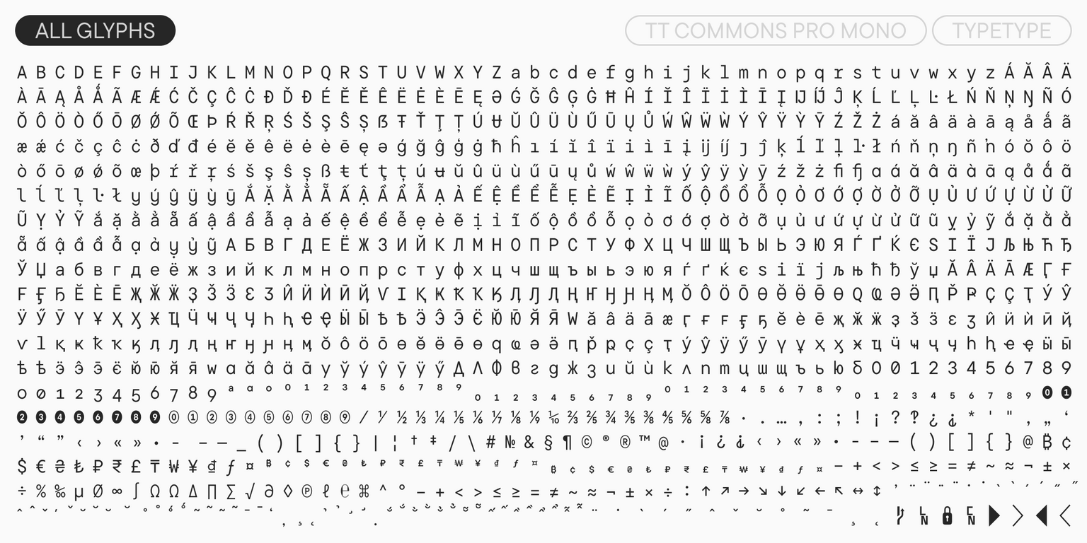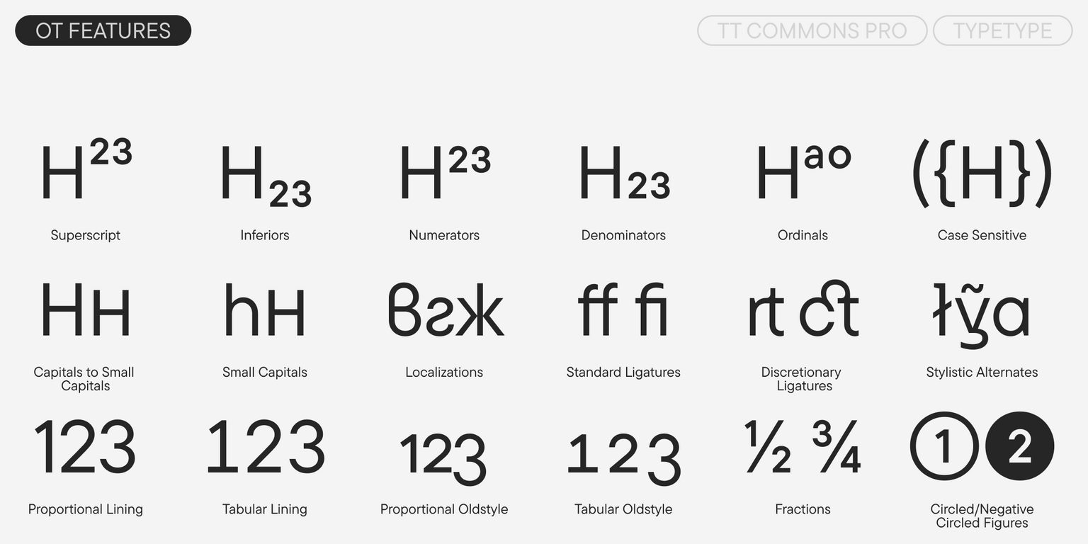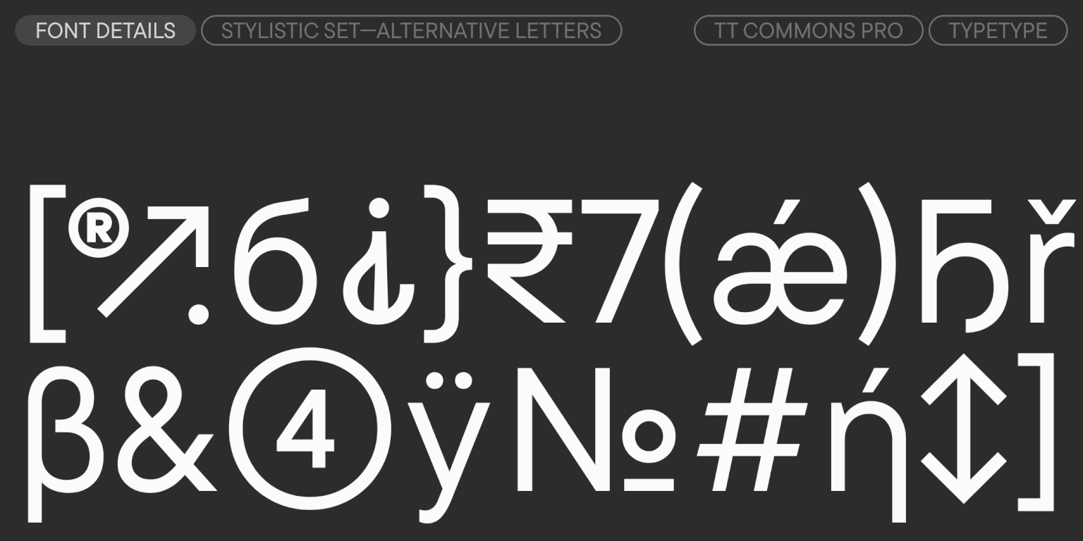 TT Commons™ Pro es una sans serif geométrica. Es una de las fuentes más demandadas del estudio, reconocida por su carácter versátil, su extenso conjunto de caracteres con soporte para una enorme cantidad de idiomas y su completo conjunto de funciones OpenType.