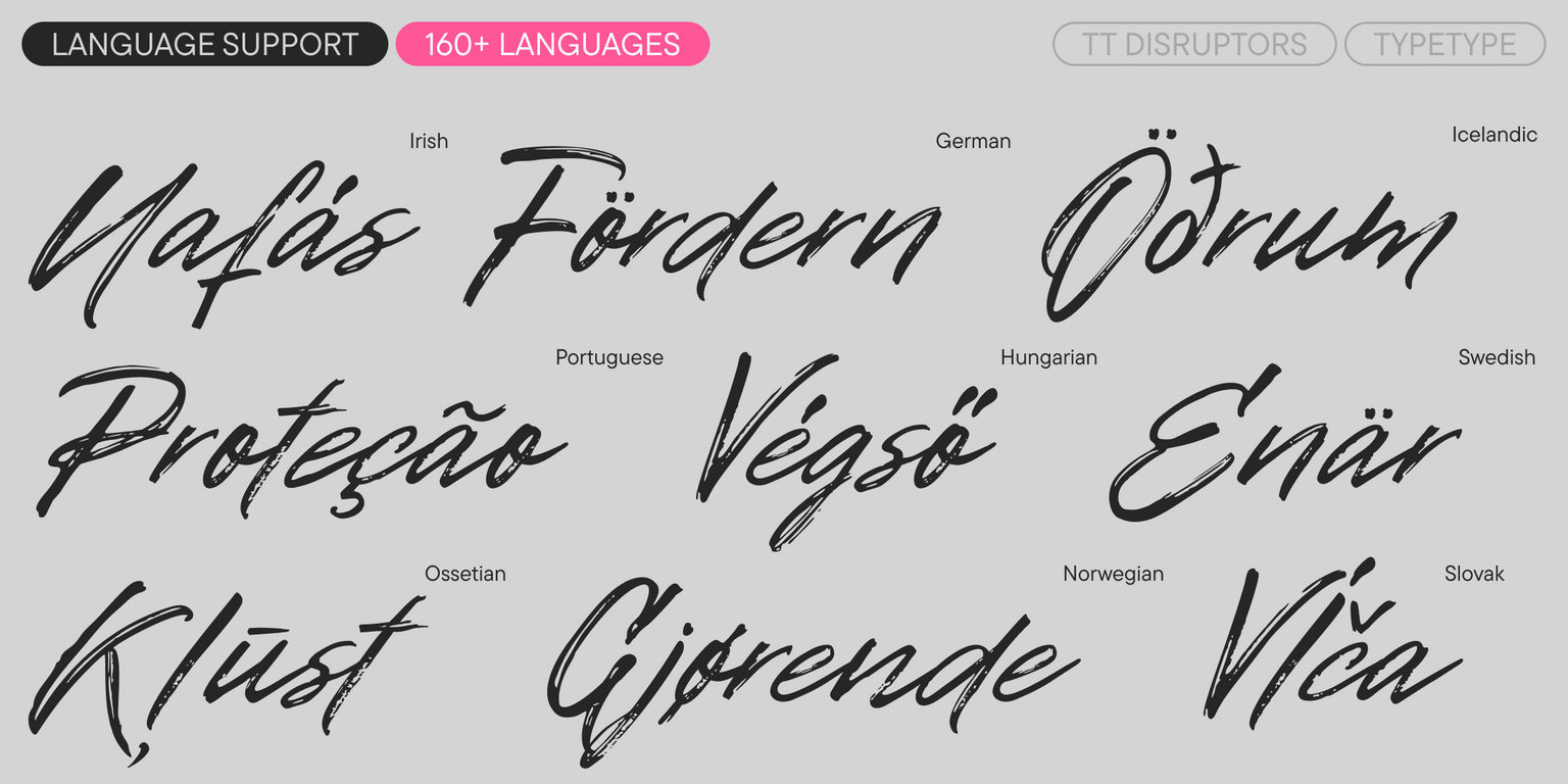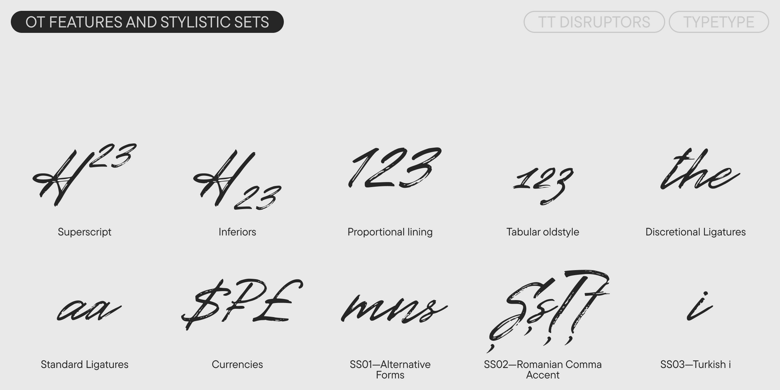 Además, TT Disruptors incluye ligaduras funcionales para las combinaciones más comunes de dos y tres letras, lo que aporta variedad al texto, rompe la monotonía de la composición y añade un toque de sorpresa. Para un impacto visual máximo, recomendamos activar siempre las funciones de alternativas contextuales (calt) y ligaduras estándar (liga).