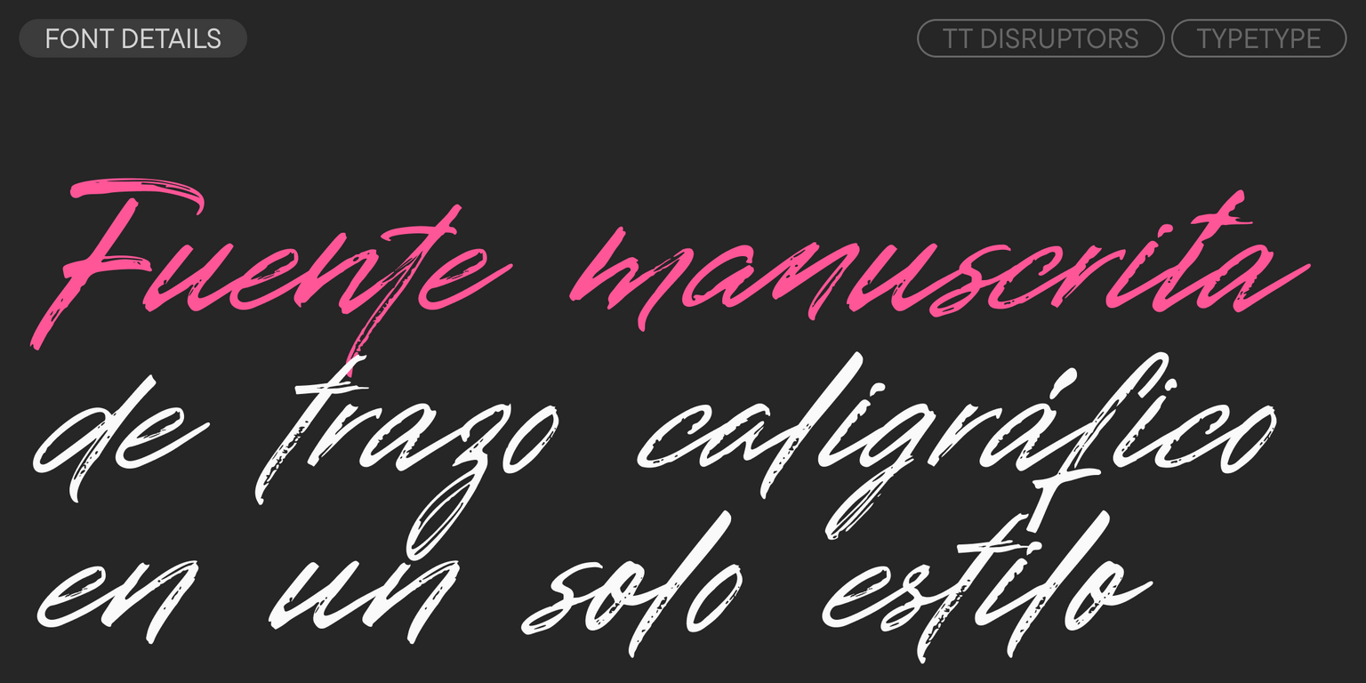 TT Disruptors es una tipografía manuscrita dibujada con rotulador, dúctil y expresiva. Su diseño es único: bordes desgastados, trazos de grosor variable y ascendentes y descendentes alargados le otorgan una textura dinámica y artesanal. La personalidad de esta fuente es enérgica y emocional, pero también cálida y con alma.