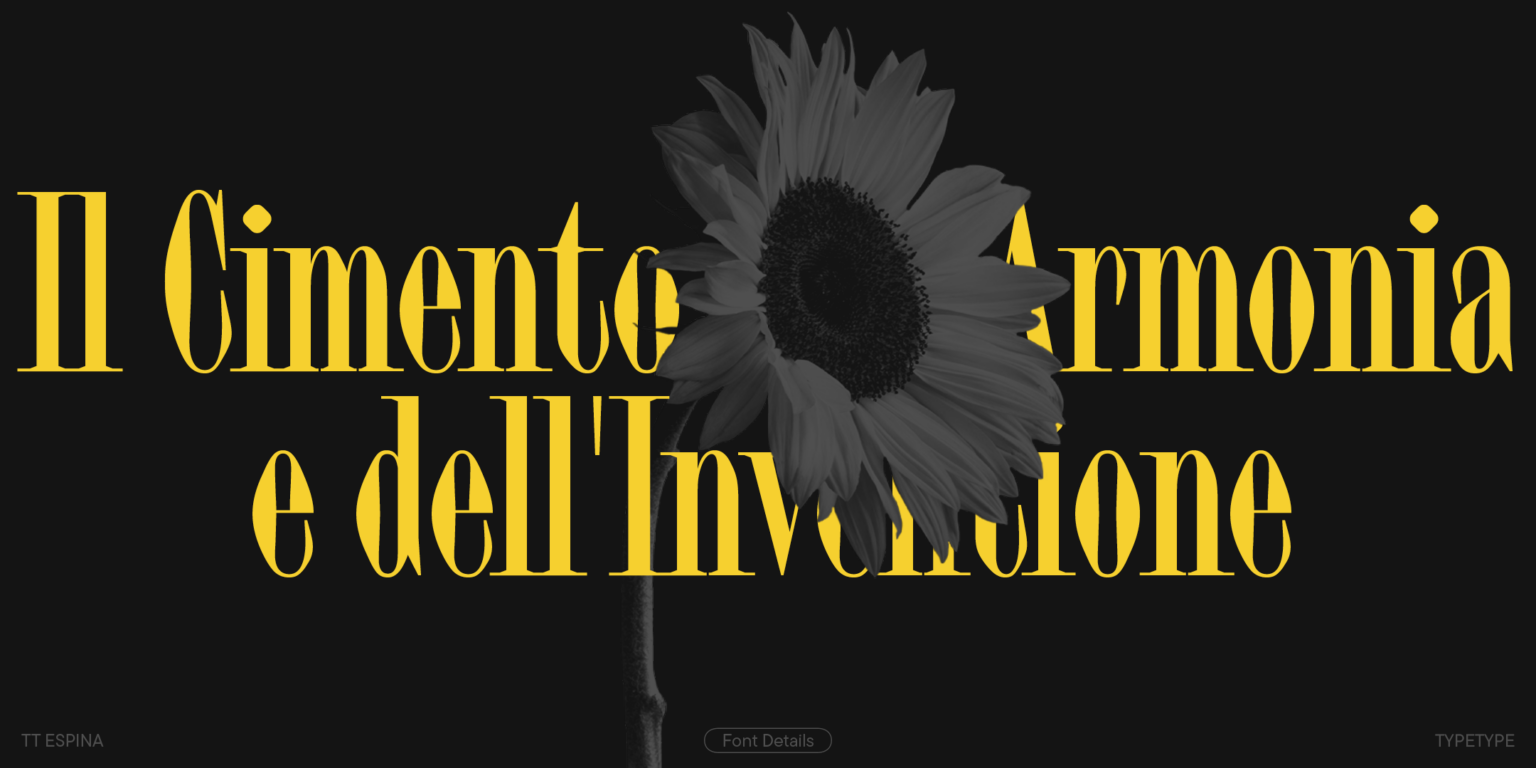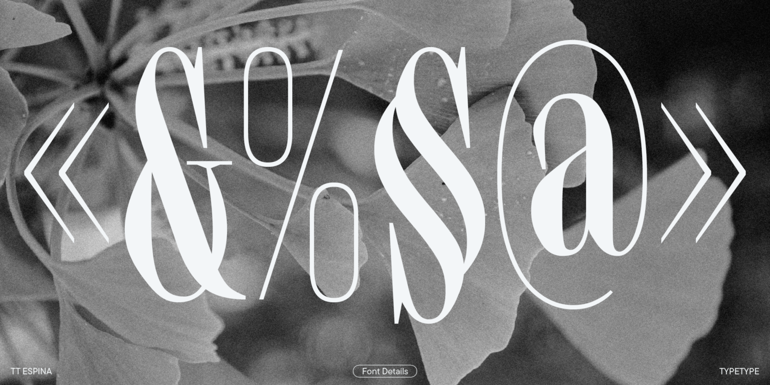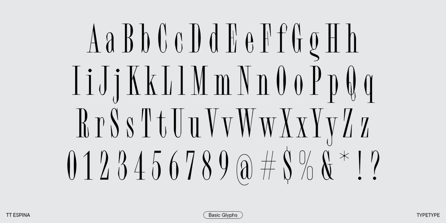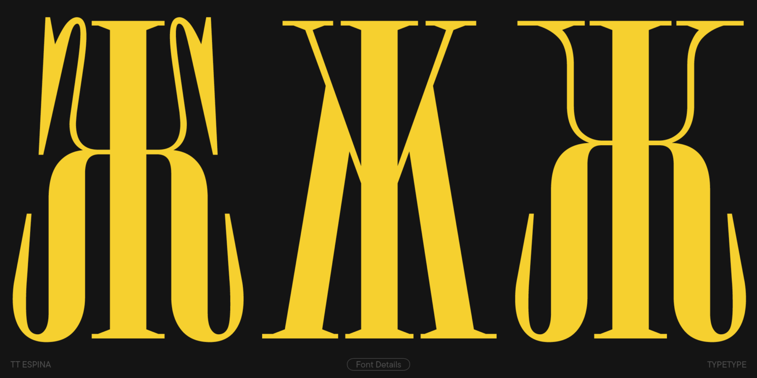 TT Espina es una serifa de exhibición con serifas expresivas. Al crearlo, los diseñadores se inspiraron en la forma histórica de la letra «O», que adoptó la forma de un diamante debido a la calidad de la impresión. El resultado es una tipografía moderna con un alto contraste entre horizontales y verticales.